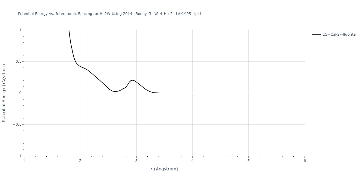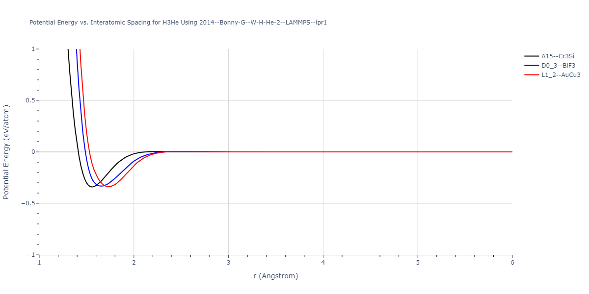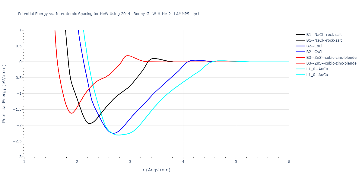 Plots of potential energy vs interatomic spacing, r, are shown below for a number of crystal structures. The structures are generated based on the ideal atomic positions and b/a and c/a lattice parameter ratios for a given crystal prototype. The size of the system is then uniformly scaled, and the energy calculated without relaxing the system. To obtain these plots, values of r are evaluated every 0.02 Å up to 6 Å.