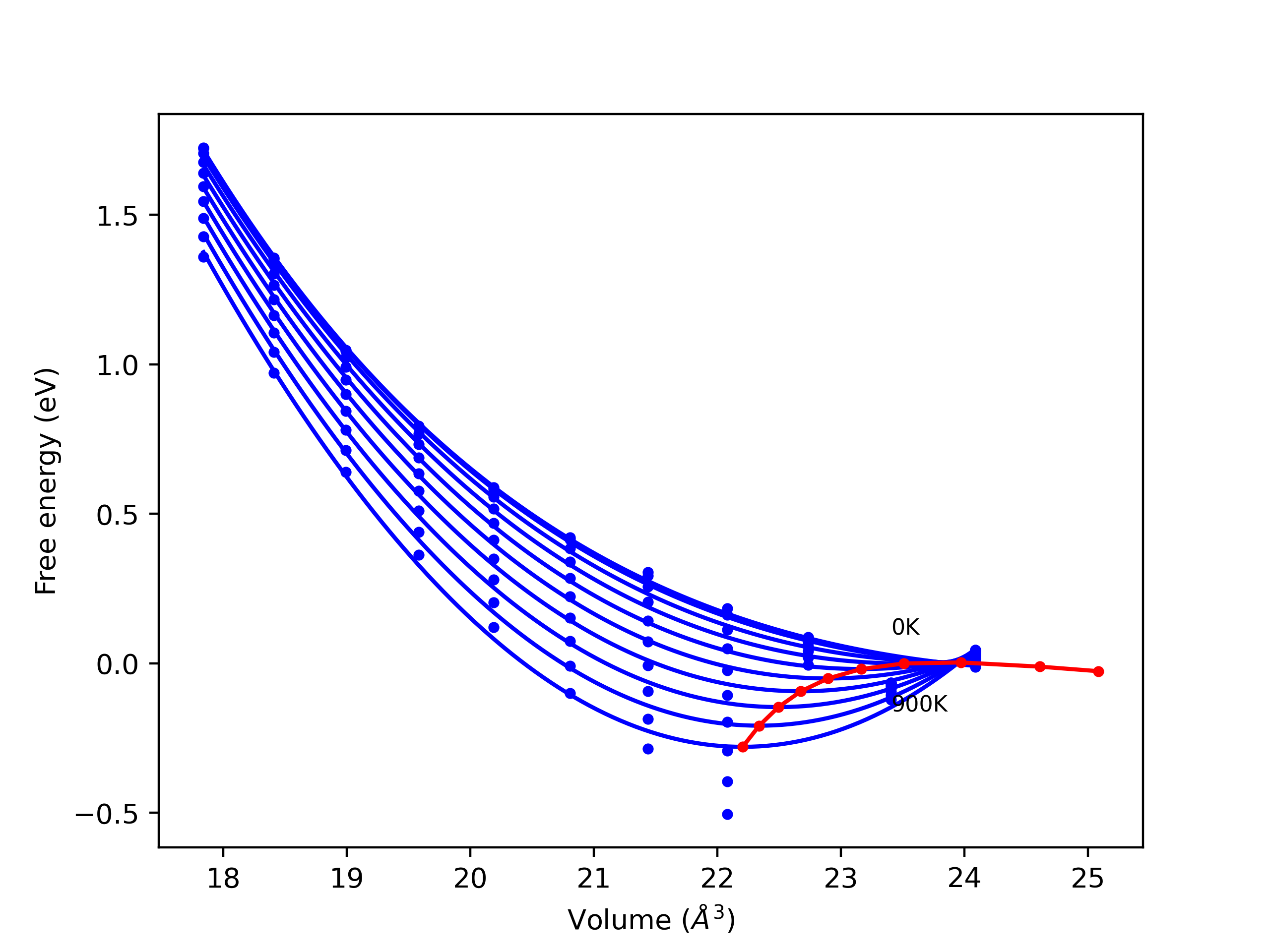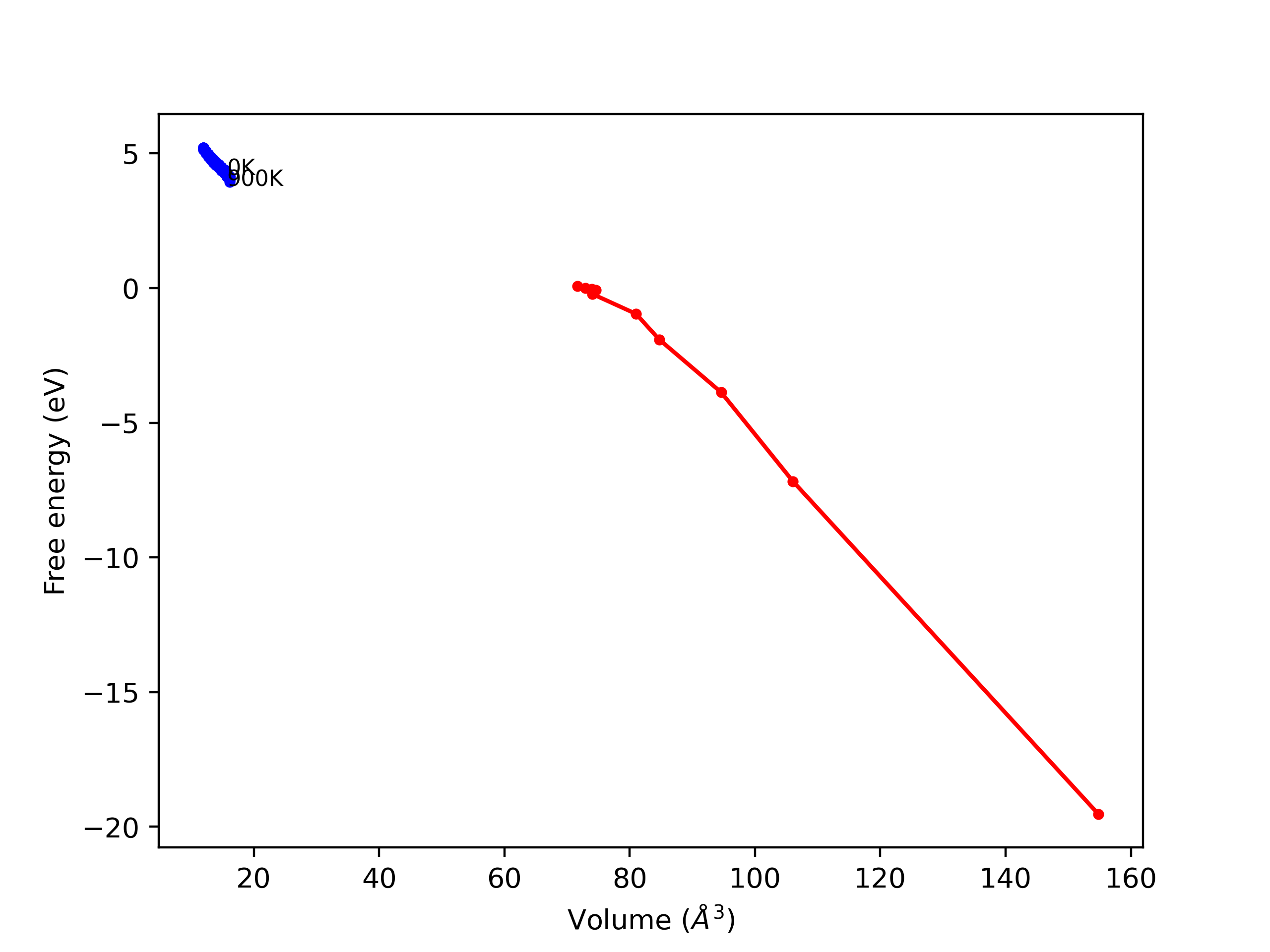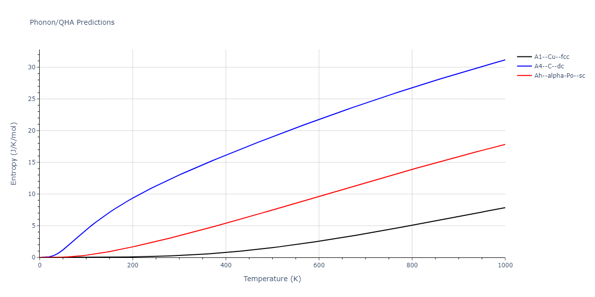 The Gibbs energies of the phases are estimated using thermodynamic integration between the interatomic potential in question and a simpler model with known Gibbs free energy values. For solids, the reference model is an Einstein solid, while for liquids it is the Uhlenbeck-Ford potential. Besides a short run at the start of the solid calculations to estimate Einstein model spring constants, the two calculations proceed similarly. Starting with the final relaxation configurations, the systems are stabilized for 25,000 steps. Then, over the next 50,000 steps the potential is swapped out for the reference potential. The system is then stabilized for another 25,000 steps with the reference model before a reverse swap of 50,000 steps is performed. The simulation ends with one final 25,000 step stabilization period. From the simulation, the irreversible work of transformation is estimated and used to compute the absolute Gibbs free energy of the target phase and potential relative to the reference potential. Entropy is estimated as the difference in enthalpy and Gibbs free energy and divided by temperature.