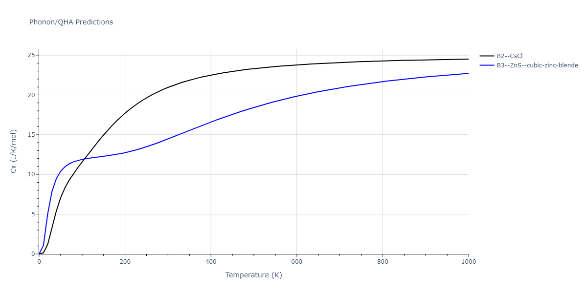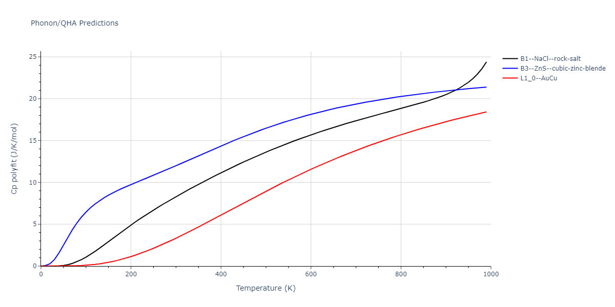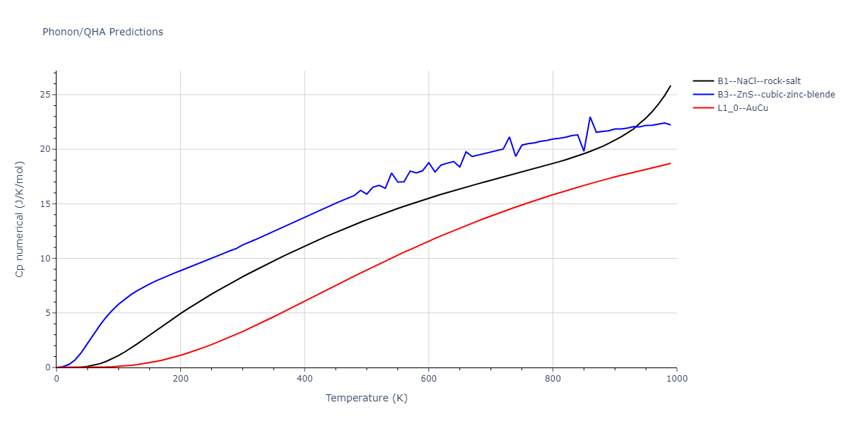 Plots of internal energy, Gibbs free energy, entropy, heat capacity and volume are shown here as a function of temperature for various crystal structures and liquid phases. The included crystal structures correspond to those in the Solid Structures vs. Temperature section, and the liquid phases to those in the Liquid Properties section. Internal energy and volume are taken from the associated structure relaxations mentioned in those previous sections. Constant pressure heat capacity is estimated using 3-point numerical derivatives of enthalpy versus temperature. Note that since all simulations done here are at 0 pressure, internal energy and enthalpy are equivalent.