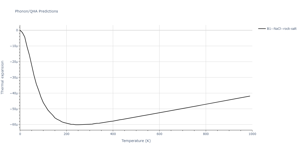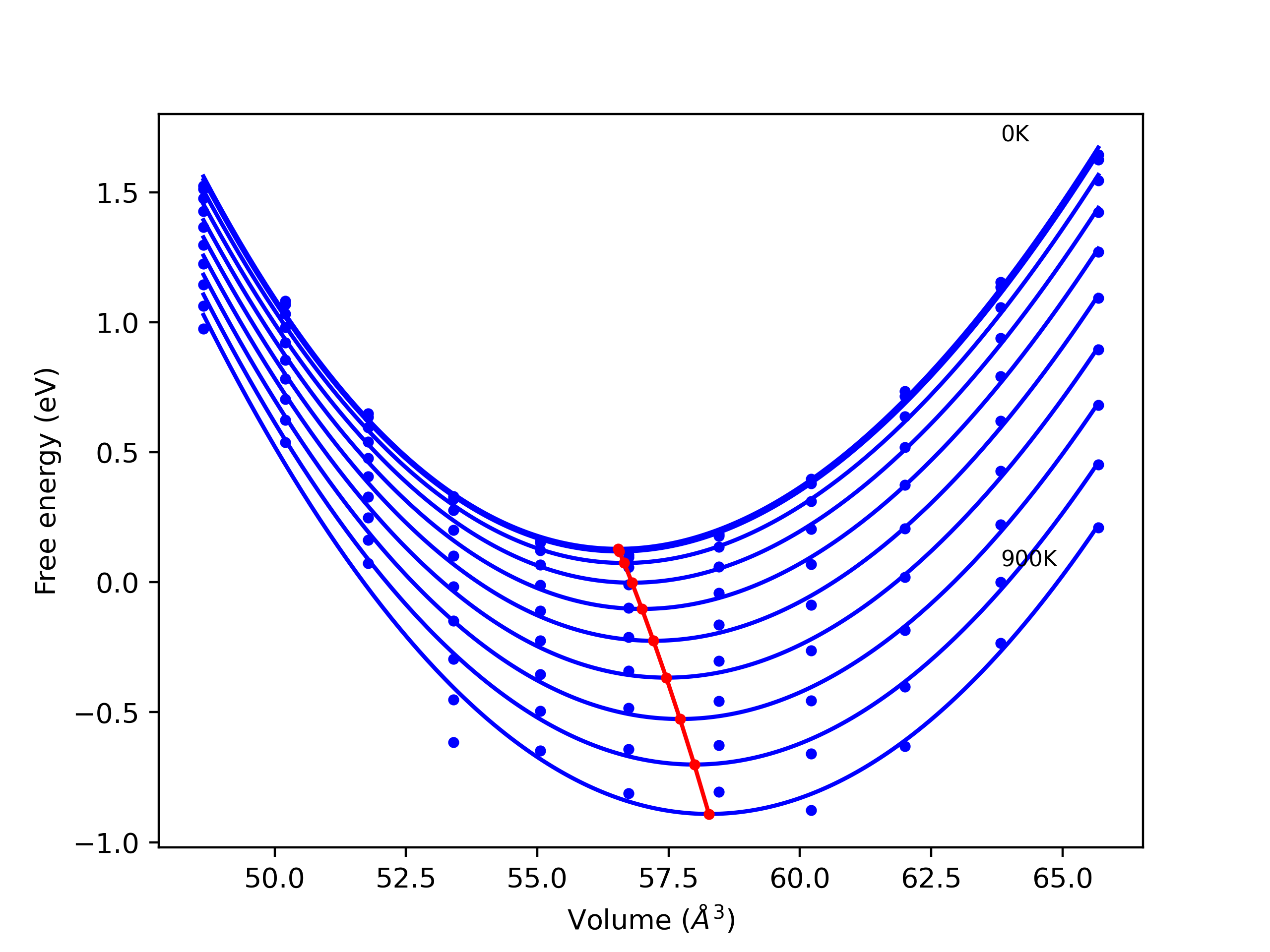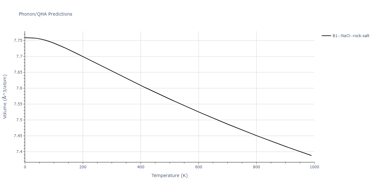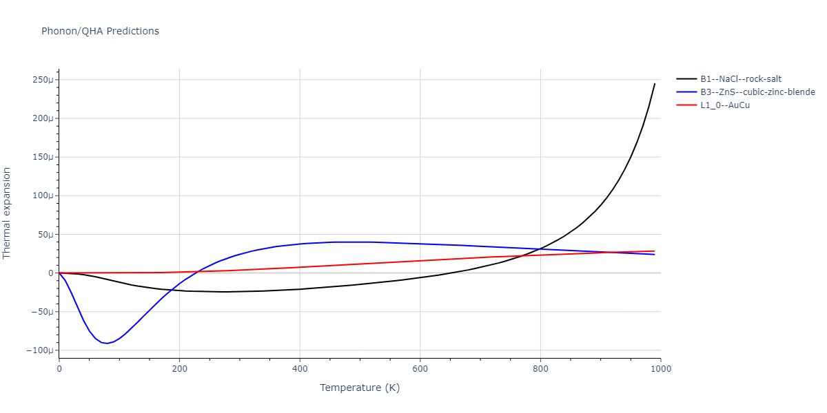 Plots of lattice and elastic constants are shown as a function of temperature. The 0K points were taken from the Crystal Structure Predictions and the Elastic Constants Predictions sections above for the unique crystal structures relaxed with the "dynamic" method. Starting from the 0 K relaxed crystal unit cells, supercell systems are created by replicating all three dimensions by the same multiplier to achieve at least 4000 atoms. The systems are then relaxed at 50 K and zero pressure using 1 million NPT steps. Lattice constants are estimated by averaging the measured box dimensions. Temperatures are iteratively increased by 50 K, with each subsequent relaxation calculation starting from the final atomic configuration at the previous temperature and relaxing for another 1 million steps.