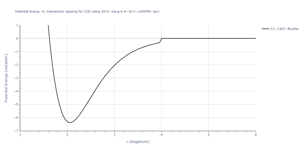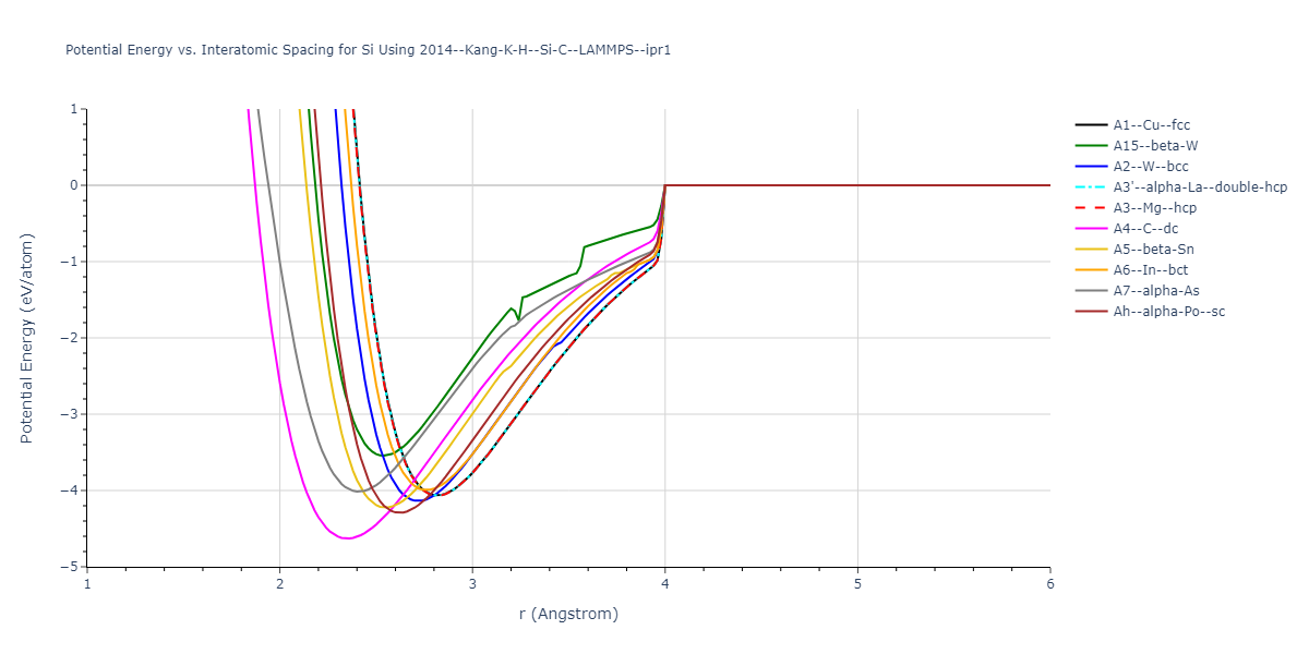 Plots of potential energy vs interatomic spacing, r, are shown below for a number of crystal structures. The structures are generated based on the ideal atomic positions and b/a and c/a lattice parameter ratios for a given crystal prototype. The size of the system is then uniformly scaled, and the energy calculated without relaxing the system. To obtain these plots, values of r are evaluated every 0.02 Å up to 6 Å.