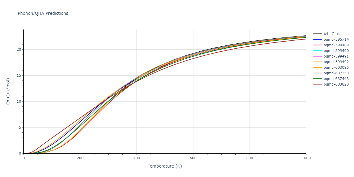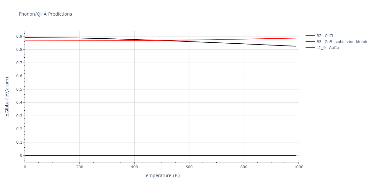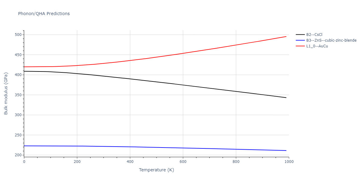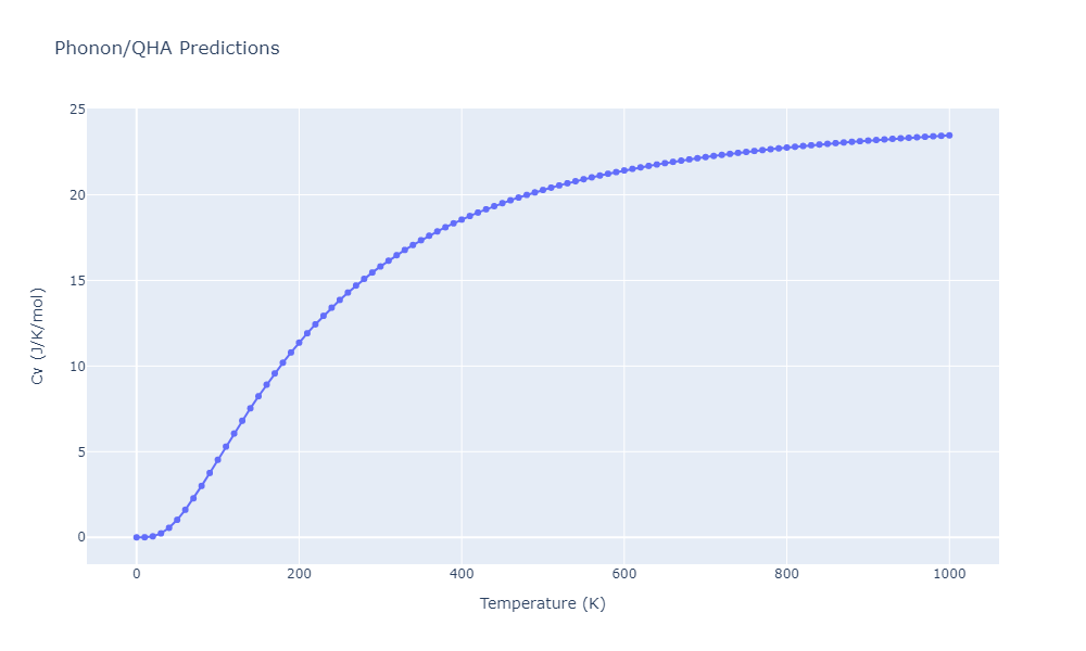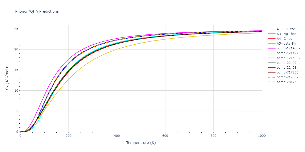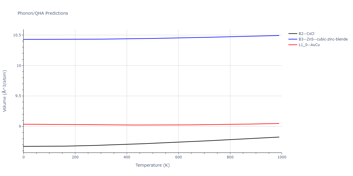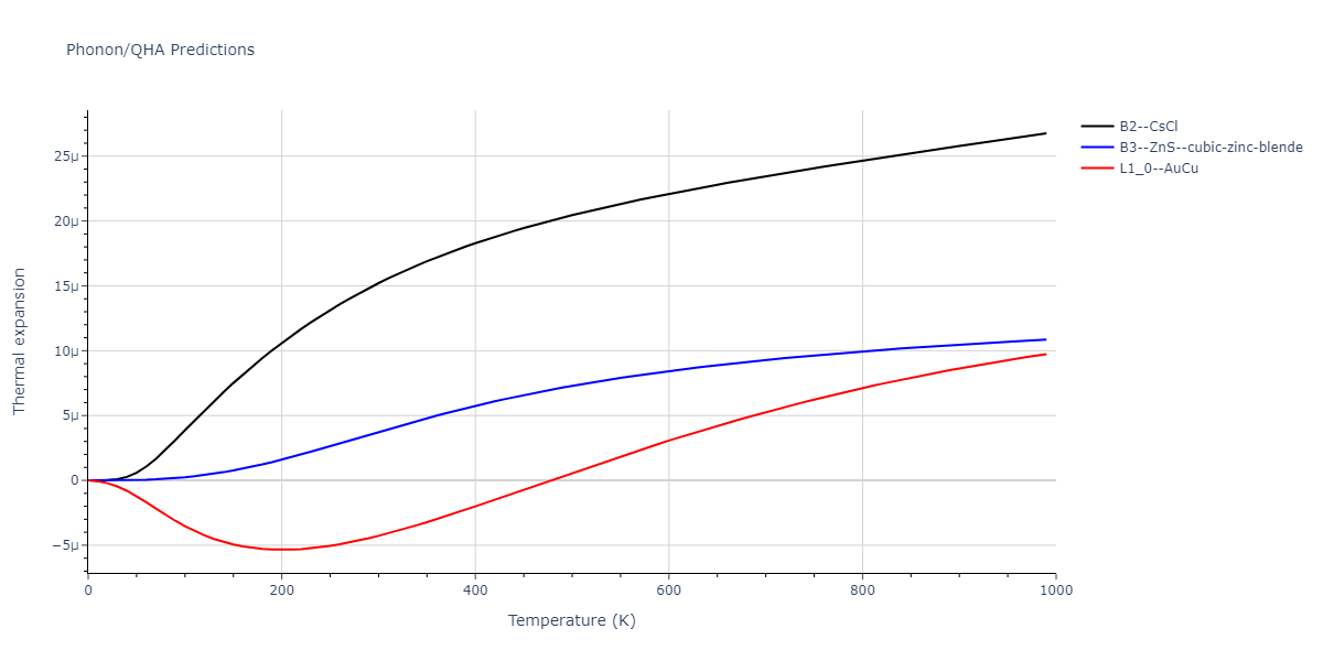 Phonon band structures and crystal properties estimated from quasi-harmonic approximation (QHA) calculations are displayed for select crystals. The calculations were performed using phonopy and LAMMPS. For the phonon calculations, 3x3 supercells of the potential-specific relaxed crystals were used. The QHA calculations were based on 11 strain states ranging from -0.05 to 0.05.
