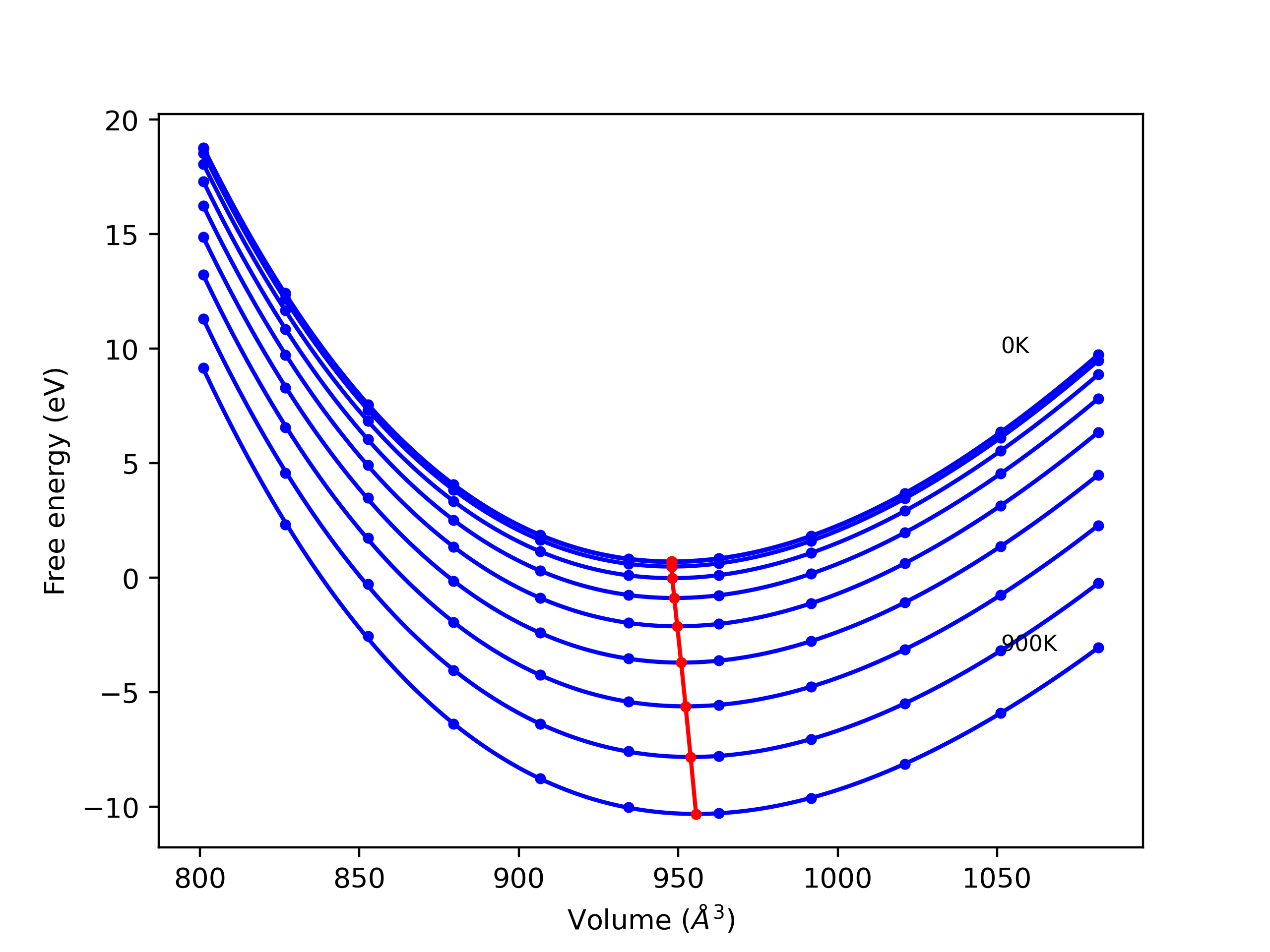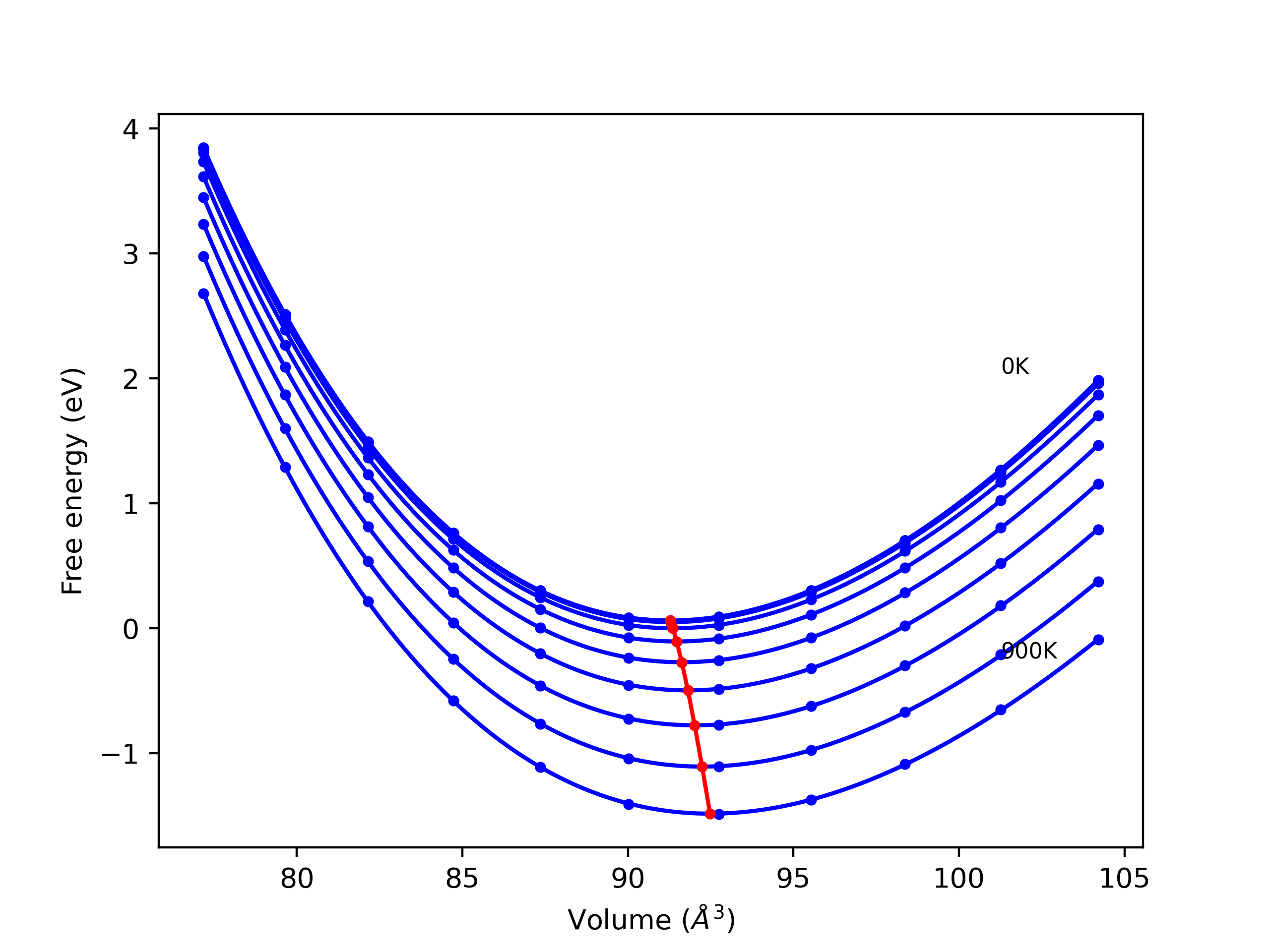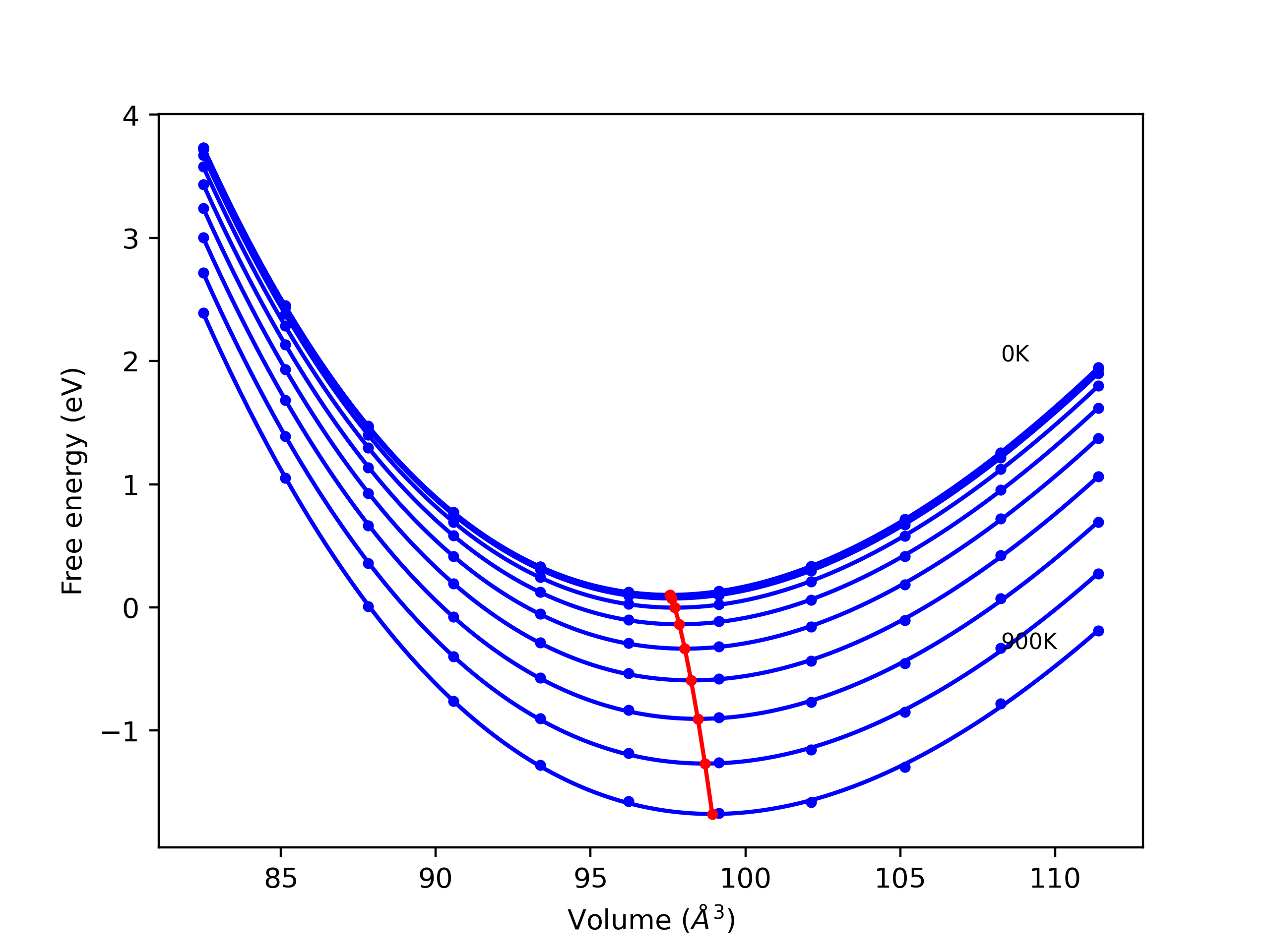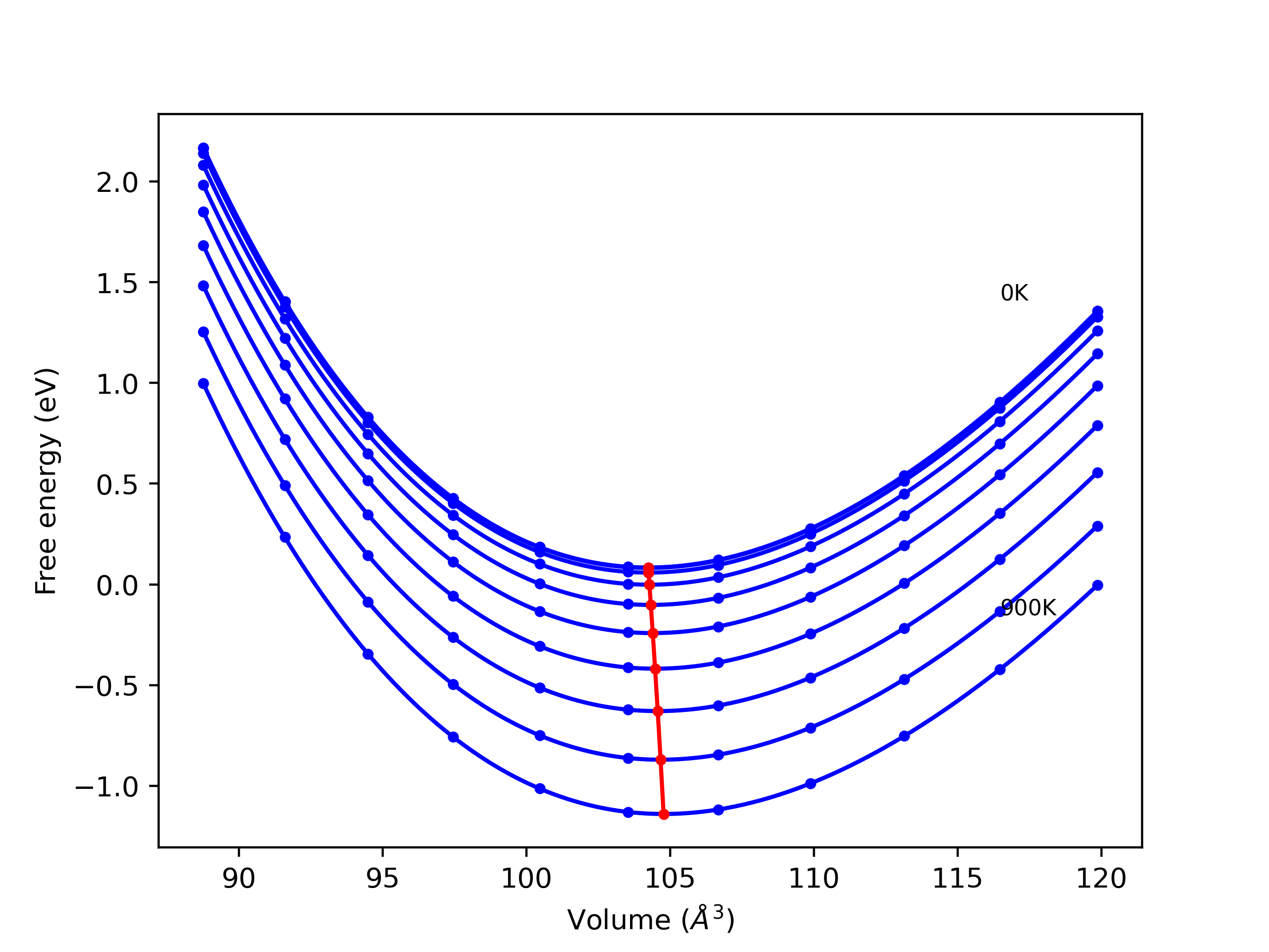 Plots of internal energy, Gibbs free energy, entropy, heat capacity and volume are shown here as a function of temperature for various crystal structures and liquid phases. The included crystal structures correspond to those in the Solid Structures vs. Temperature section, and the liquid phases to those in the Liquid Properties section. Internal energy and volume are taken from the associated structure relaxations mentioned in those previous sections. Constant pressure heat capacity is estimated using 3-point numerical derivatives of enthalpy versus temperature. Note that since all simulations done here are at 0 pressure, internal energy and enthalpy are equivalent.