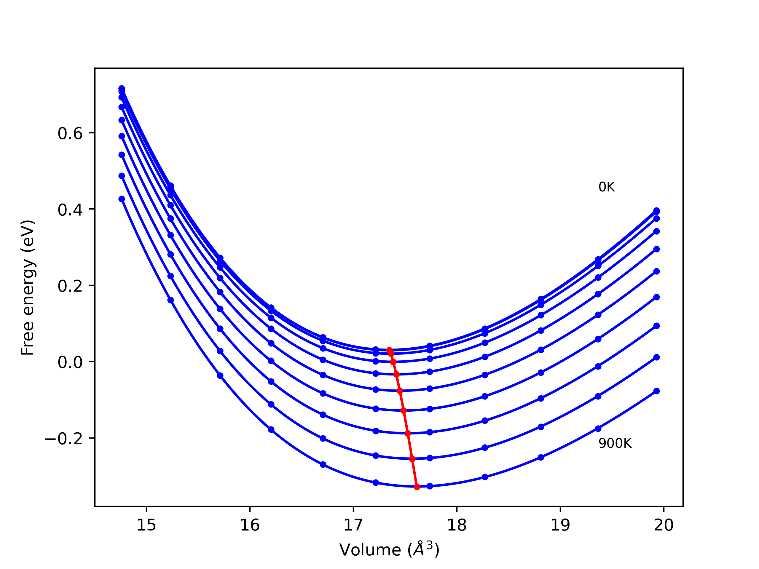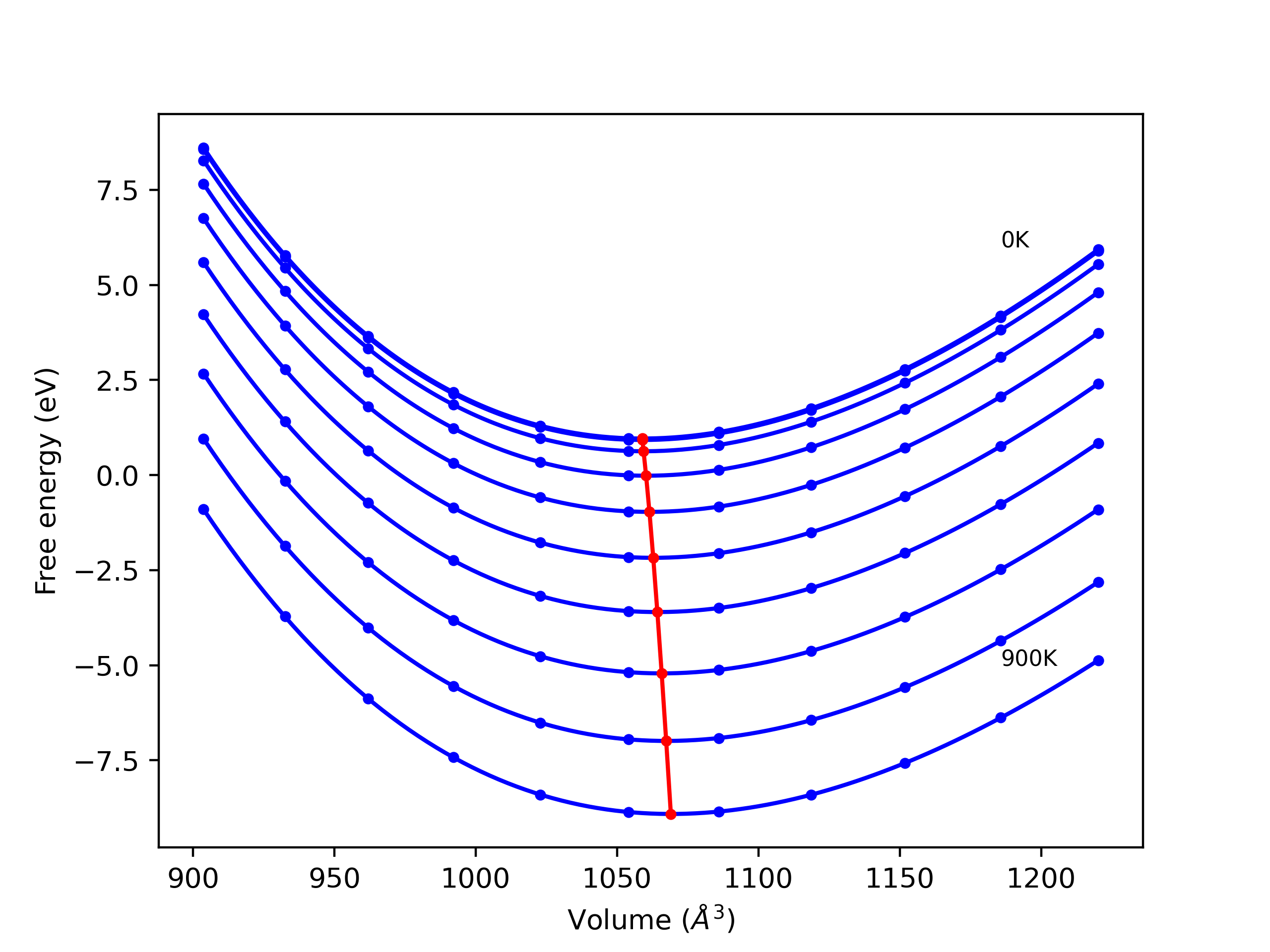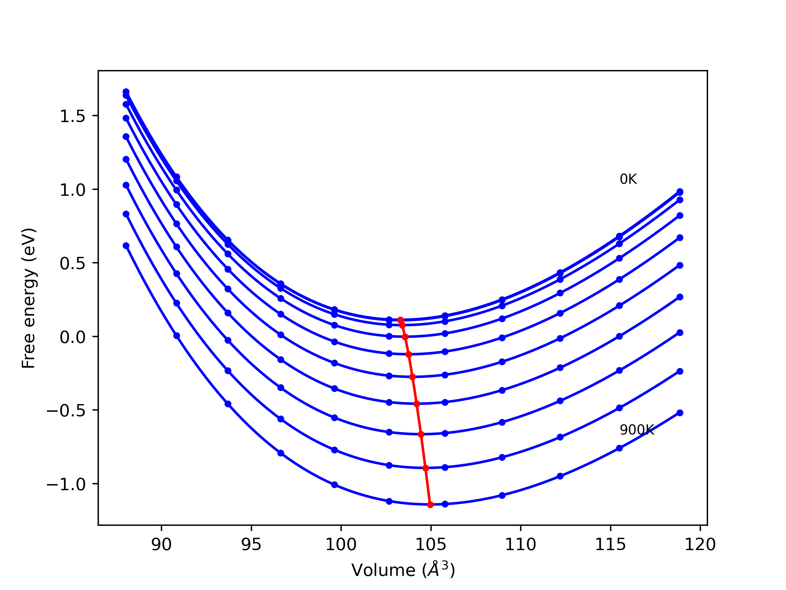 The Gibbs energies of the phases are estimated using thermodynamic integration between the interatomic potential in question and a simpler model with known Gibbs free energy values. For solids, the reference model is an Einstein solid, while for liquids it is the Uhlenbeck-Ford potential. Besides a short run at the start of the solid calculations to estimate Einstein model spring constants, the two calculations proceed similarly. Starting with the final relaxation configurations, the systems are stabilized for 25,000 steps. Then, over the next 50,000 steps the potential is swapped out for the reference potential. The system is then stabilized for another 25,000 steps with the reference model before a reverse swap of 50,000 steps is performed. The simulation ends with one final 25,000 step stabilization period. From the simulation, the irreversible work of transformation is estimated and used to compute the absolute Gibbs free energy of the target phase and potential relative to the reference potential. Entropy is estimated as the difference in enthalpy and Gibbs free energy and divided by temperature.