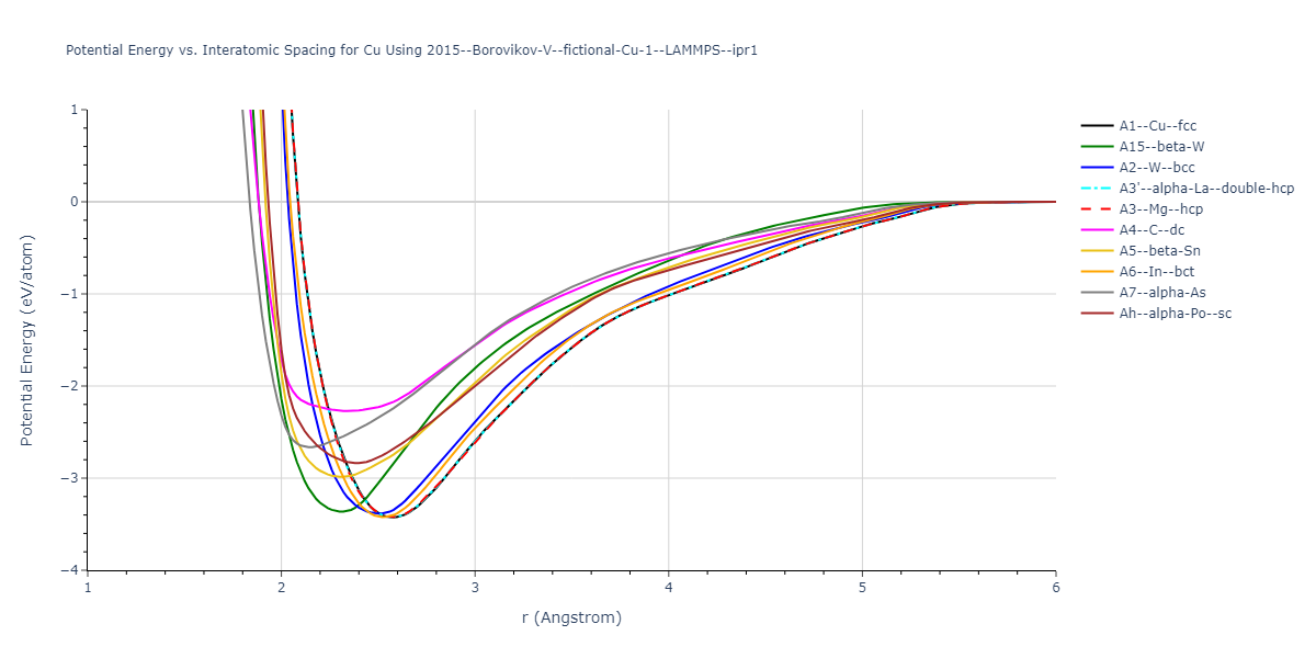 Plots of potential energy vs interatomic spacing, r, are shown below for a number of crystal structures. The structures are generated based on the ideal atomic positions and b/a and c/a lattice parameter ratios for a given crystal prototype. The size of the system is then uniformly scaled, and the energy calculated without relaxing the system. To obtain these plots, values of r are evaluated every 0.02 Å up to 6 Å.