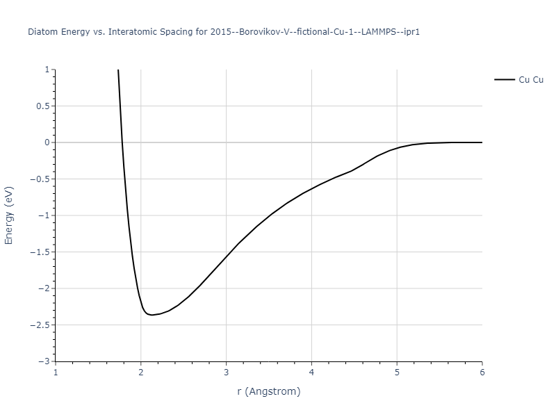 Plots of the potential energy vs interatomic spacing, r, are shown below for all diatom sets associated with the interatomic potential. This calculation provides insights into the functional form of the potential's two-body interactions. A system consisting of only two atoms is created, and the potential energy is evaluated for the atoms separated by 0.02 Å <= r <= 6.0> Å in intervals of 0.02 Å. Two plots are shown: one for the "standard" interaction distance range, and one for small values of r. The small r plot is useful for determining whether the potential is suitable for radiation studies.