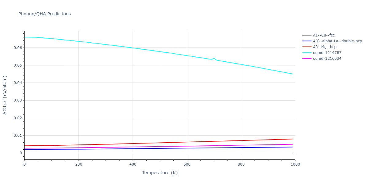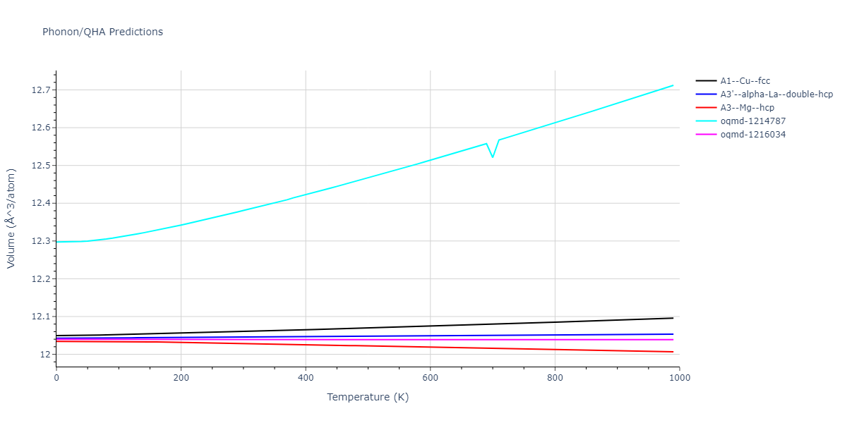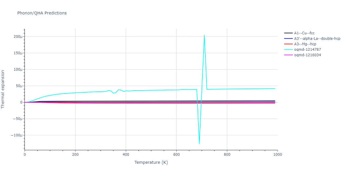 Phonon band structures and crystal properties estimated from quasi-harmonic approximation (QHA) calculations are displayed for select crystals. The calculations were performed using phonopy and LAMMPS. For the phonon calculations, 3x3 supercells of the potential-specific relaxed crystals were used. The QHA calculations were based on 11 strain states ranging from -0.05 to 0.05.