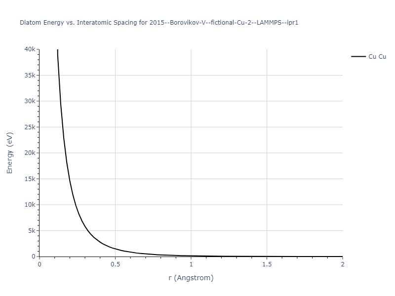 Plots of the potential energy vs interatomic spacing, r, are shown below for all diatom sets associated with the interatomic potential. This calculation provides insights into the functional form of the potential's two-body interactions. A system consisting of only two atoms is created, and the potential energy is evaluated for the atoms separated by 0.02 Å <= r <= 6.0> Å in intervals of 0.02 Å. Two plots are shown: one for the "standard" interaction distance range, and one for small values of r. The small r plot is useful for determining whether the potential is suitable for radiation studies.
