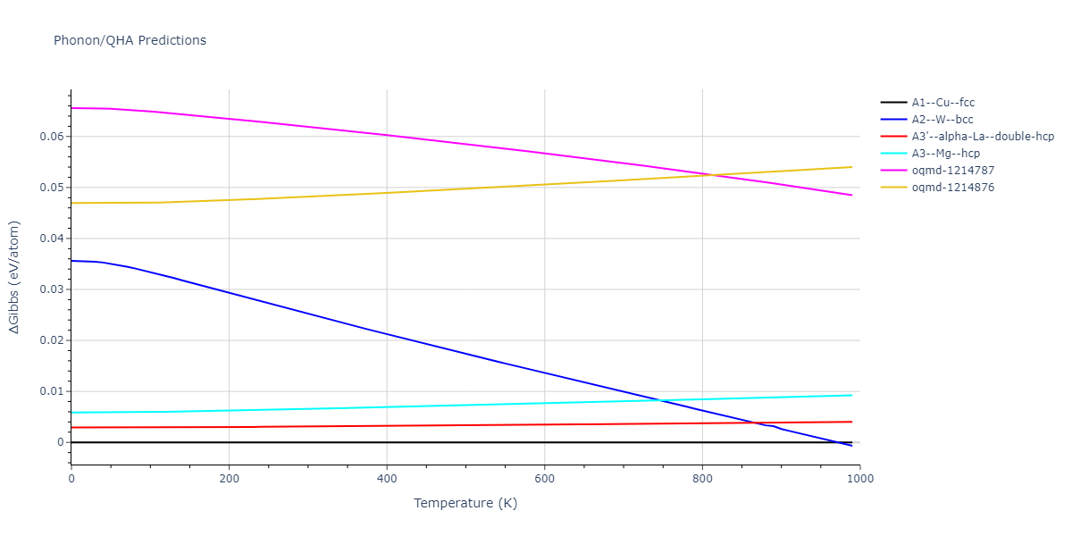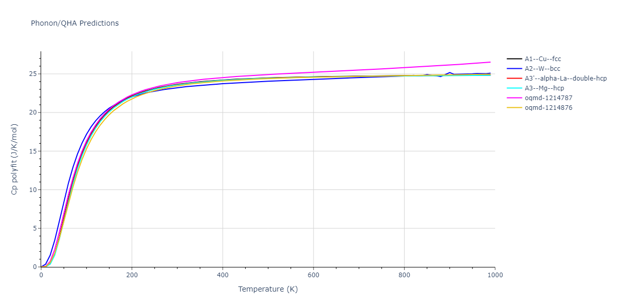 Phonon band structures and crystal properties estimated from quasi-harmonic approximation (QHA) calculations are displayed for select crystals. The calculations were performed using phonopy and LAMMPS. For the phonon calculations, 3x3 supercells of the potential-specific relaxed crystals were used. The QHA calculations were based on 11 strain states ranging from -0.05 to 0.05.