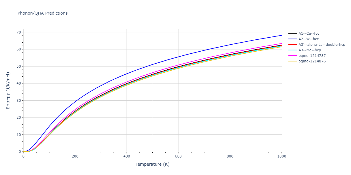 The Gibbs energies of the phases are estimated using thermodynamic integration between the interatomic potential in question and a simpler model with known Gibbs free energy values. For solids, the reference model is an Einstein solid, while for liquids it is the Uhlenbeck-Ford potential. Besides a short run at the start of the solid calculations to estimate Einstein model spring constants, the two calculations proceed similarly. Starting with the final relaxation configurations, the systems are stabilized for 25,000 steps. Then, over the next 50,000 steps the potential is swapped out for the reference potential. The system is then stabilized for another 25,000 steps with the reference model before a reverse swap of 50,000 steps is performed. The simulation ends with one final 25,000 step stabilization period. From the simulation, the irreversible work of transformation is estimated and used to compute the absolute Gibbs free energy of the target phase and potential relative to the reference potential. Entropy is estimated as the difference in enthalpy and Gibbs free energy and divided by temperature.