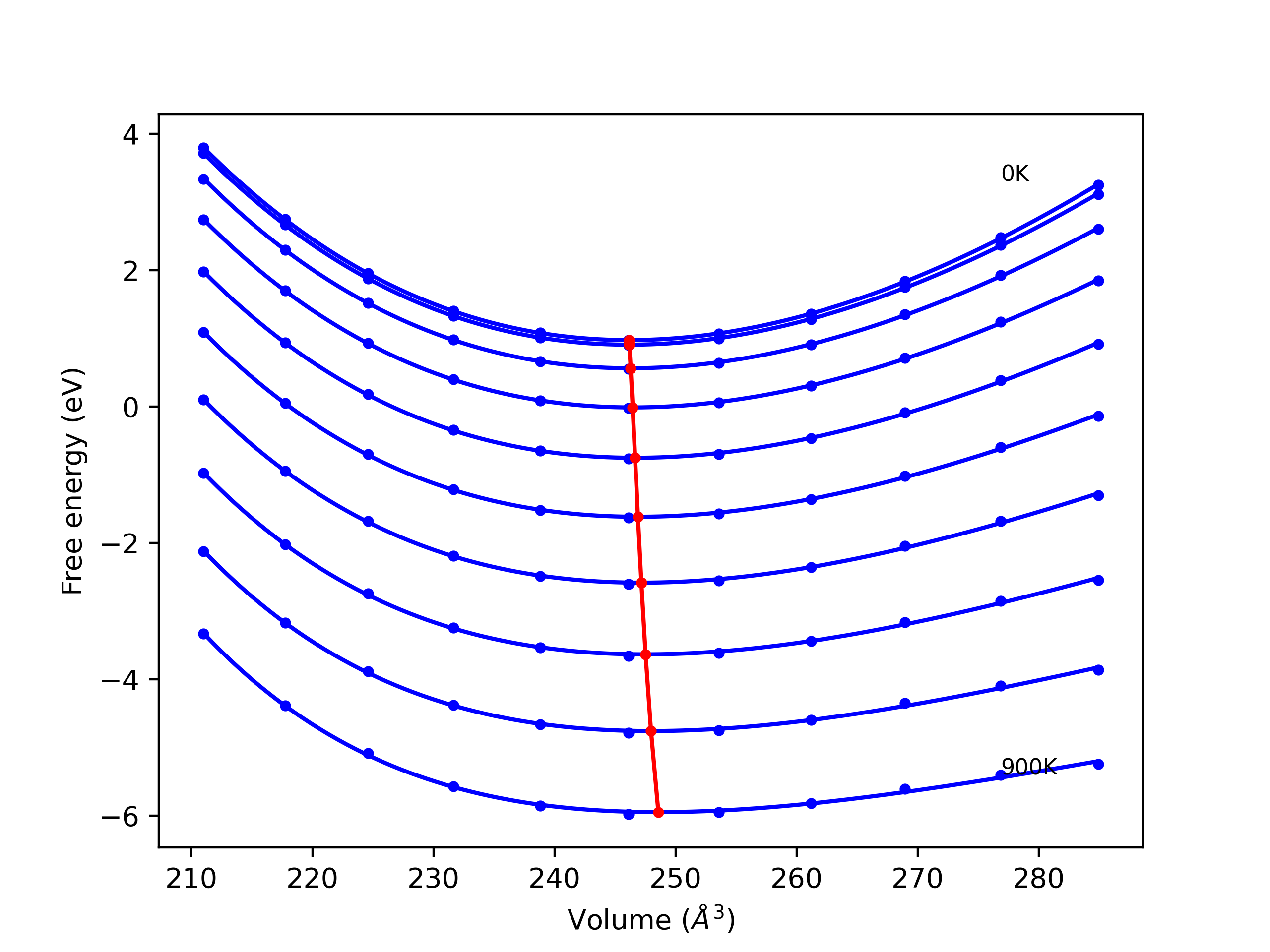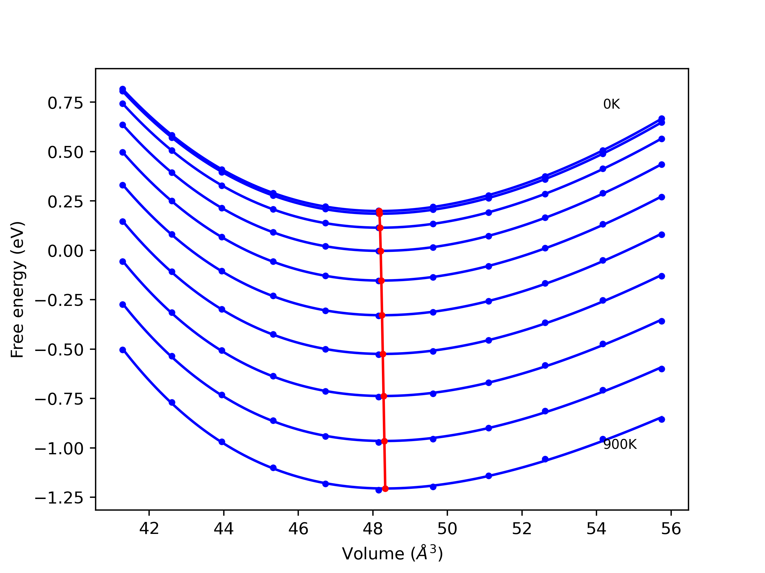Plots of lattice and elastic constants are shown as a function of temperature. The 0K points were taken from the Crystal Structure Predictions and the Elastic Constants Predictions sections above for the unique crystal structures relaxed with the "dynamic" method. Starting from the 0 K relaxed crystal unit cells, supercell systems are created by replicating all three dimensions by the same multiplier to achieve at least 4000 atoms. The systems are then relaxed at 50 K and zero pressure using 1 million NPT steps. Lattice constants are estimated by averaging the measured box dimensions. Temperatures are iteratively increased by 50 K, with each subsequent relaxation calculation starting from the final atomic configuration at the previous temperature and relaxing for another 1 million steps.