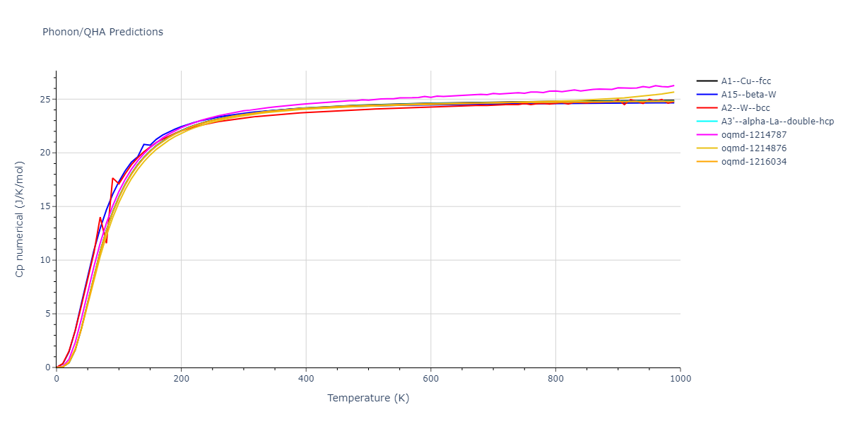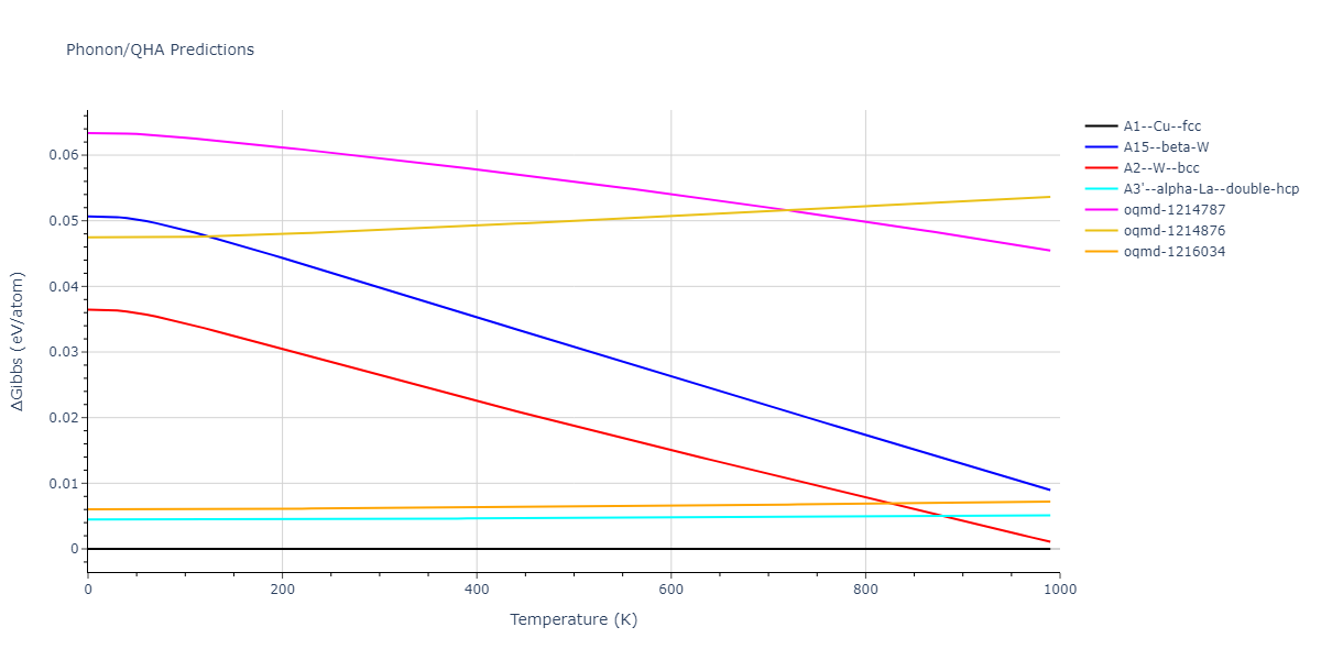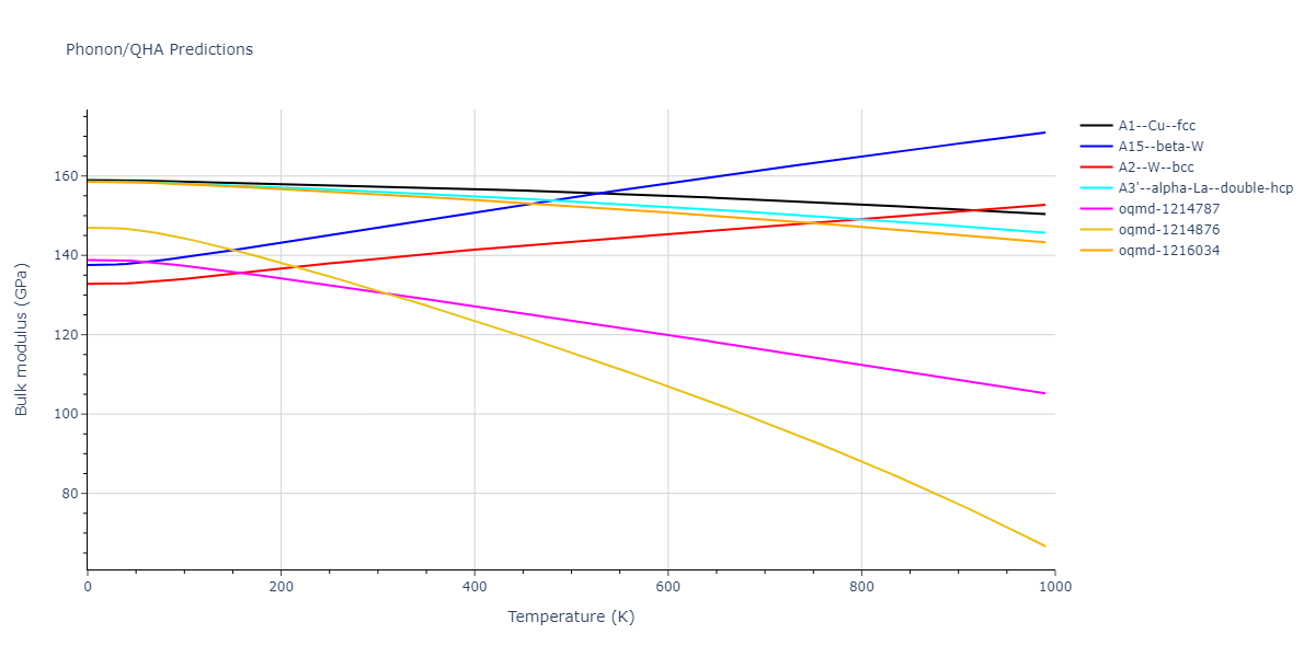 Phonon band structures and crystal properties estimated from quasi-harmonic approximation (QHA) calculations are displayed for select crystals. The calculations were performed using phonopy and LAMMPS. For the phonon calculations, 3x3 supercells of the potential-specific relaxed crystals were used. The QHA calculations were based on 11 strain states ranging from -0.05 to 0.05.