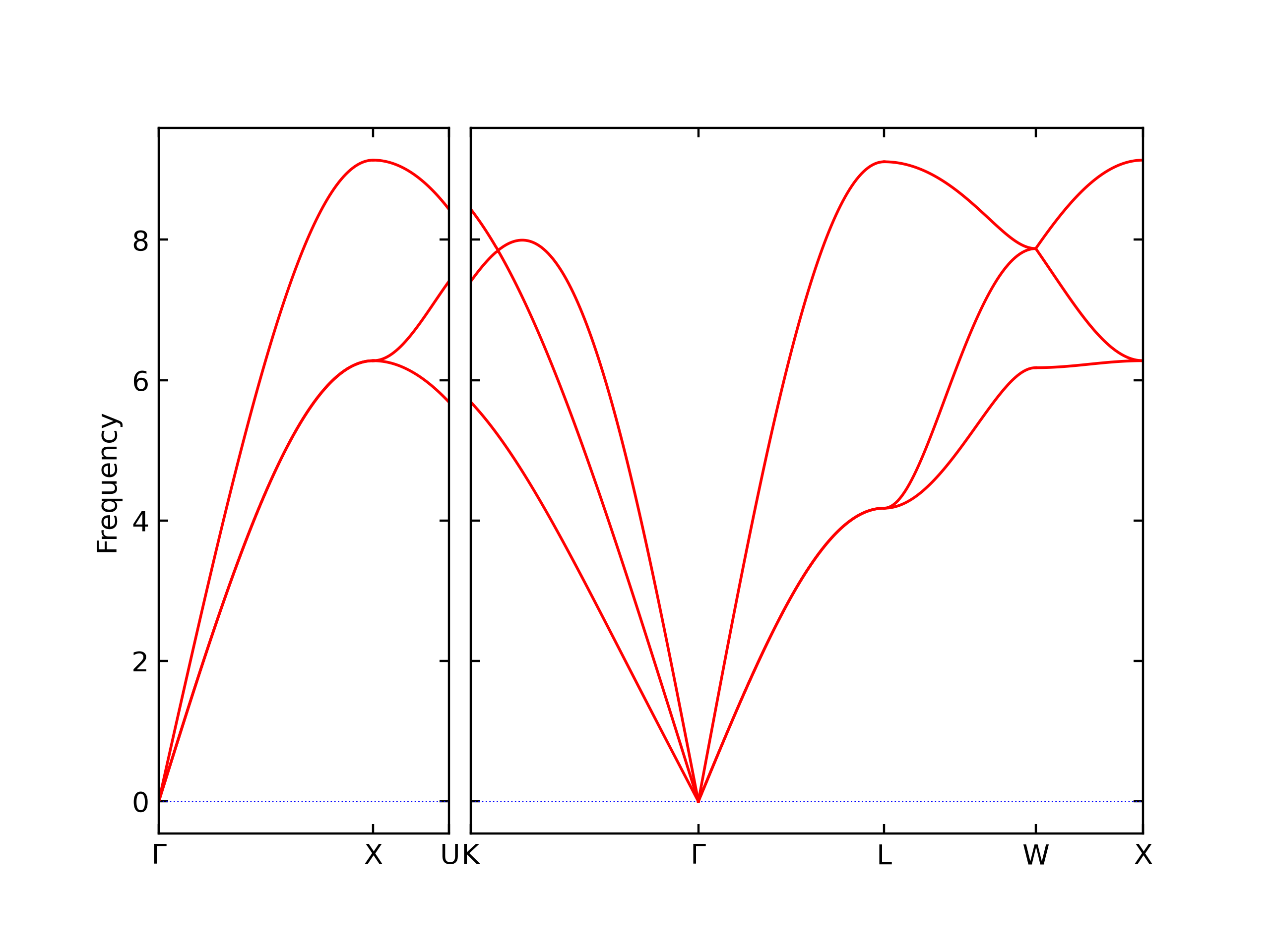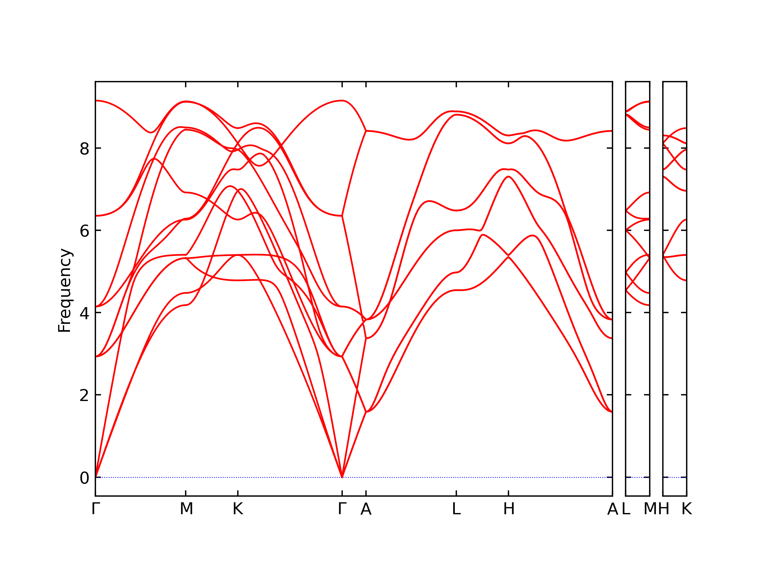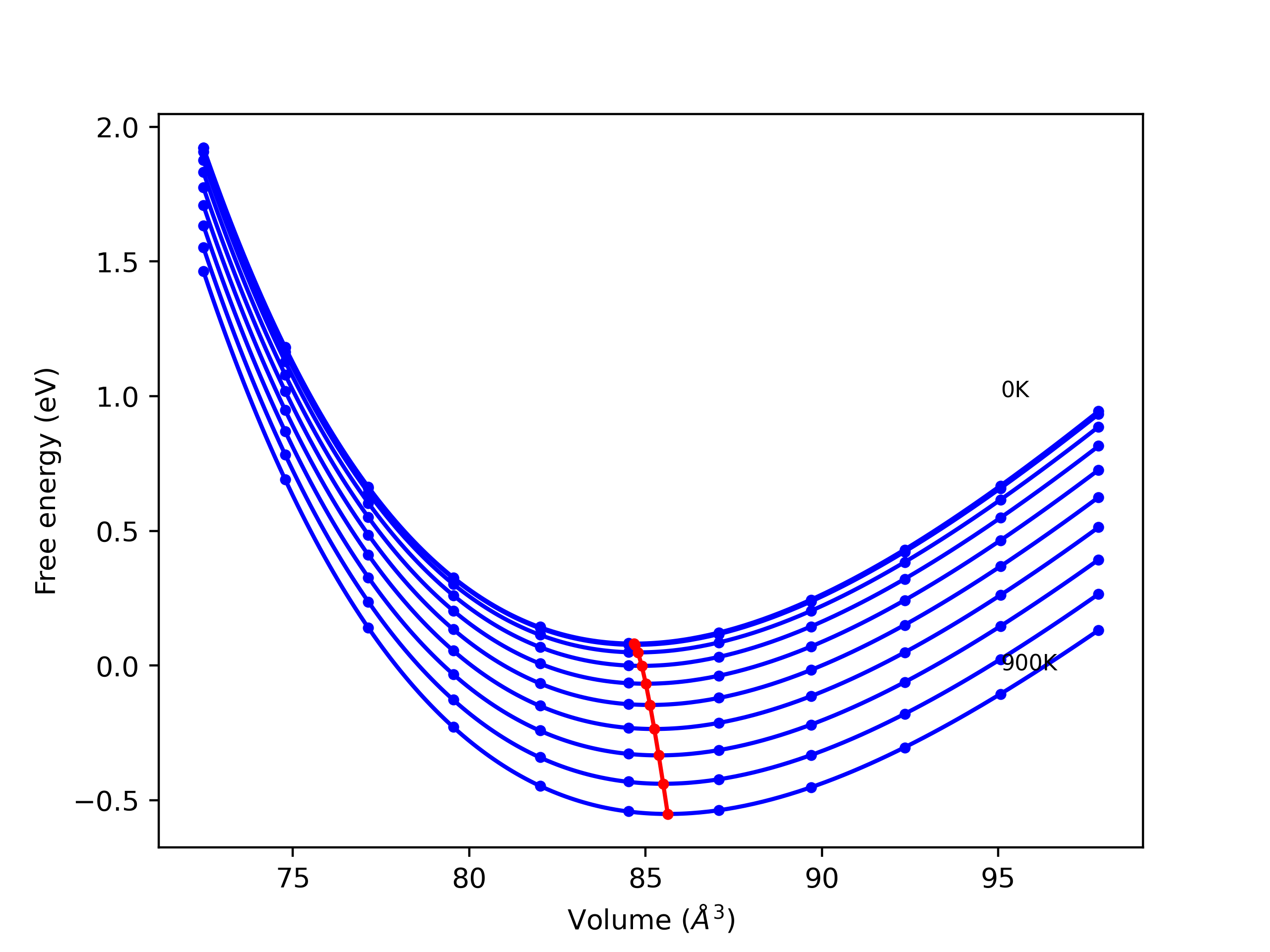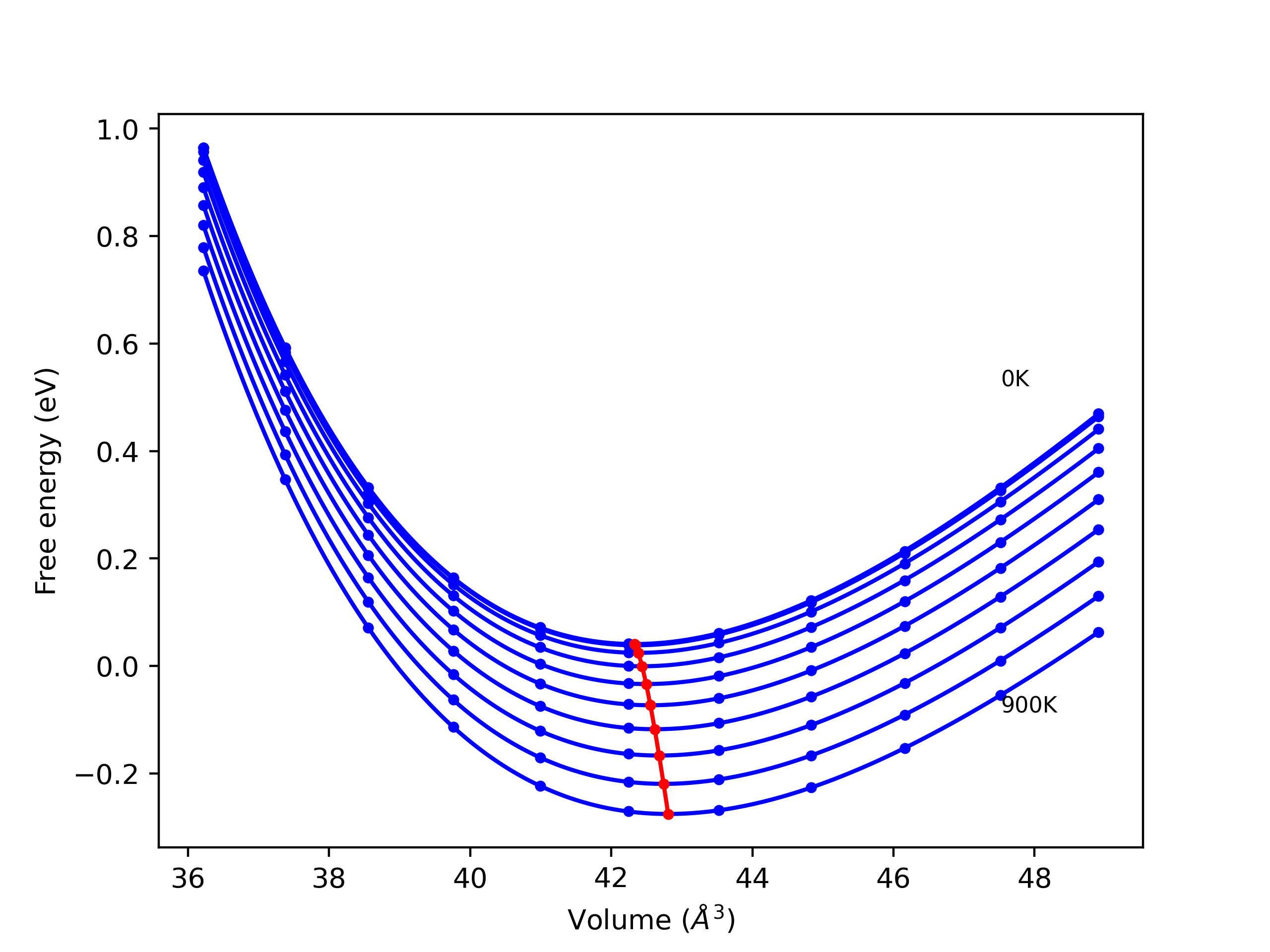 Phonon band structures and crystal properties estimated from quasi-harmonic approximation (QHA) calculations are displayed for select crystals. The calculations were performed using phonopy and LAMMPS. For the phonon calculations, 3x3 supercells of the potential-specific relaxed crystals were used. The QHA calculations were based on 11 strain states ranging from -0.05 to 0.05.