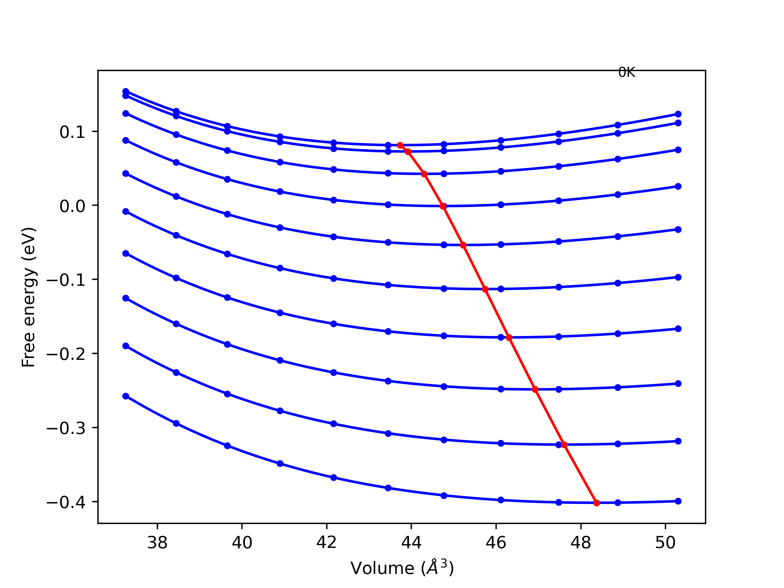 Phonon band structures and crystal properties estimated from quasi-harmonic approximation (QHA) calculations are displayed for select crystals. The calculations were performed using phonopy and LAMMPS. For the phonon calculations, 3x3 supercells of the potential-specific relaxed crystals were used. The QHA calculations were based on 11 strain states ranging from -0.05 to 0.05.