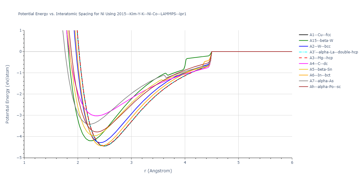 Plots of potential energy vs interatomic spacing, r, are shown below for a number of crystal structures. The structures are generated based on the ideal atomic positions and b/a and c/a lattice parameter ratios for a given crystal prototype. The size of the system is then uniformly scaled, and the energy calculated without relaxing the system. To obtain these plots, values of r are evaluated every 0.02 Å up to 6 Å.