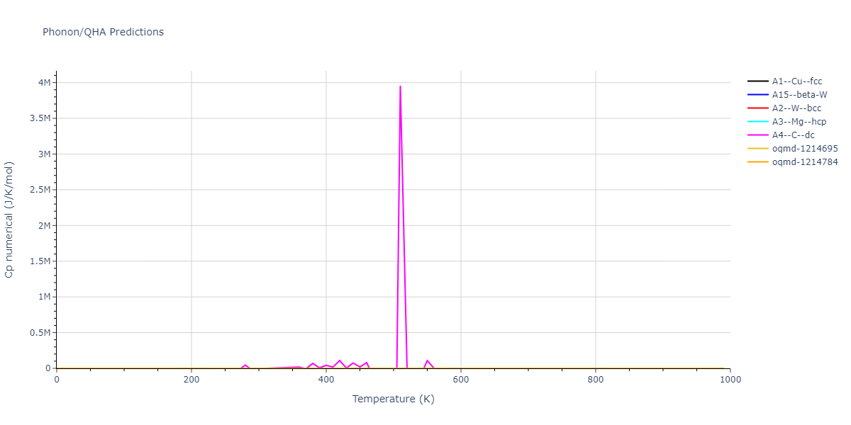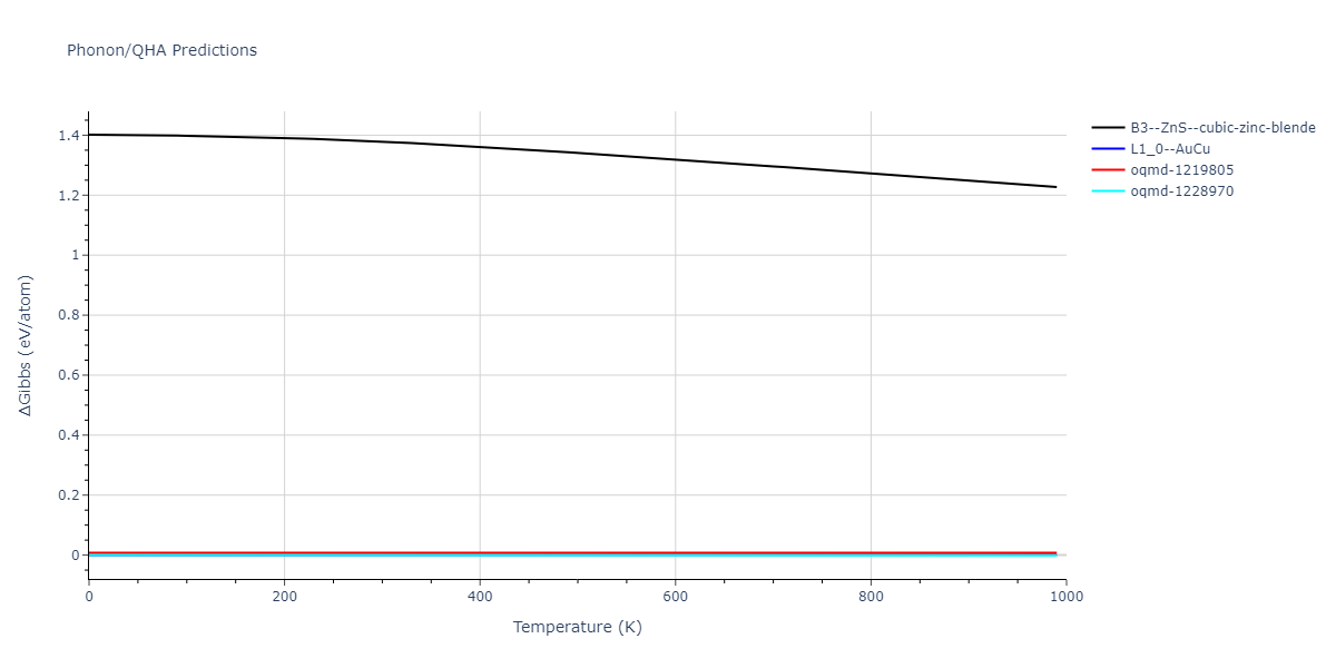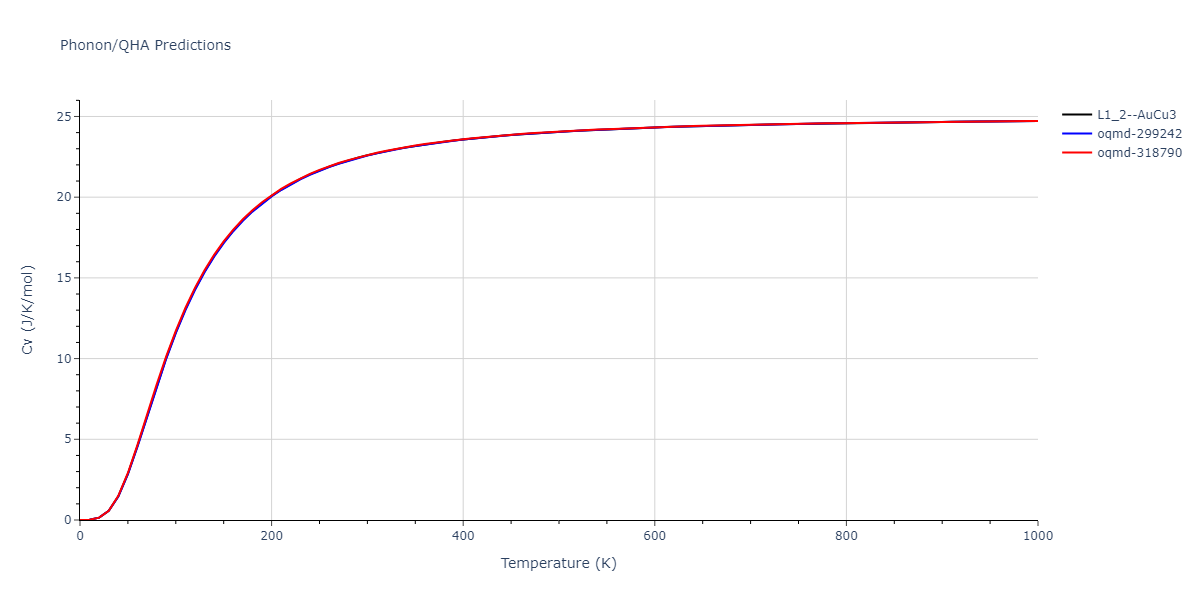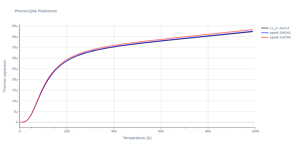 Phonon band structures and crystal properties estimated from quasi-harmonic approximation (QHA) calculations are displayed for select crystals. The calculations were performed using phonopy and LAMMPS. For the phonon calculations, 3x3 supercells of the potential-specific relaxed crystals were used. The QHA calculations were based on 11 strain states ranging from -0.05 to 0.05.