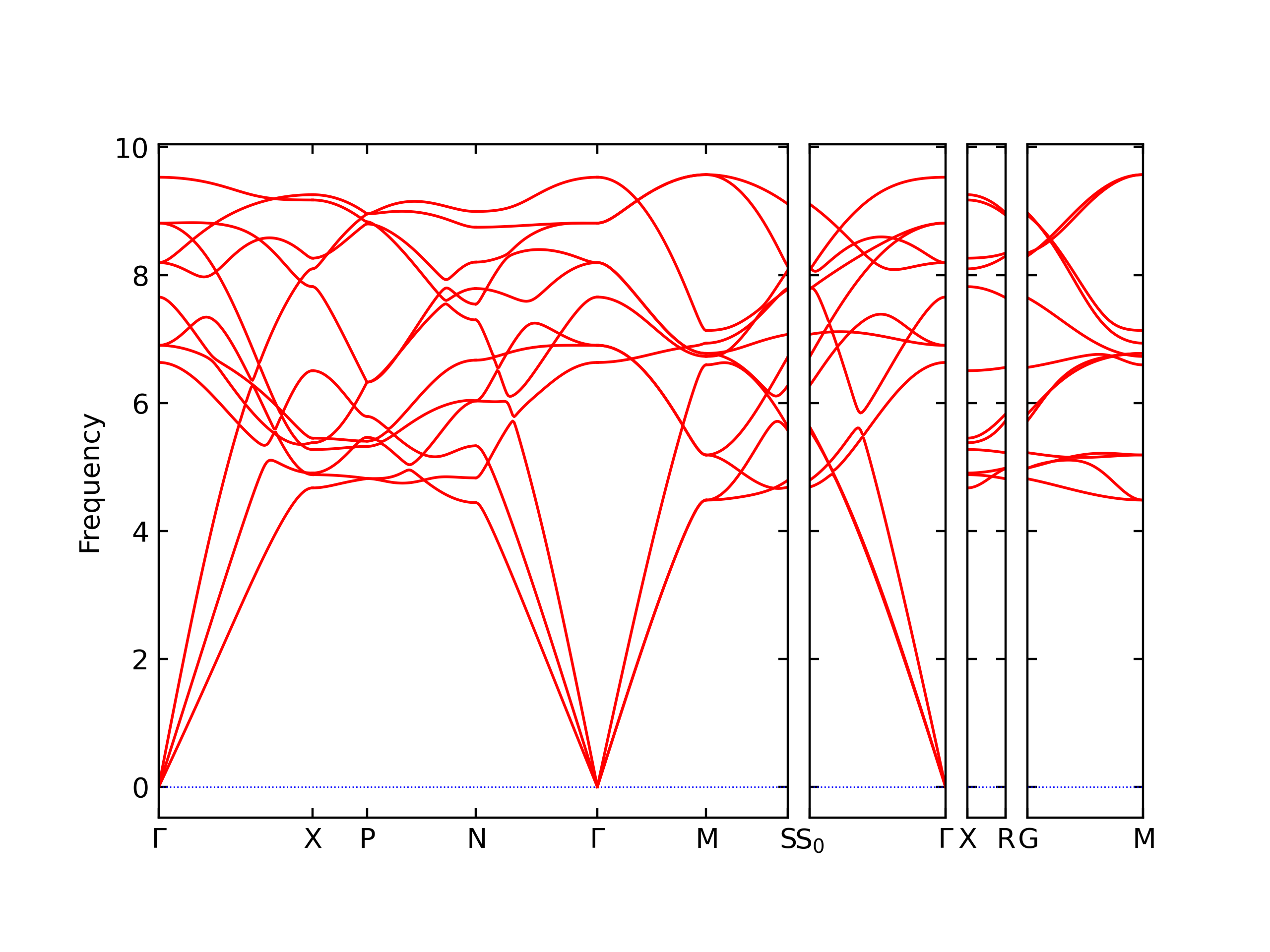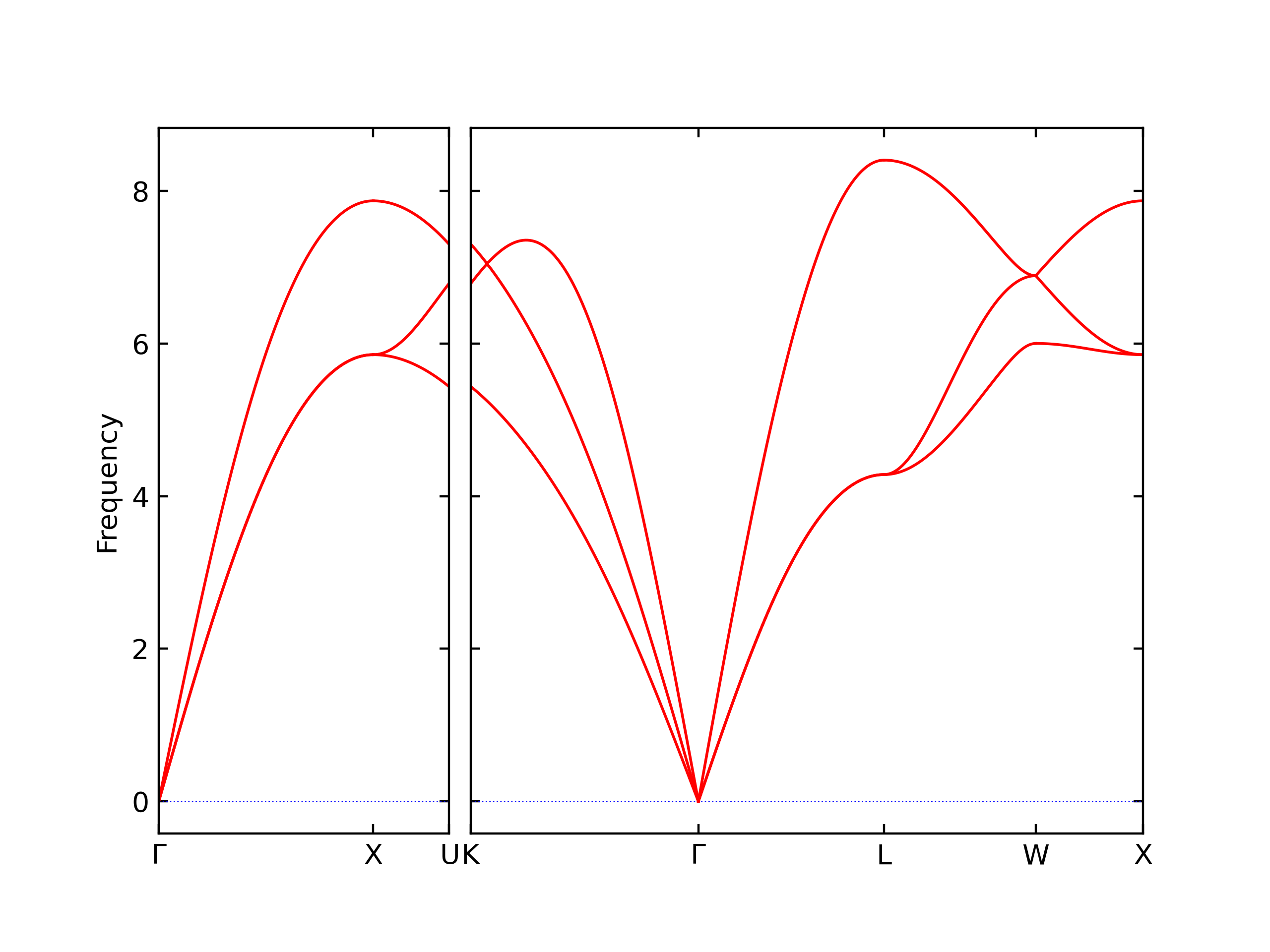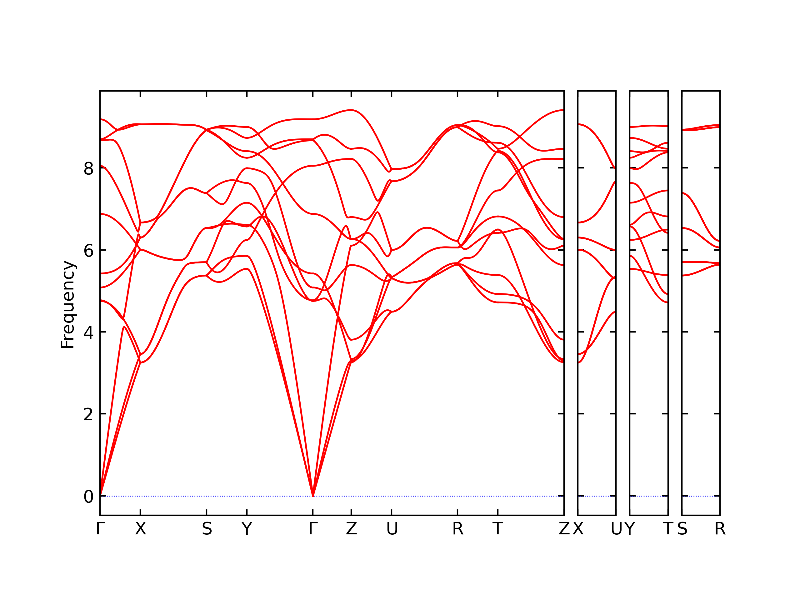 Phonon band structures and crystal properties estimated from quasi-harmonic approximation (QHA) calculations are displayed for select crystals. The calculations were performed using phonopy and LAMMPS. For the phonon calculations, 3x3 supercells of the potential-specific relaxed crystals were used. The QHA calculations were based on 11 strain states ranging from -0.05 to 0.05.
