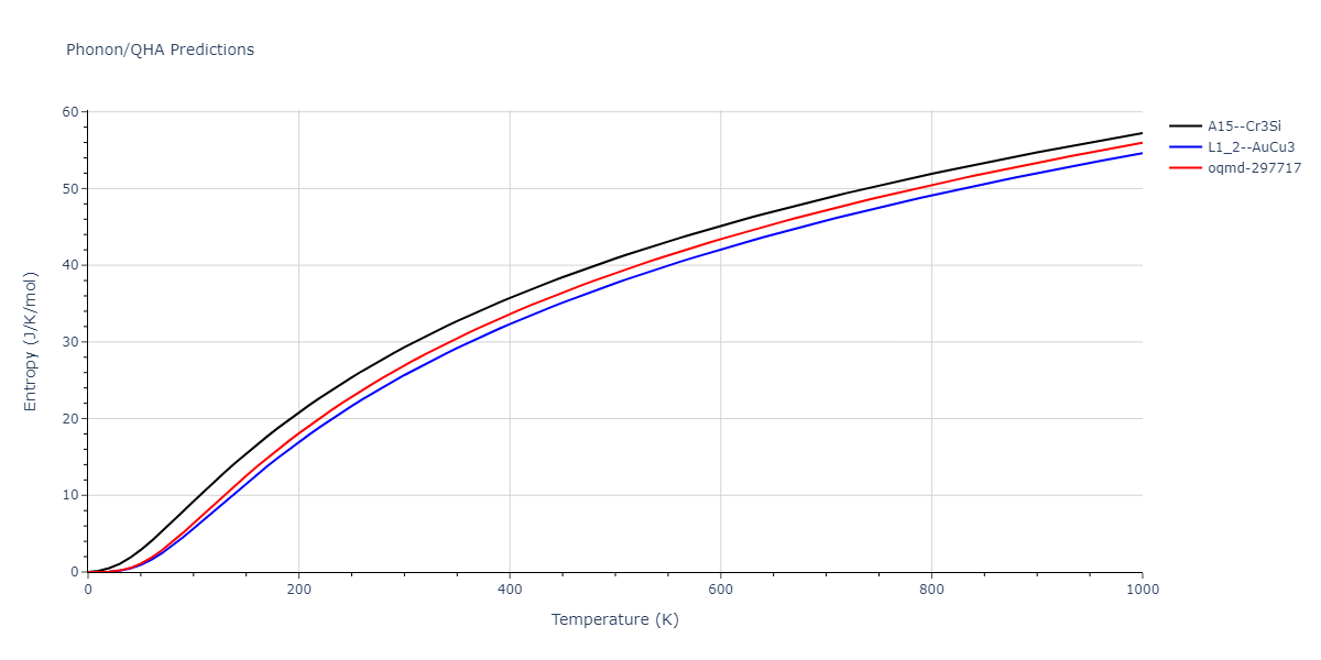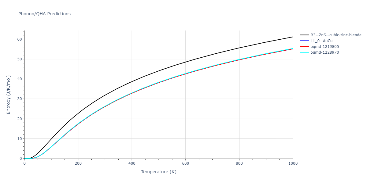 The Gibbs energies of the phases are estimated using thermodynamic integration between the interatomic potential in question and a simpler model with known Gibbs free energy values. For solids, the reference model is an Einstein solid, while for liquids it is the Uhlenbeck-Ford potential. Besides a short run at the start of the solid calculations to estimate Einstein model spring constants, the two calculations proceed similarly. Starting with the final relaxation configurations, the systems are stabilized for 25,000 steps. Then, over the next 50,000 steps the potential is swapped out for the reference potential. The system is then stabilized for another 25,000 steps with the reference model before a reverse swap of 50,000 steps is performed. The simulation ends with one final 25,000 step stabilization period. From the simulation, the irreversible work of transformation is estimated and used to compute the absolute Gibbs free energy of the target phase and potential relative to the reference potential. Entropy is estimated as the difference in enthalpy and Gibbs free energy and divided by temperature.