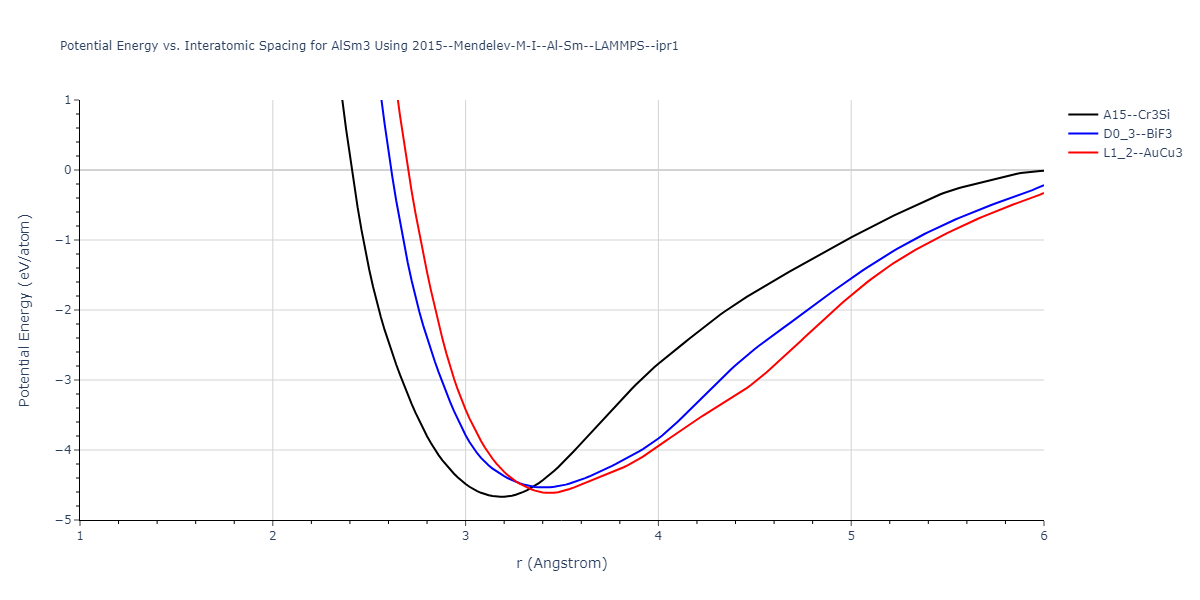 Plots of potential energy vs interatomic spacing, r, are shown below for a number of crystal structures. The structures are generated based on the ideal atomic positions and b/a and c/a lattice parameter ratios for a given crystal prototype. The size of the system is then uniformly scaled, and the energy calculated without relaxing the system. To obtain these plots, values of r are evaluated every 0.02 Å up to 6 Å.