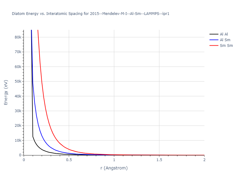 Plots of the potential energy vs interatomic spacing, r, are shown below for all diatom sets associated with the interatomic potential. This calculation provides insights into the functional form of the potential's two-body interactions. A system consisting of only two atoms is created, and the potential energy is evaluated for the atoms separated by 0.02 Å <= r <= 6.0> Å in intervals of 0.02 Å. Two plots are shown: one for the "standard" interaction distance range, and one for small values of r. The small r plot is useful for determining whether the potential is suitable for radiation studies.