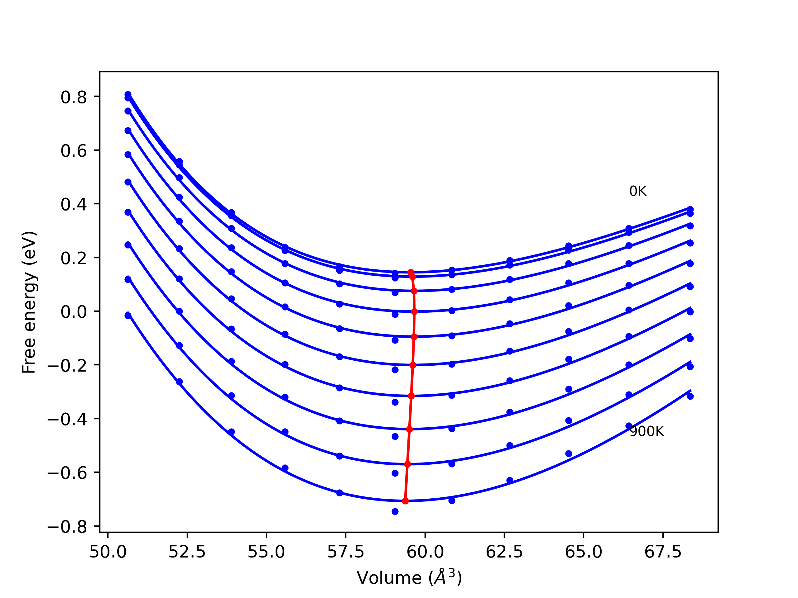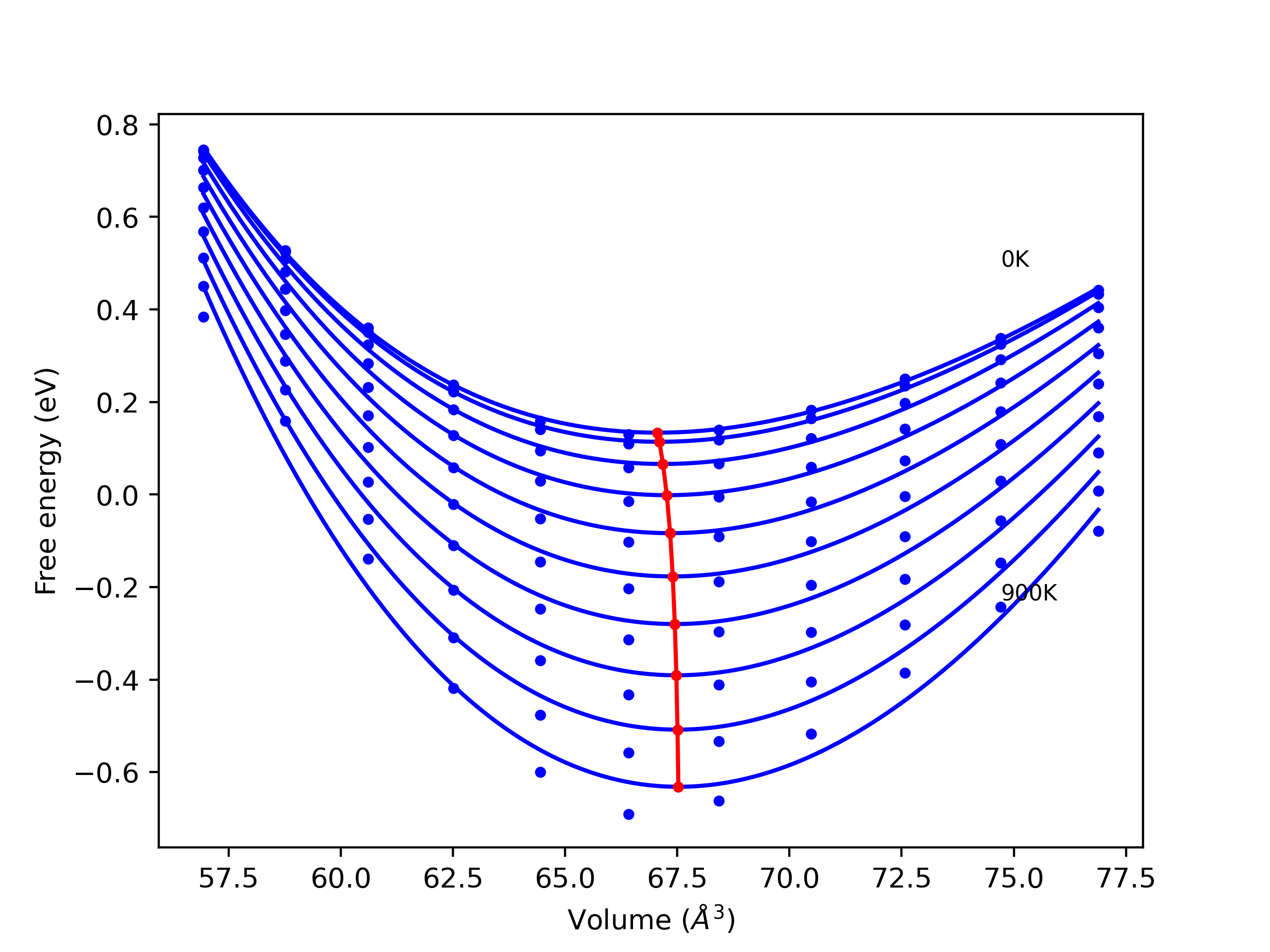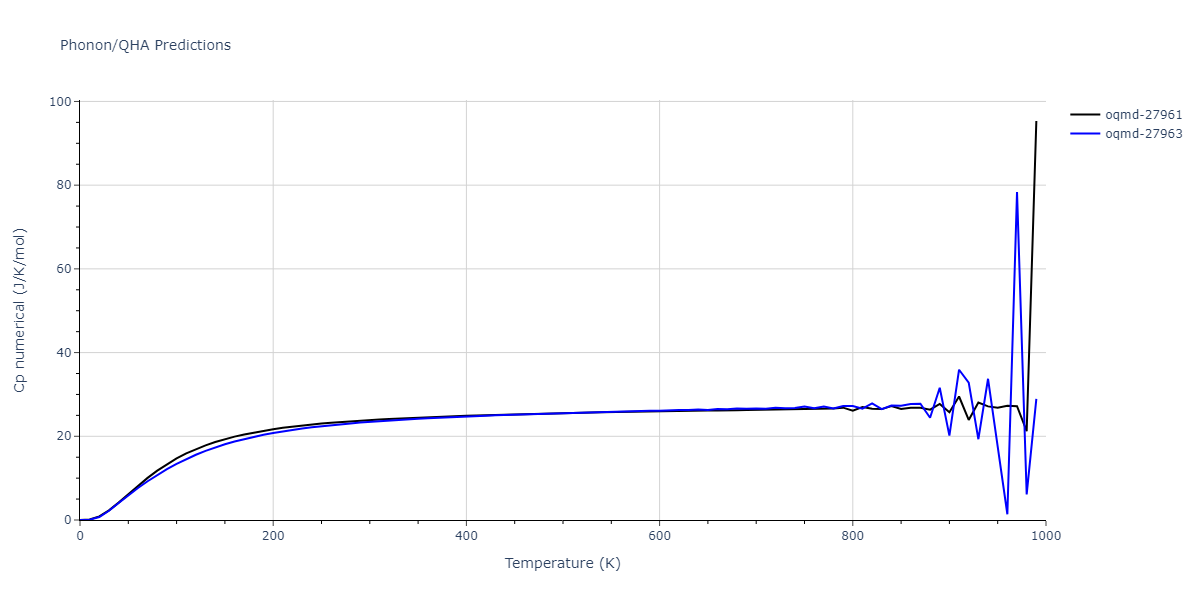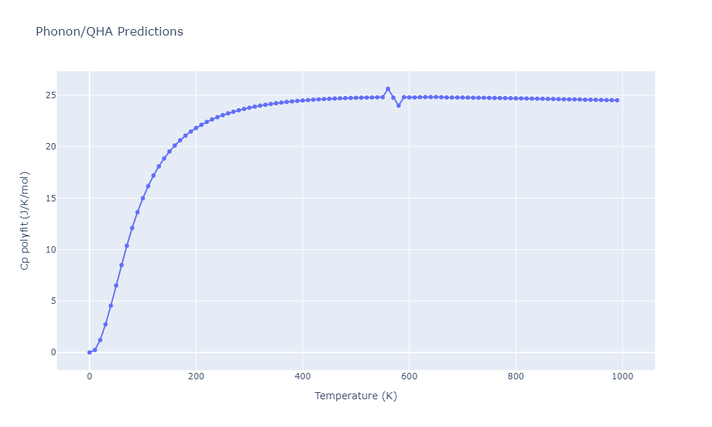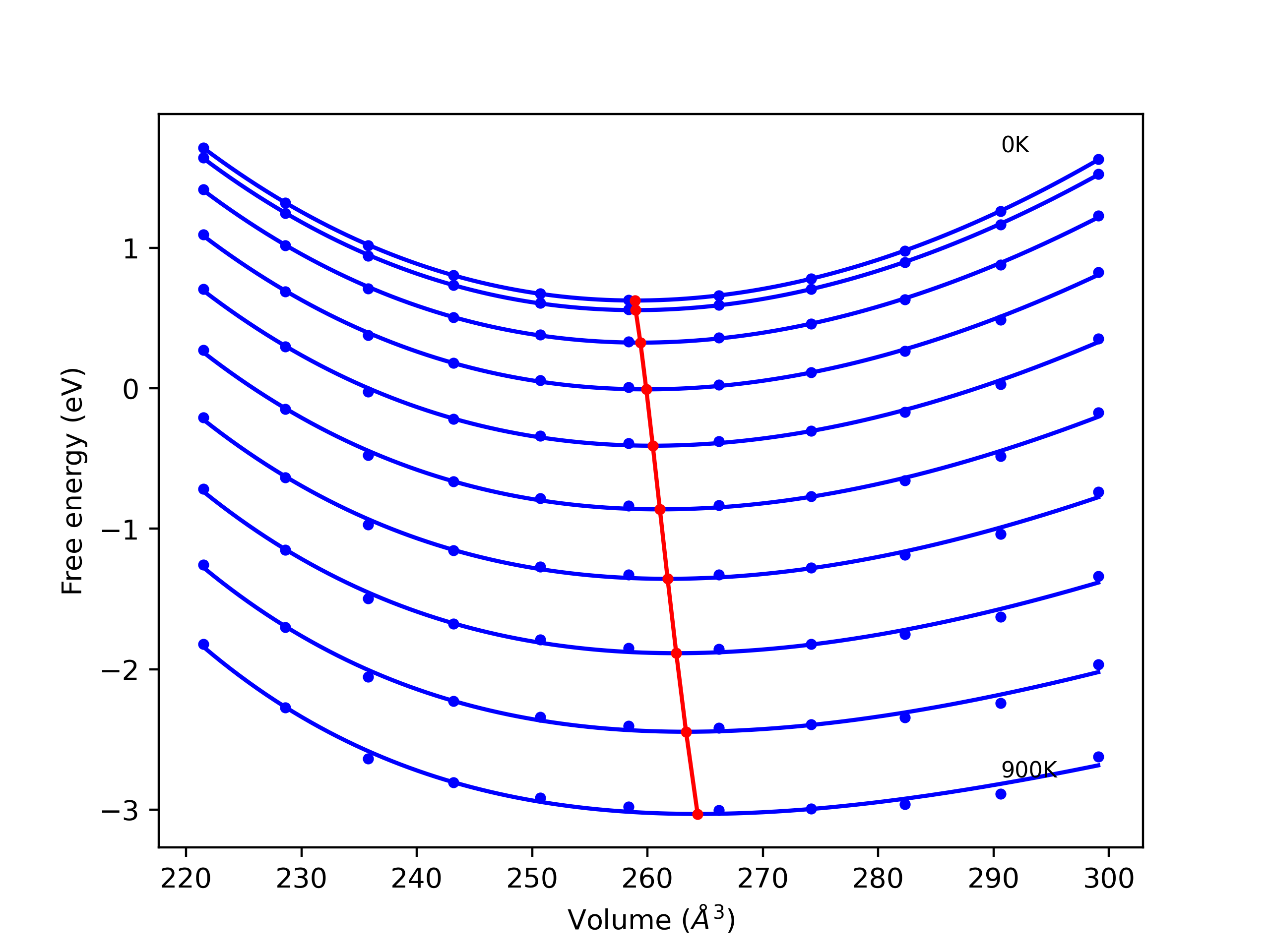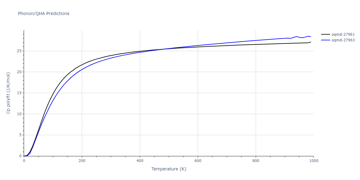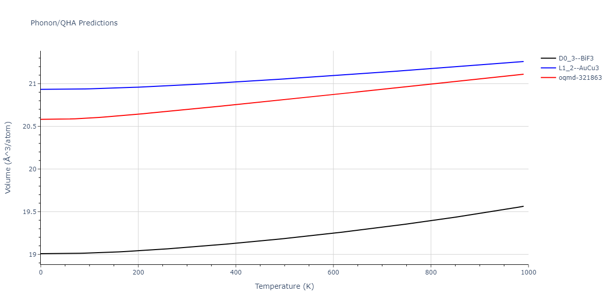 Phonon band structures and crystal properties estimated from quasi-harmonic approximation (QHA) calculations are displayed for select crystals. The calculations were performed using phonopy and LAMMPS. For the phonon calculations, 3x3 supercells of the potential-specific relaxed crystals were used. The QHA calculations were based on 11 strain states ranging from -0.05 to 0.05.