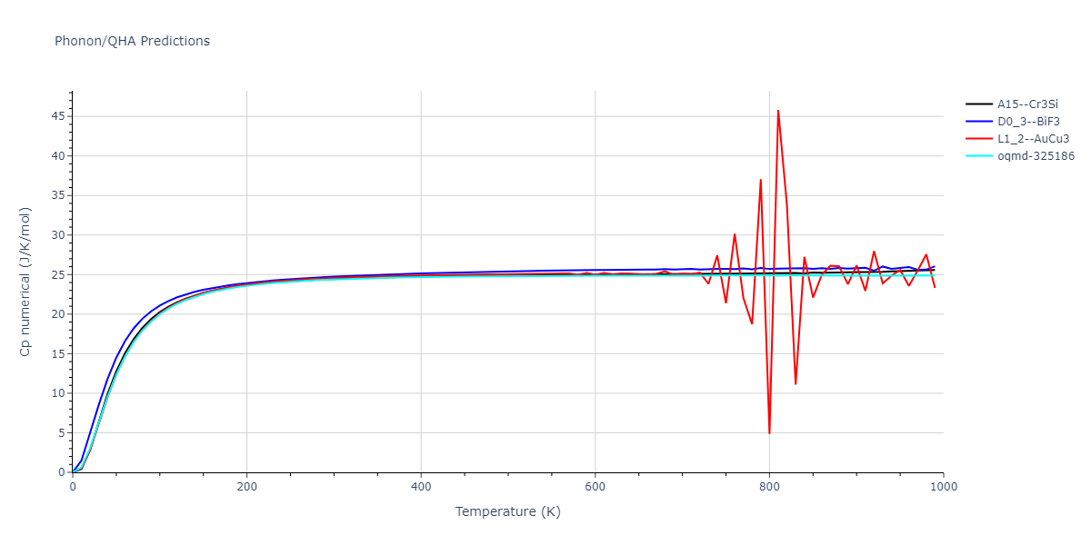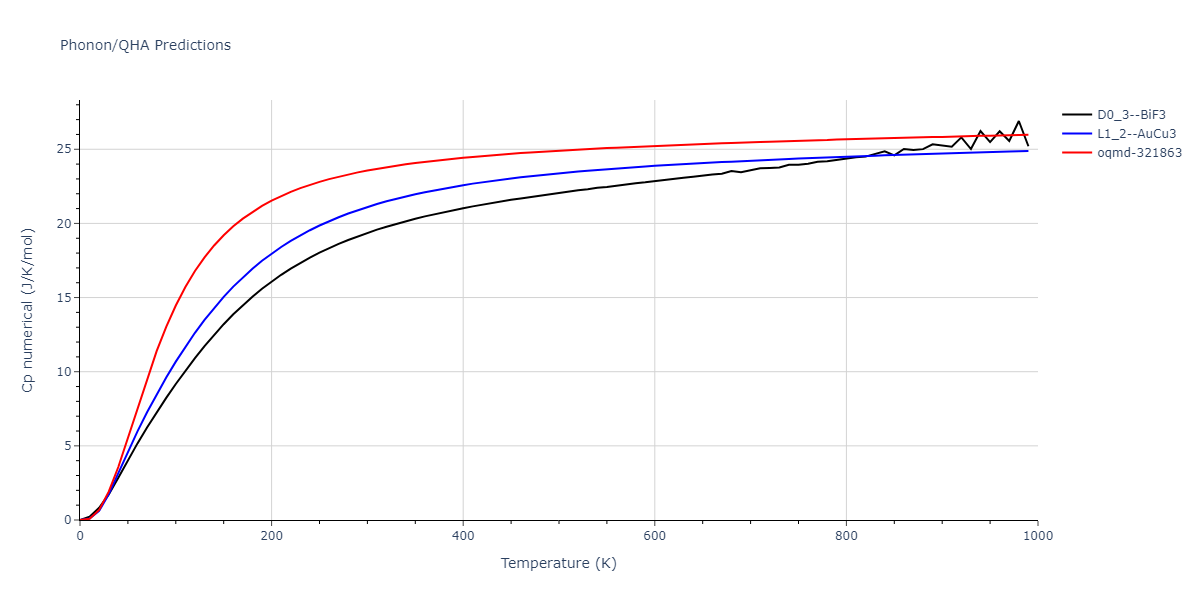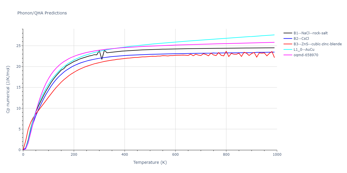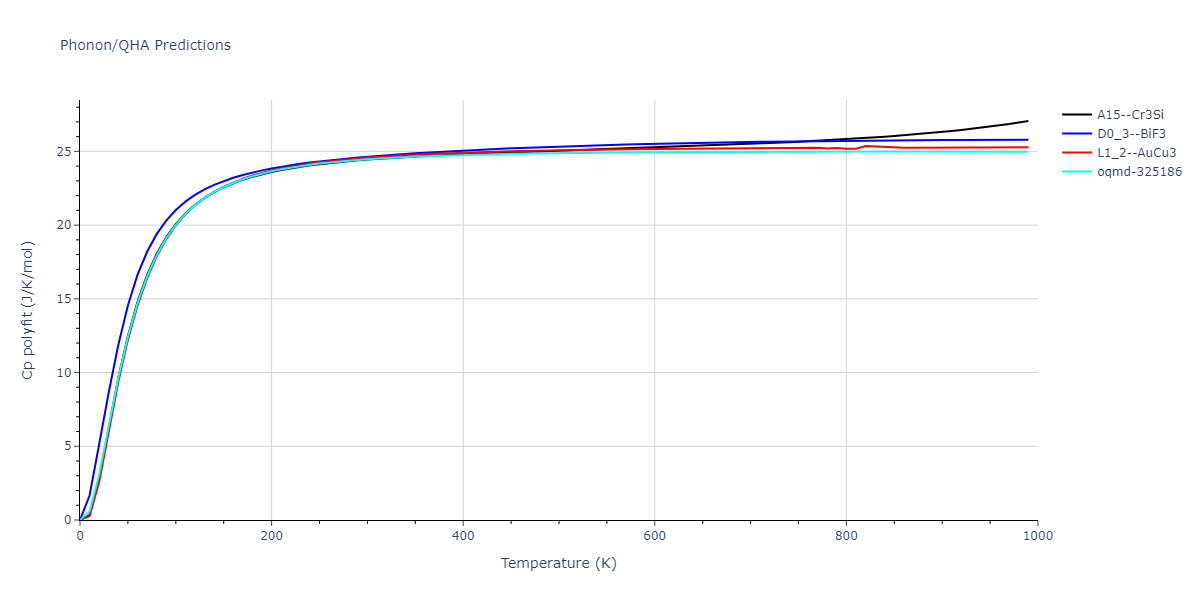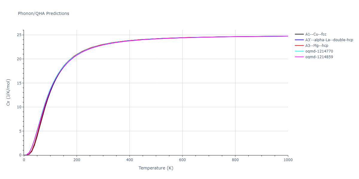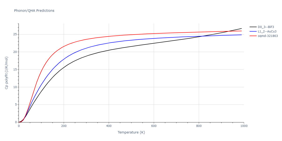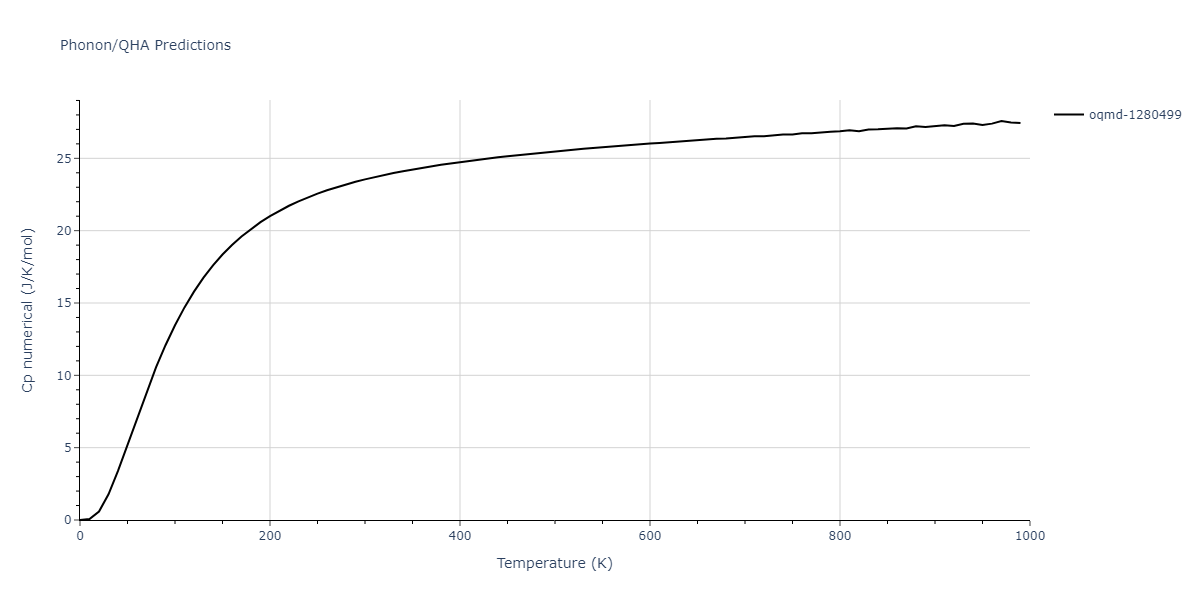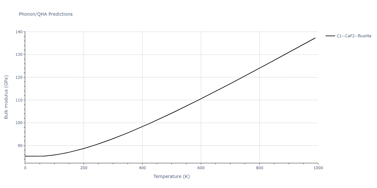 Phonon band structures and crystal properties estimated from quasi-harmonic approximation (QHA) calculations are displayed for select crystals. The calculations were performed using phonopy and LAMMPS. For the phonon calculations, 3x3 supercells of the potential-specific relaxed crystals were used. The QHA calculations were based on 11 strain states ranging from -0.05 to 0.05.