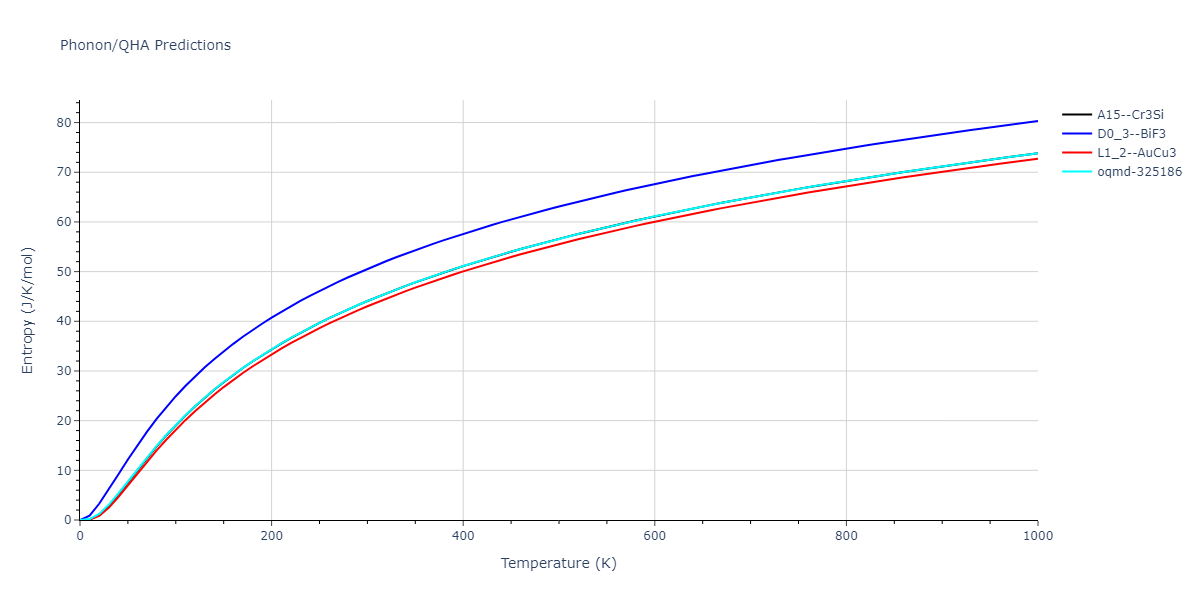 The Gibbs energies of the phases are estimated using thermodynamic integration between the interatomic potential in question and a simpler model with known Gibbs free energy values. For solids, the reference model is an Einstein solid, while for liquids it is the Uhlenbeck-Ford potential. Besides a short run at the start of the solid calculations to estimate Einstein model spring constants, the two calculations proceed similarly. Starting with the final relaxation configurations, the systems are stabilized for 25,000 steps. Then, over the next 50,000 steps the potential is swapped out for the reference potential. The system is then stabilized for another 25,000 steps with the reference model before a reverse swap of 50,000 steps is performed. The simulation ends with one final 25,000 step stabilization period. From the simulation, the irreversible work of transformation is estimated and used to compute the absolute Gibbs free energy of the target phase and potential relative to the reference potential. Entropy is estimated as the difference in enthalpy and Gibbs free energy and divided by temperature.