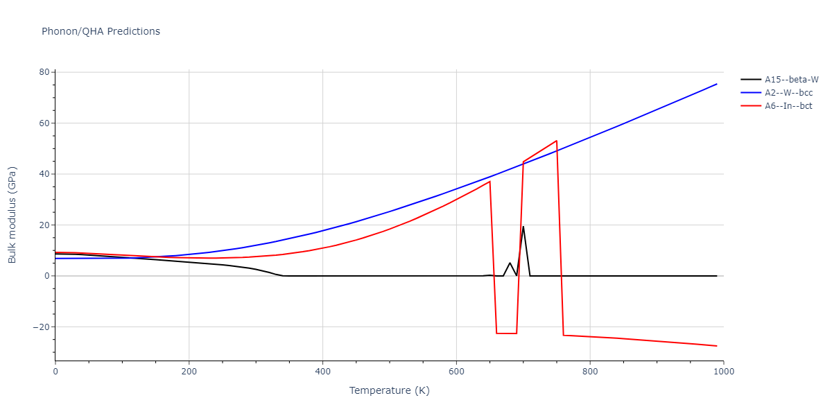 Phonon band structures and crystal properties estimated from quasi-harmonic approximation (QHA) calculations are displayed for select crystals. The calculations were performed using phonopy and LAMMPS. For the phonon calculations, 3x3 supercells of the potential-specific relaxed crystals were used. The QHA calculations were based on 11 strain states ranging from -0.05 to 0.05.