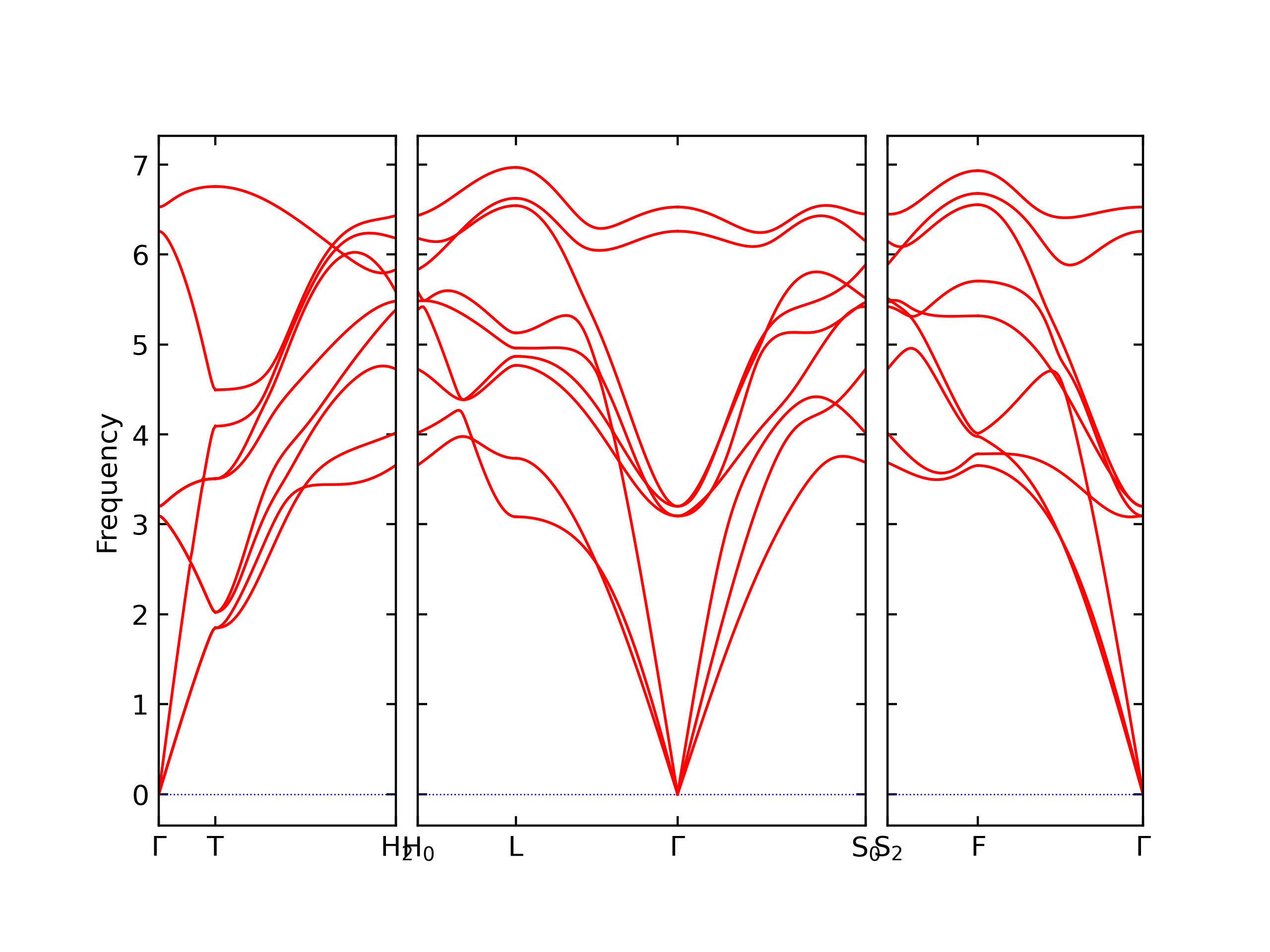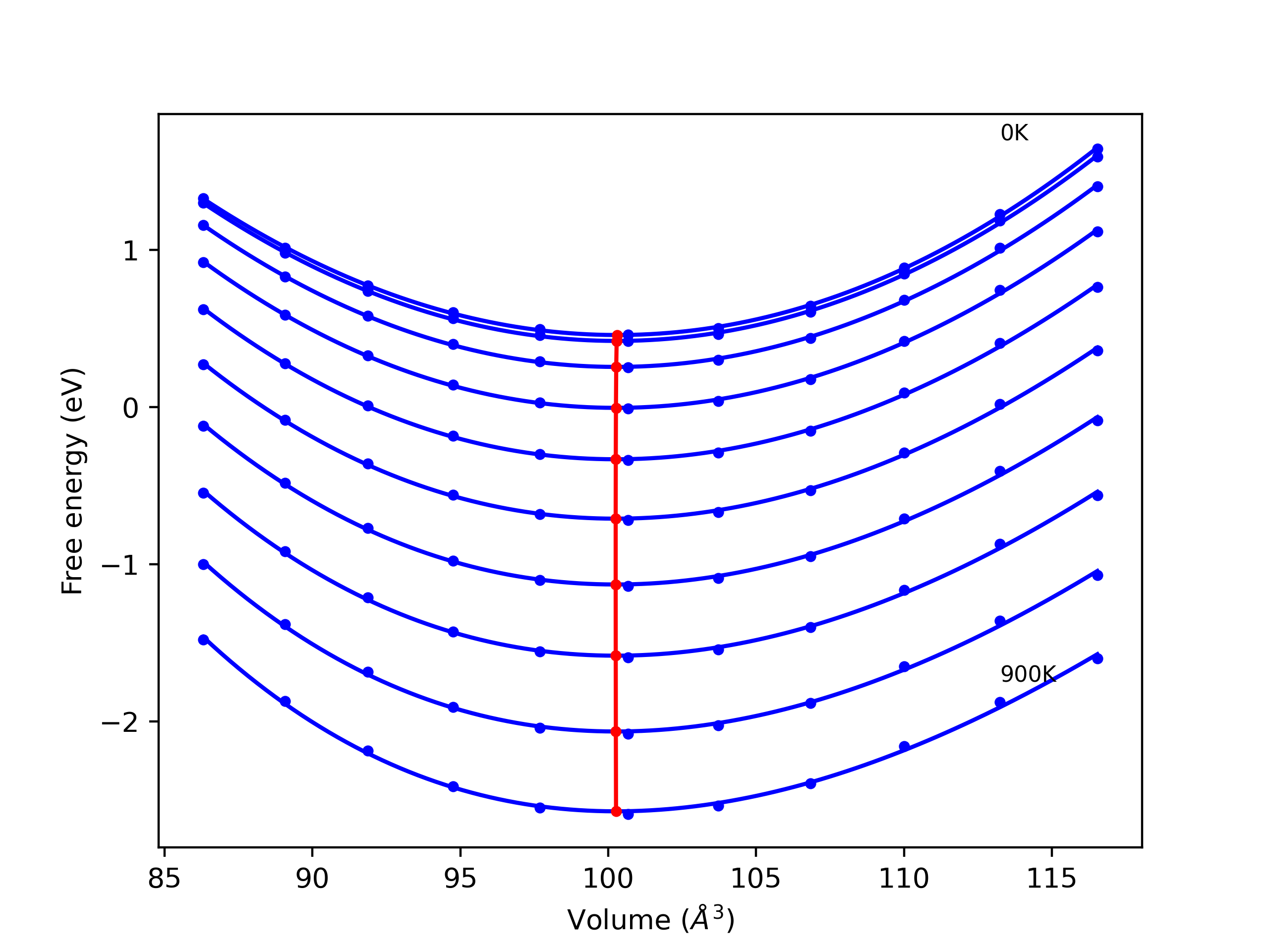 Phonon band structures and crystal properties estimated from quasi-harmonic approximation (QHA) calculations are displayed for select crystals. The calculations were performed using phonopy and LAMMPS. For the phonon calculations, 3x3 supercells of the potential-specific relaxed crystals were used. The QHA calculations were based on 11 strain states ranging from -0.05 to 0.05.