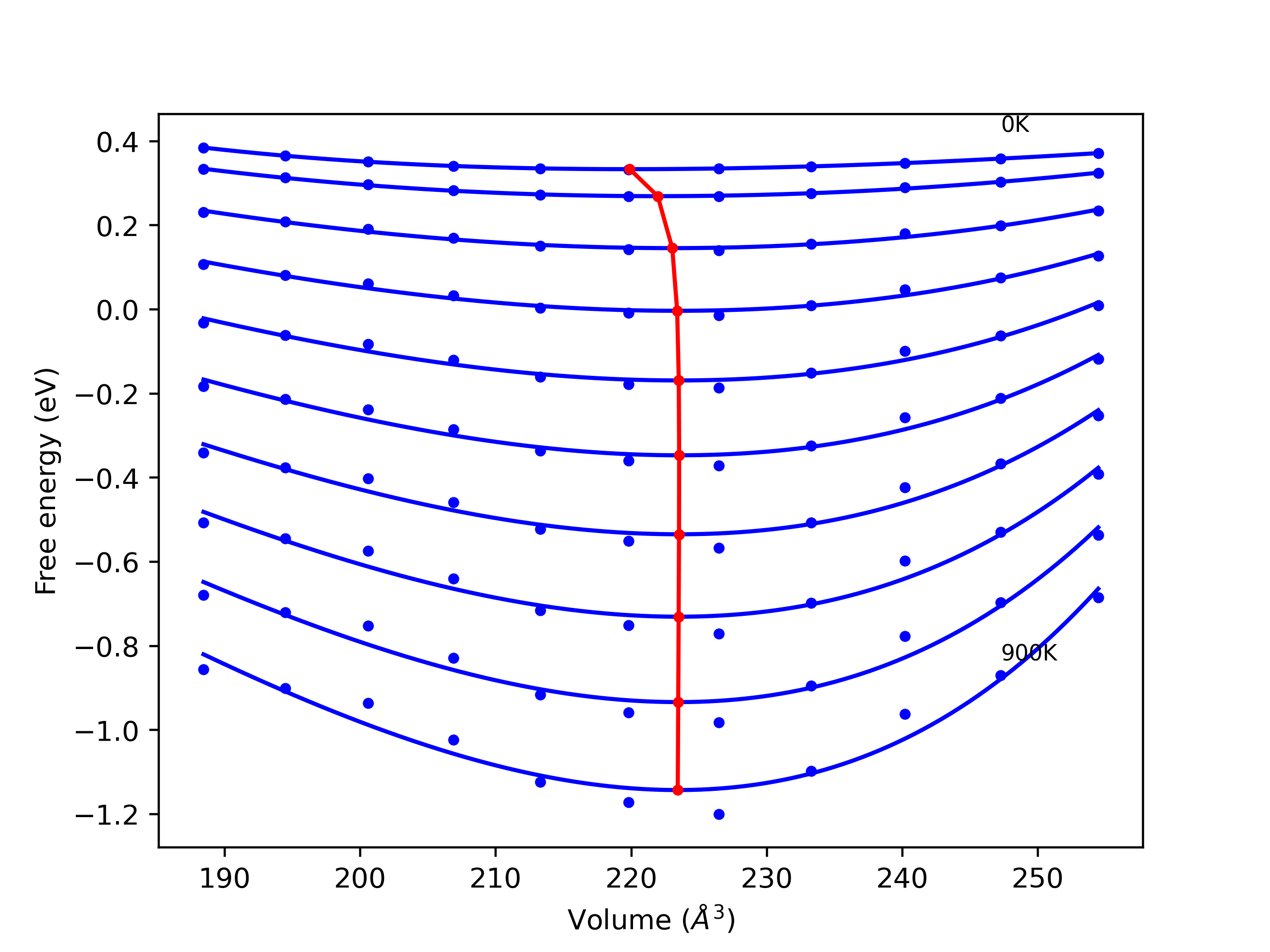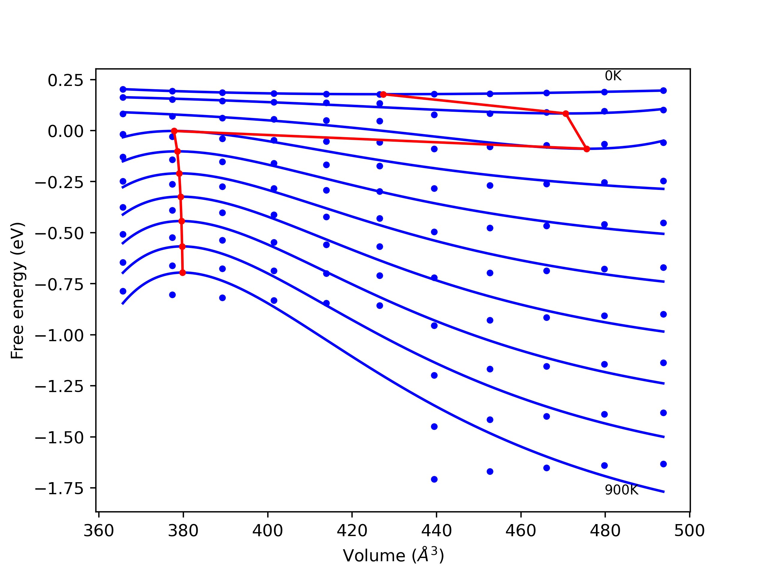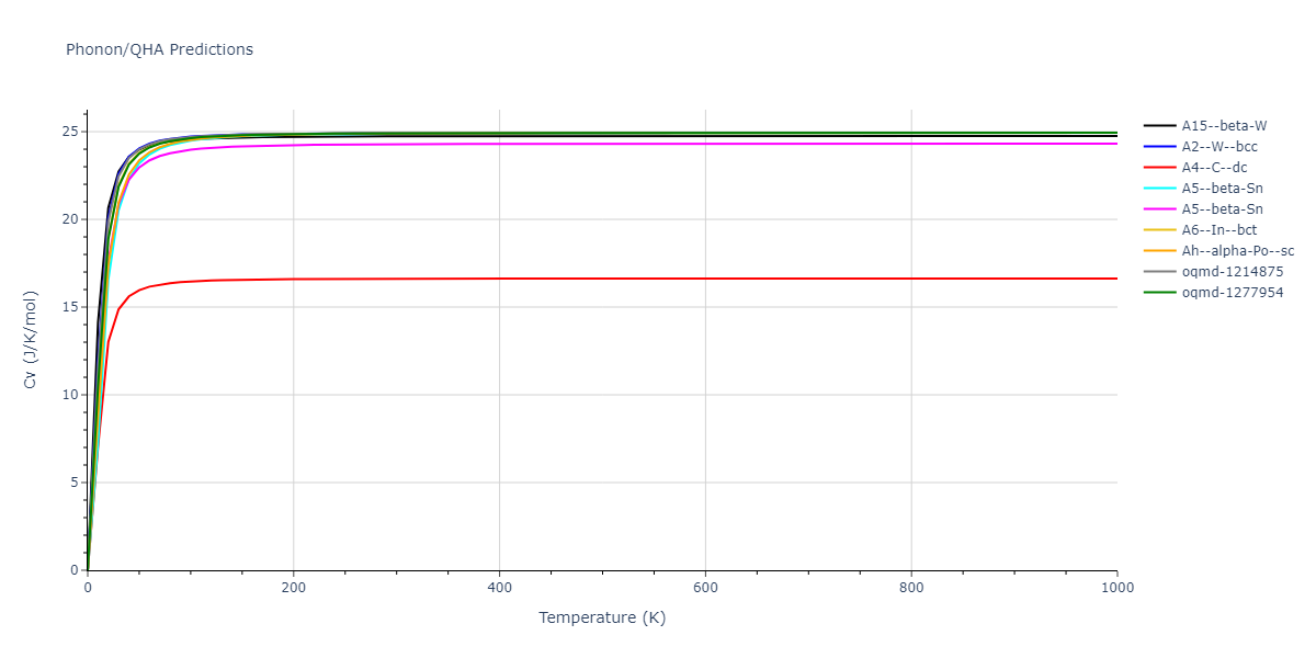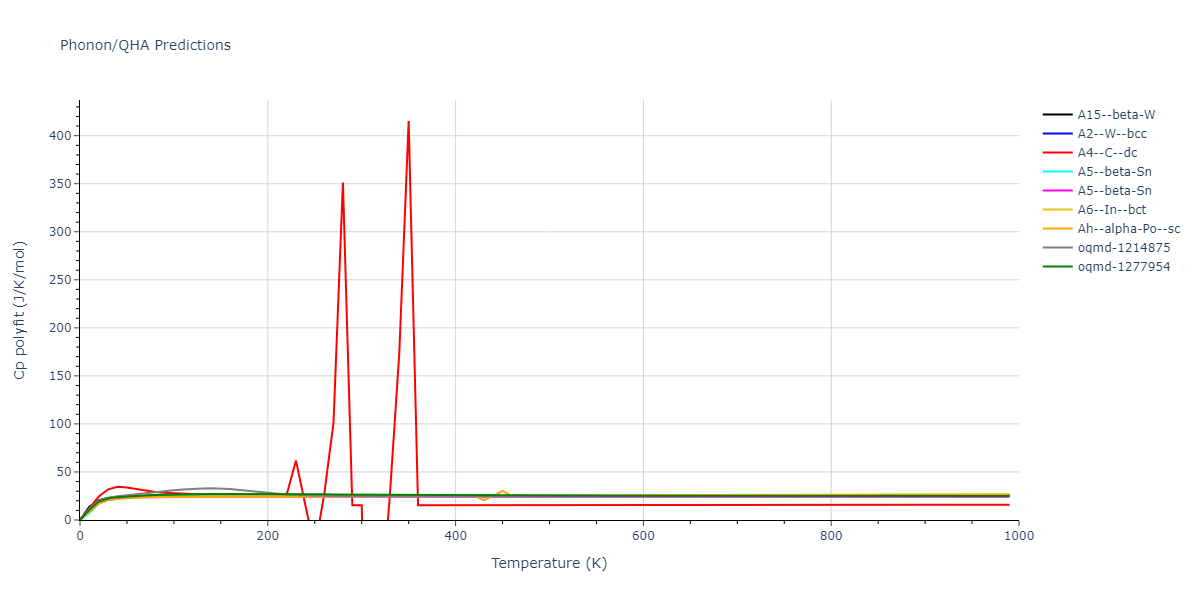 Phonon band structures and crystal properties estimated from quasi-harmonic approximation (QHA) calculations are displayed for select crystals. The calculations were performed using phonopy and LAMMPS. For the phonon calculations, 3x3 supercells of the potential-specific relaxed crystals were used. The QHA calculations were based on 11 strain states ranging from -0.05 to 0.05.