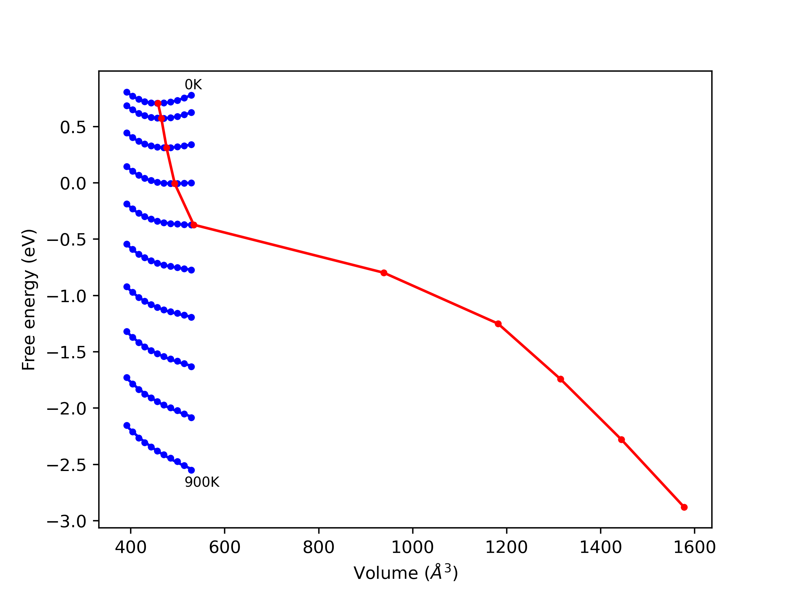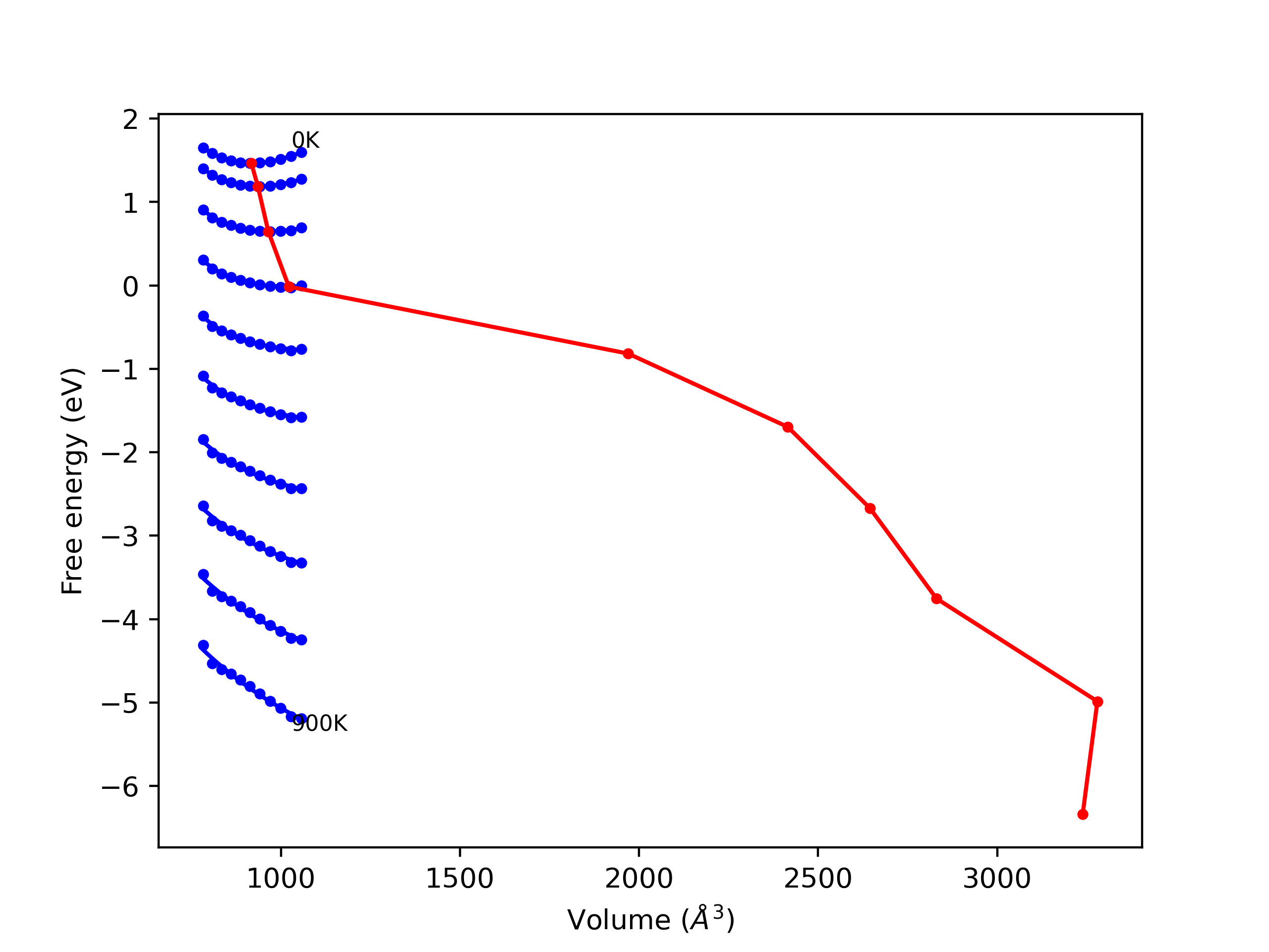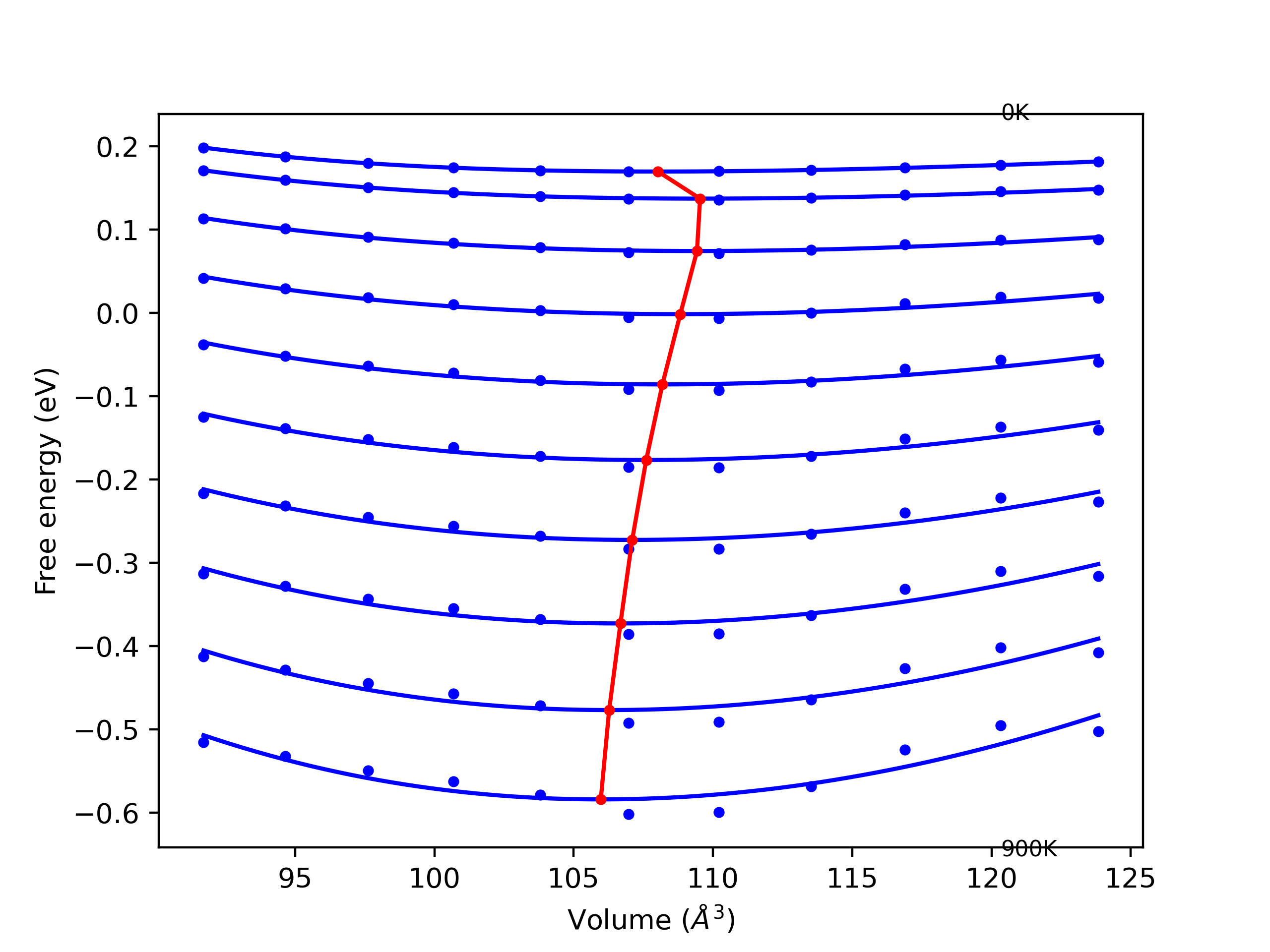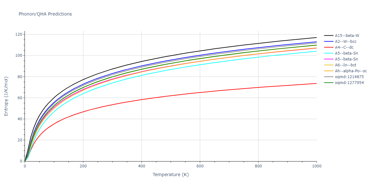 Plots of internal energy, Gibbs free energy, entropy, heat capacity and volume are shown here as a function of temperature for various crystal structures and liquid phases. The included crystal structures correspond to those in the Solid Structures vs. Temperature section, and the liquid phases to those in the Liquid Properties section. Internal energy and volume are taken from the associated structure relaxations mentioned in those previous sections. Constant pressure heat capacity is estimated using 3-point numerical derivatives of enthalpy versus temperature. Note that since all simulations done here are at 0 pressure, internal energy and enthalpy are equivalent.