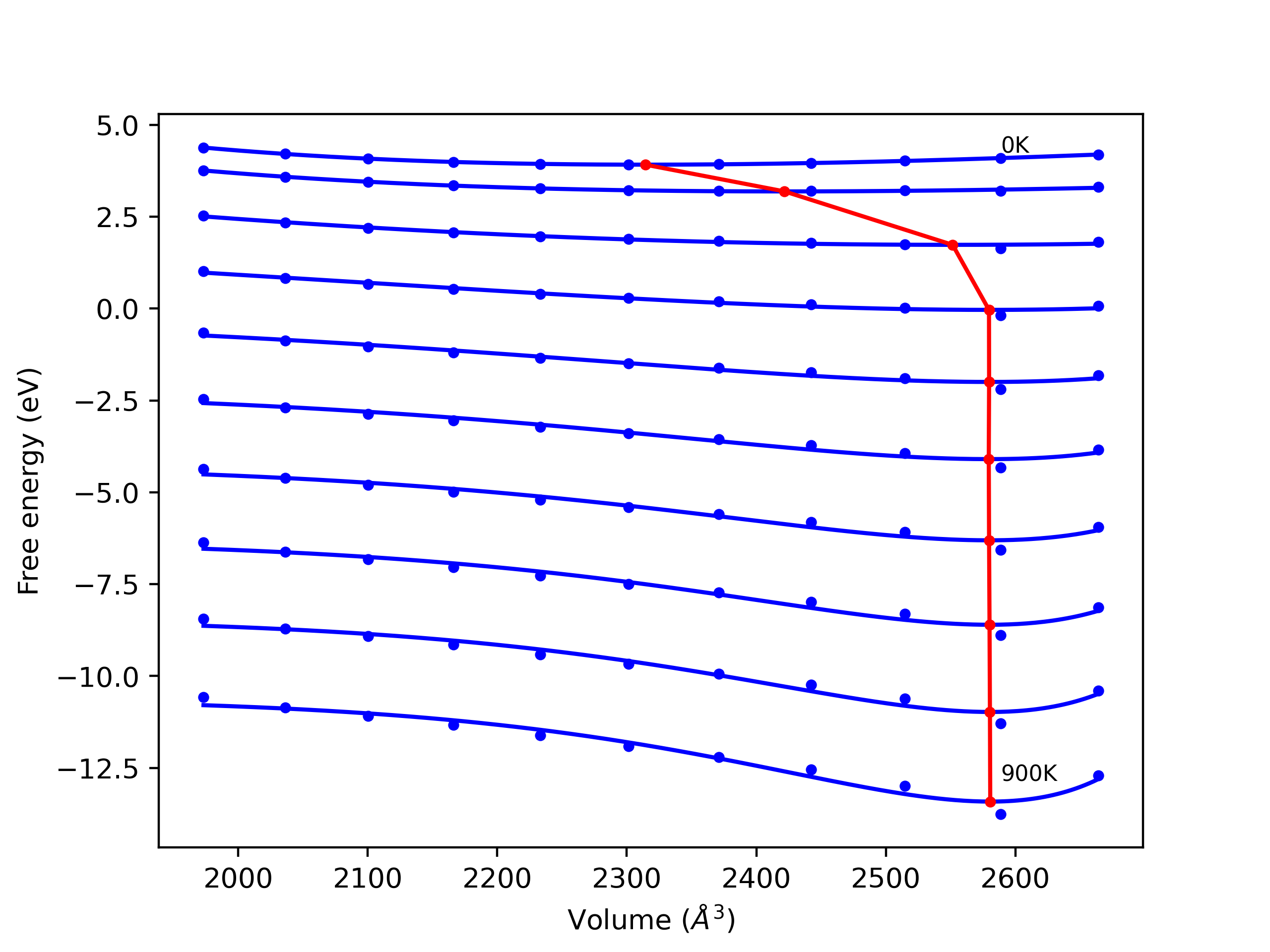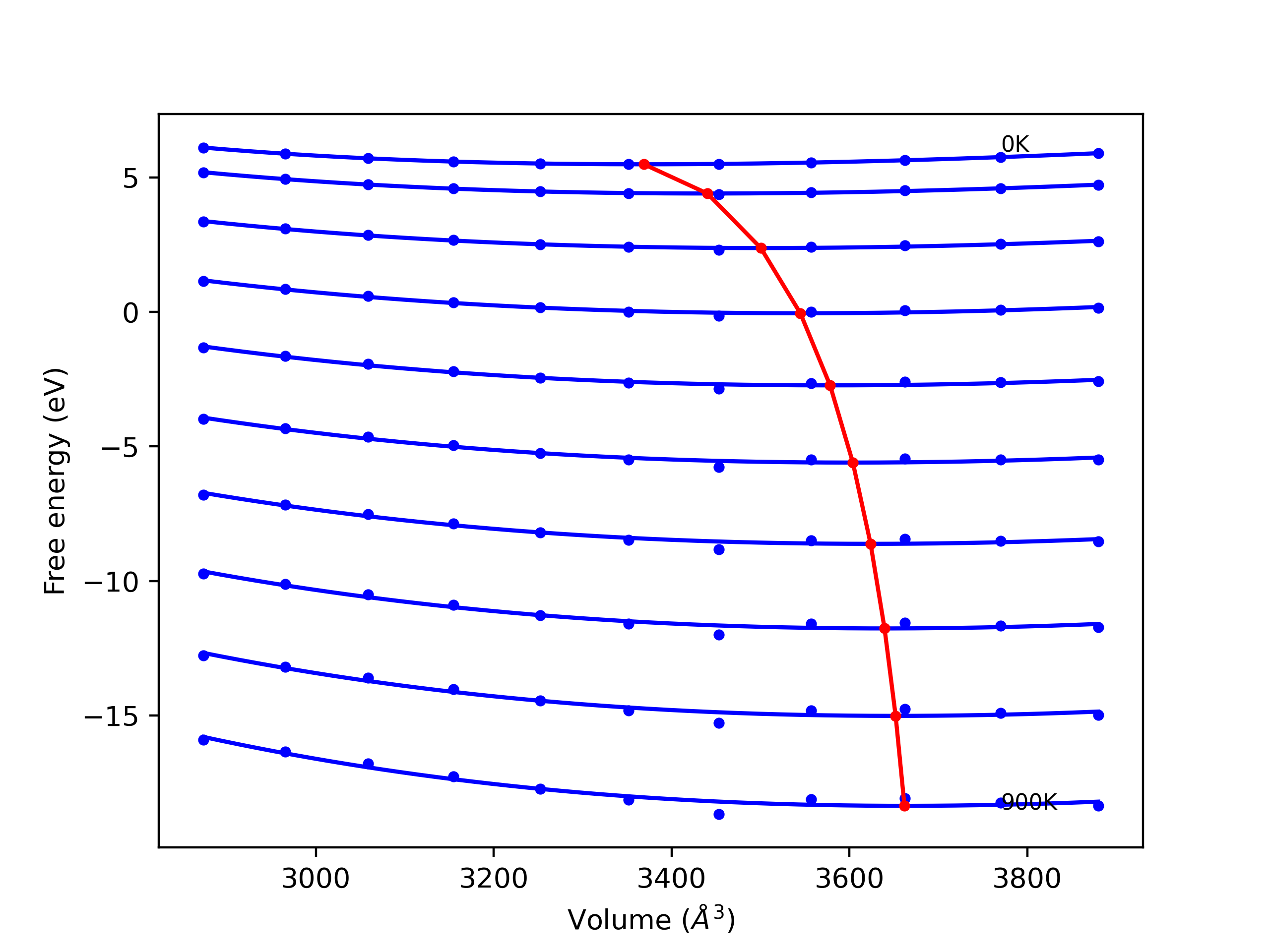 The Gibbs energies of the phases are estimated using thermodynamic integration between the interatomic potential in question and a simpler model with known Gibbs free energy values. For solids, the reference model is an Einstein solid, while for liquids it is the Uhlenbeck-Ford potential. Besides a short run at the start of the solid calculations to estimate Einstein model spring constants, the two calculations proceed similarly. Starting with the final relaxation configurations, the systems are stabilized for 25,000 steps. Then, over the next 50,000 steps the potential is swapped out for the reference potential. The system is then stabilized for another 25,000 steps with the reference model before a reverse swap of 50,000 steps is performed. The simulation ends with one final 25,000 step stabilization period. From the simulation, the irreversible work of transformation is estimated and used to compute the absolute Gibbs free energy of the target phase and potential relative to the reference potential. Entropy is estimated as the difference in enthalpy and Gibbs free energy and divided by temperature.