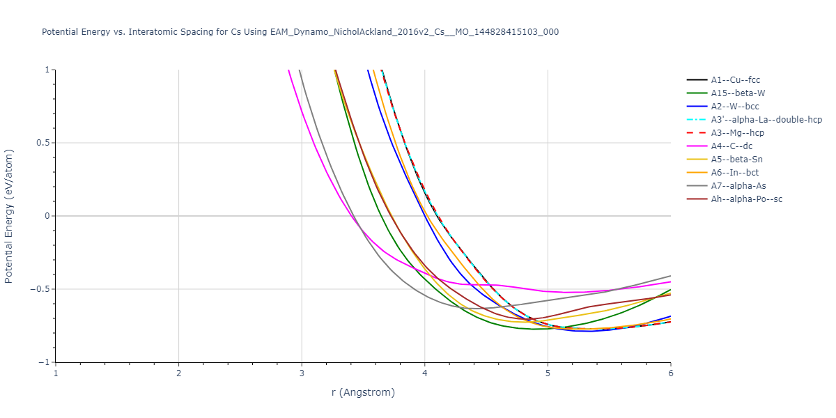 Plots of potential energy vs interatomic spacing, r, are shown below for a number of crystal structures. The structures are generated based on the ideal atomic positions and b/a and c/a lattice parameter ratios for a given crystal prototype. The size of the system is then uniformly scaled, and the energy calculated without relaxing the system. To obtain these plots, values of r are evaluated every 0.02 Å up to 6 Å.