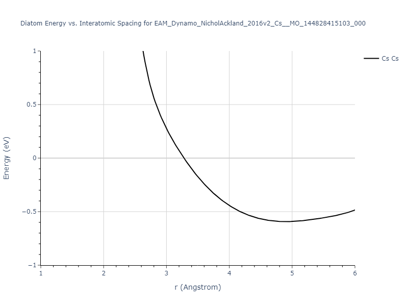 Plots of the potential energy vs interatomic spacing, r, are shown below for all diatom sets associated with the interatomic potential. This calculation provides insights into the functional form of the potential's two-body interactions. A system consisting of only two atoms is created, and the potential energy is evaluated for the atoms separated by 0.02 Å <= r <= 6.0> Å in intervals of 0.02 Å. Two plots are shown: one for the "standard" interaction distance range, and one for small values of r. The small r plot is useful for determining whether the potential is suitable for radiation studies.