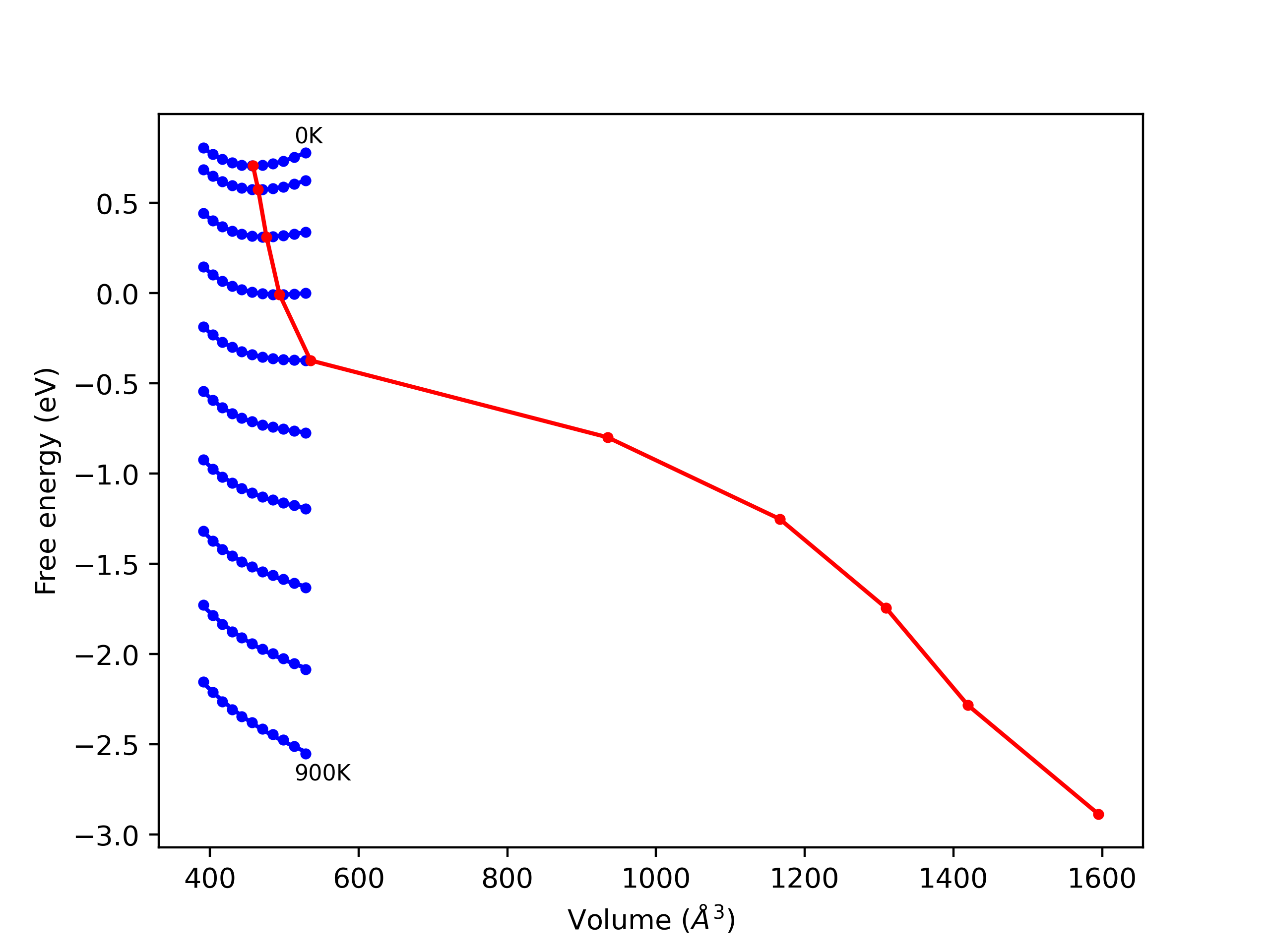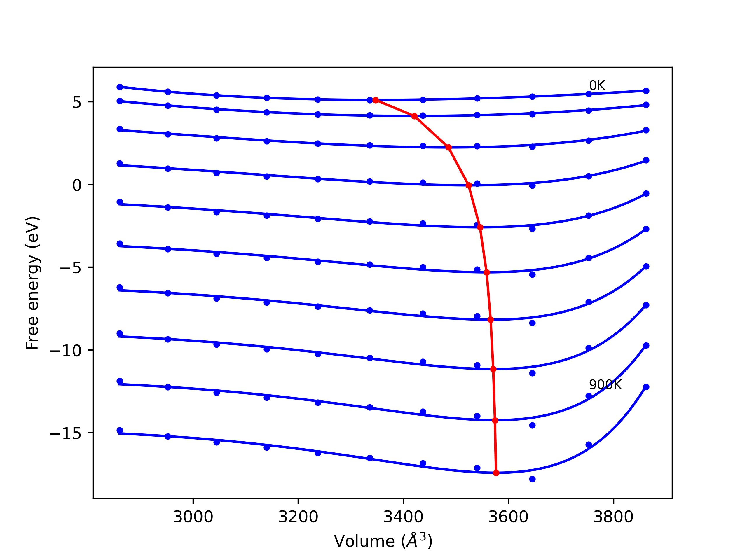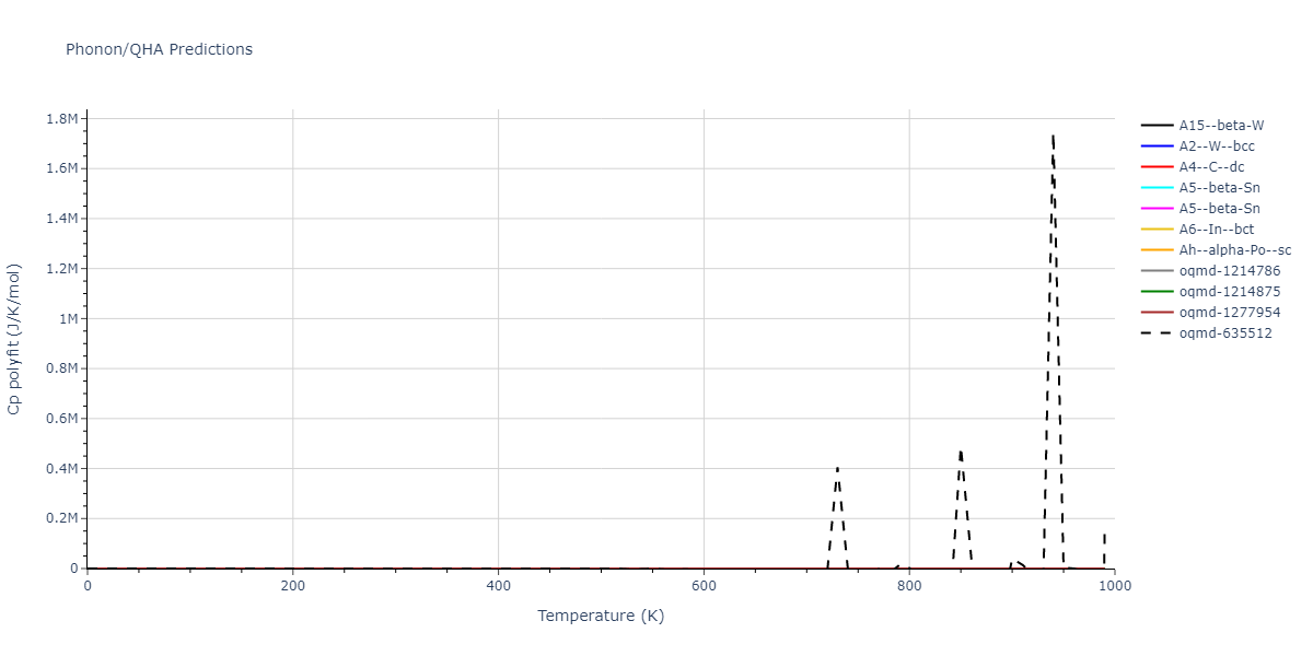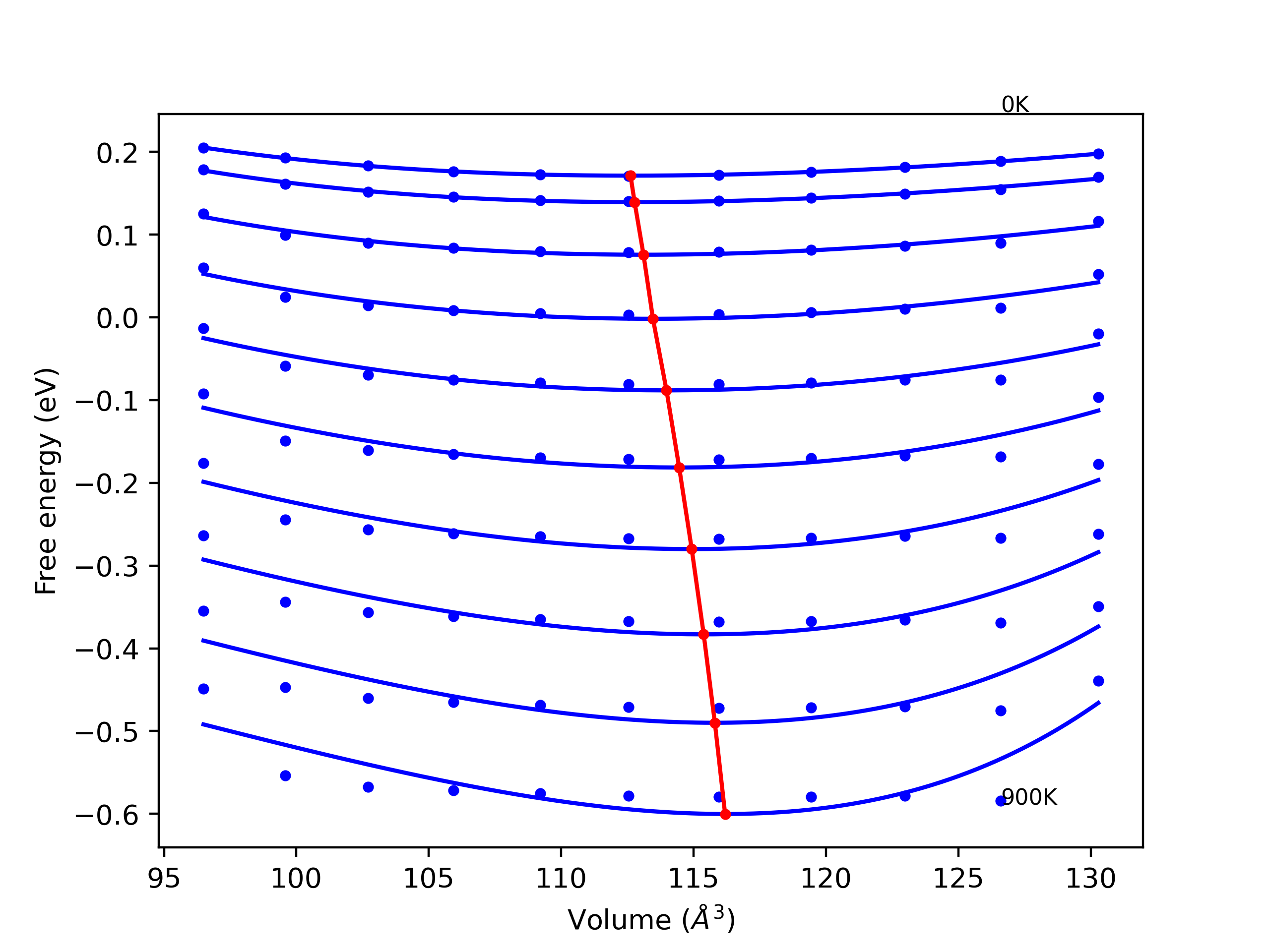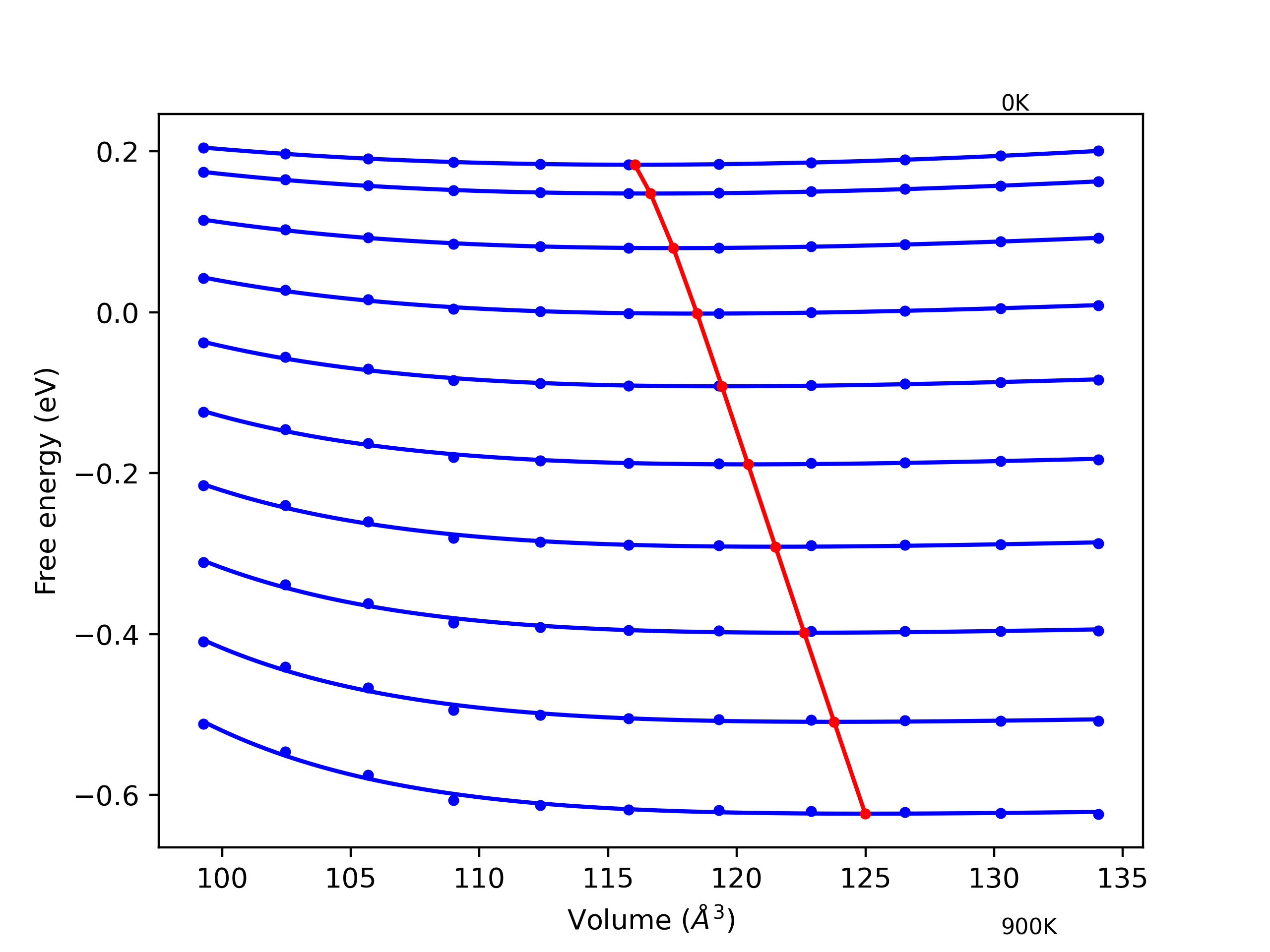 Phonon band structures and crystal properties estimated from quasi-harmonic approximation (QHA) calculations are displayed for select crystals. The calculations were performed using phonopy and LAMMPS. For the phonon calculations, 3x3 supercells of the potential-specific relaxed crystals were used. The QHA calculations were based on 11 strain states ranging from -0.05 to 0.05.