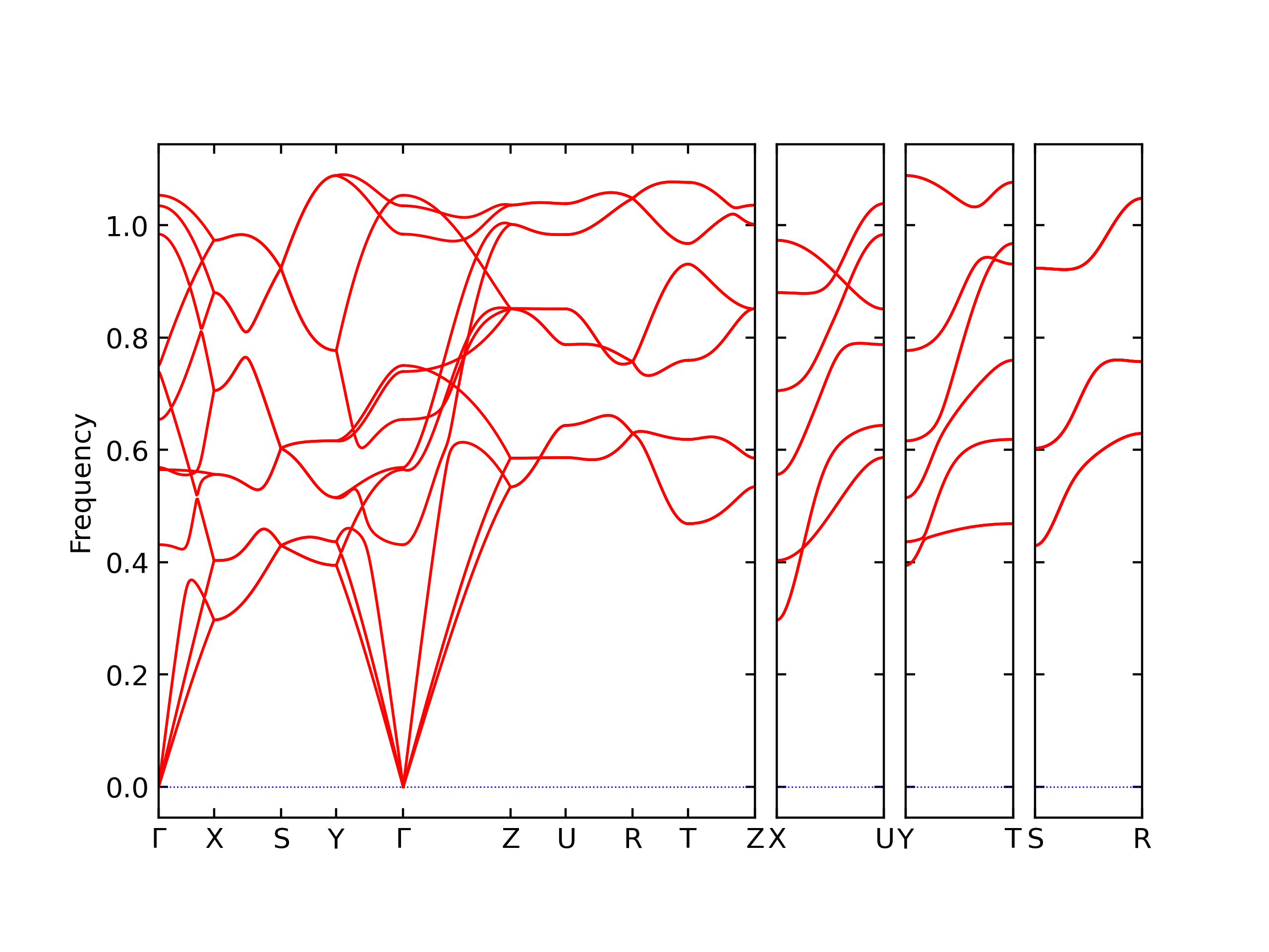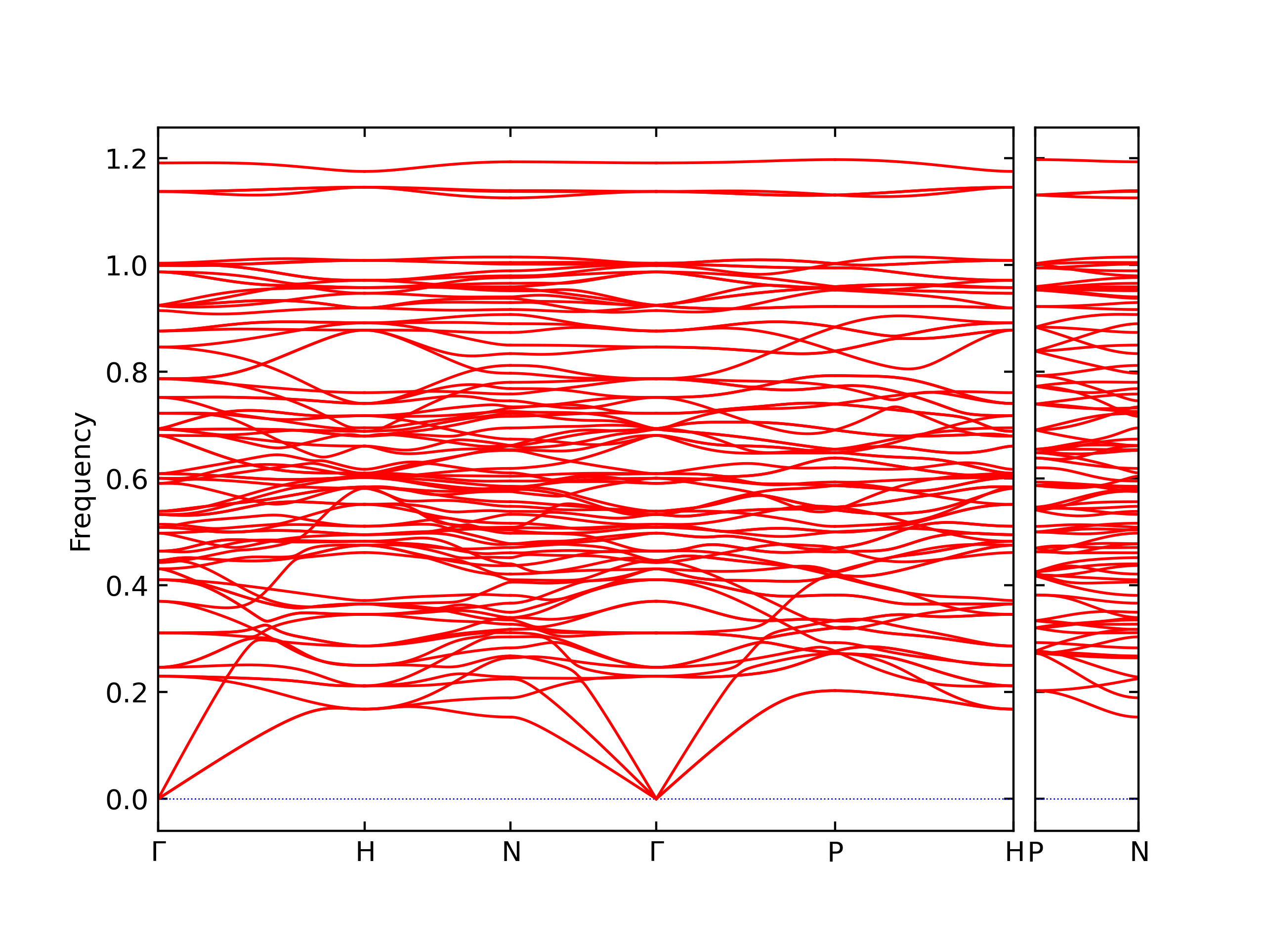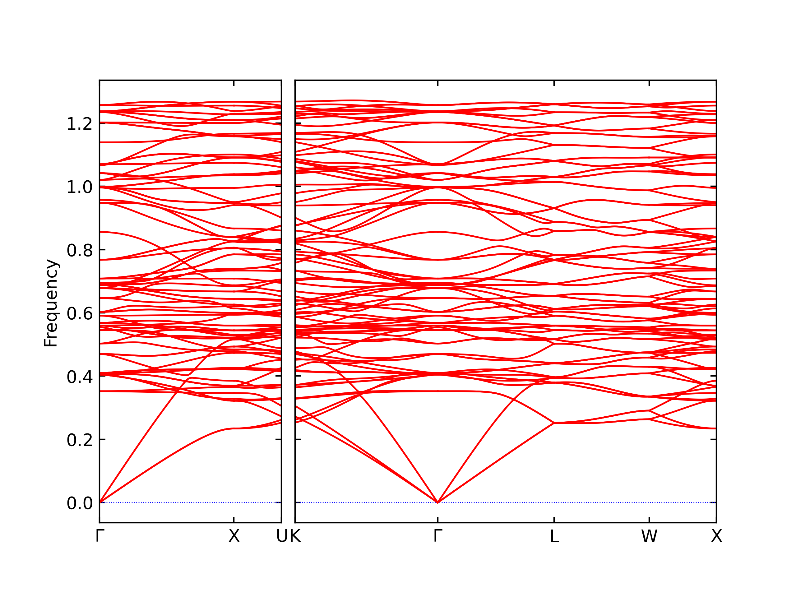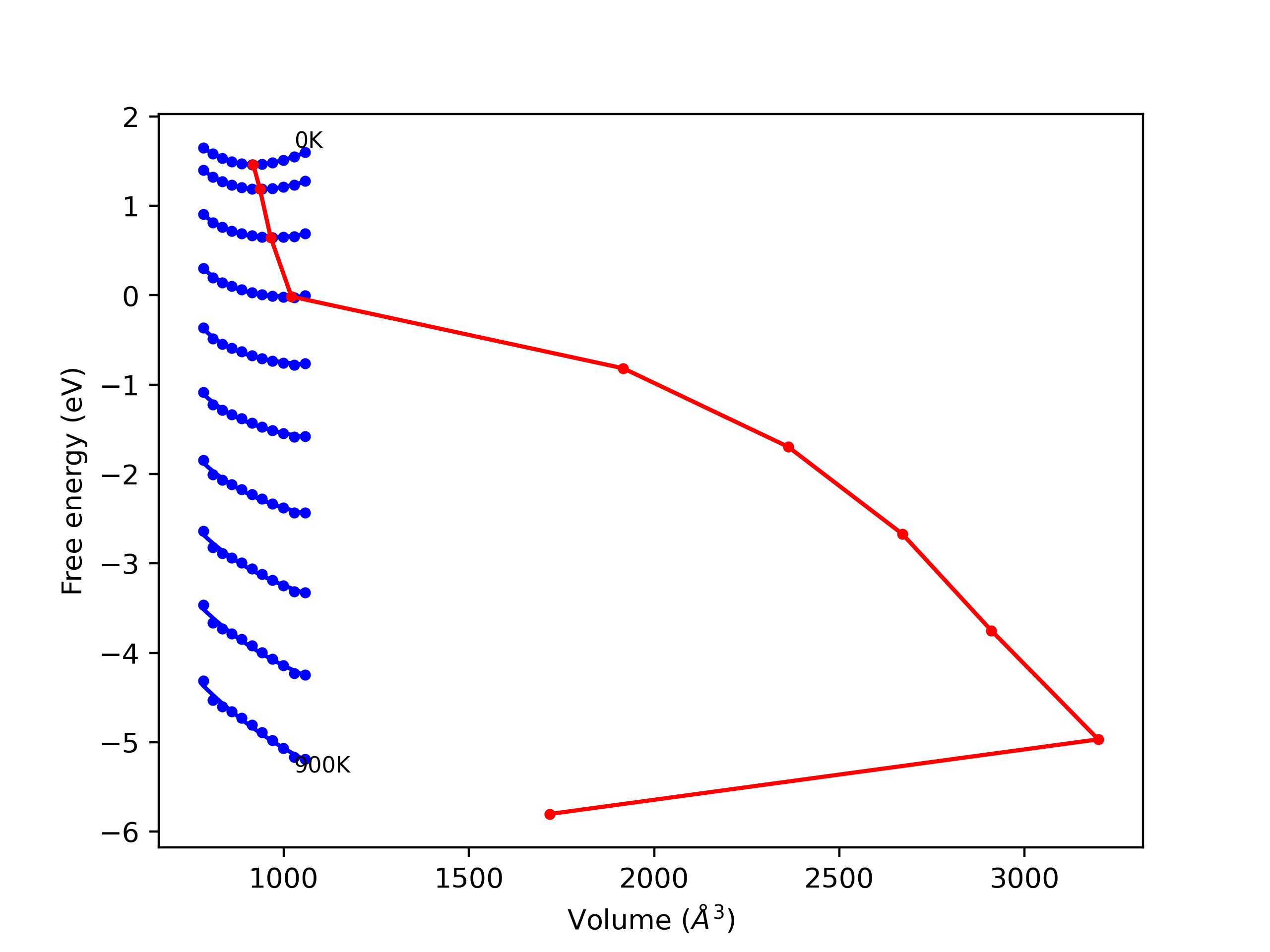 Phonon band structures and crystal properties estimated from quasi-harmonic approximation (QHA) calculations are displayed for select crystals. The calculations were performed using phonopy and LAMMPS. For the phonon calculations, 3x3 supercells of the potential-specific relaxed crystals were used. The QHA calculations were based on 11 strain states ranging from -0.05 to 0.05.