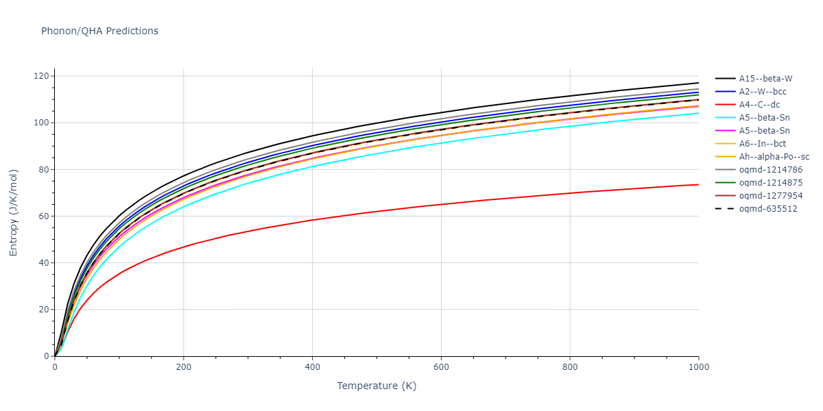 The Gibbs energies of the phases are estimated using thermodynamic integration between the interatomic potential in question and a simpler model with known Gibbs free energy values. For solids, the reference model is an Einstein solid, while for liquids it is the Uhlenbeck-Ford potential. Besides a short run at the start of the solid calculations to estimate Einstein model spring constants, the two calculations proceed similarly. Starting with the final relaxation configurations, the systems are stabilized for 25,000 steps. Then, over the next 50,000 steps the potential is swapped out for the reference potential. The system is then stabilized for another 25,000 steps with the reference model before a reverse swap of 50,000 steps is performed. The simulation ends with one final 25,000 step stabilization period. From the simulation, the irreversible work of transformation is estimated and used to compute the absolute Gibbs free energy of the target phase and potential relative to the reference potential. Entropy is estimated as the difference in enthalpy and Gibbs free energy and divided by temperature.