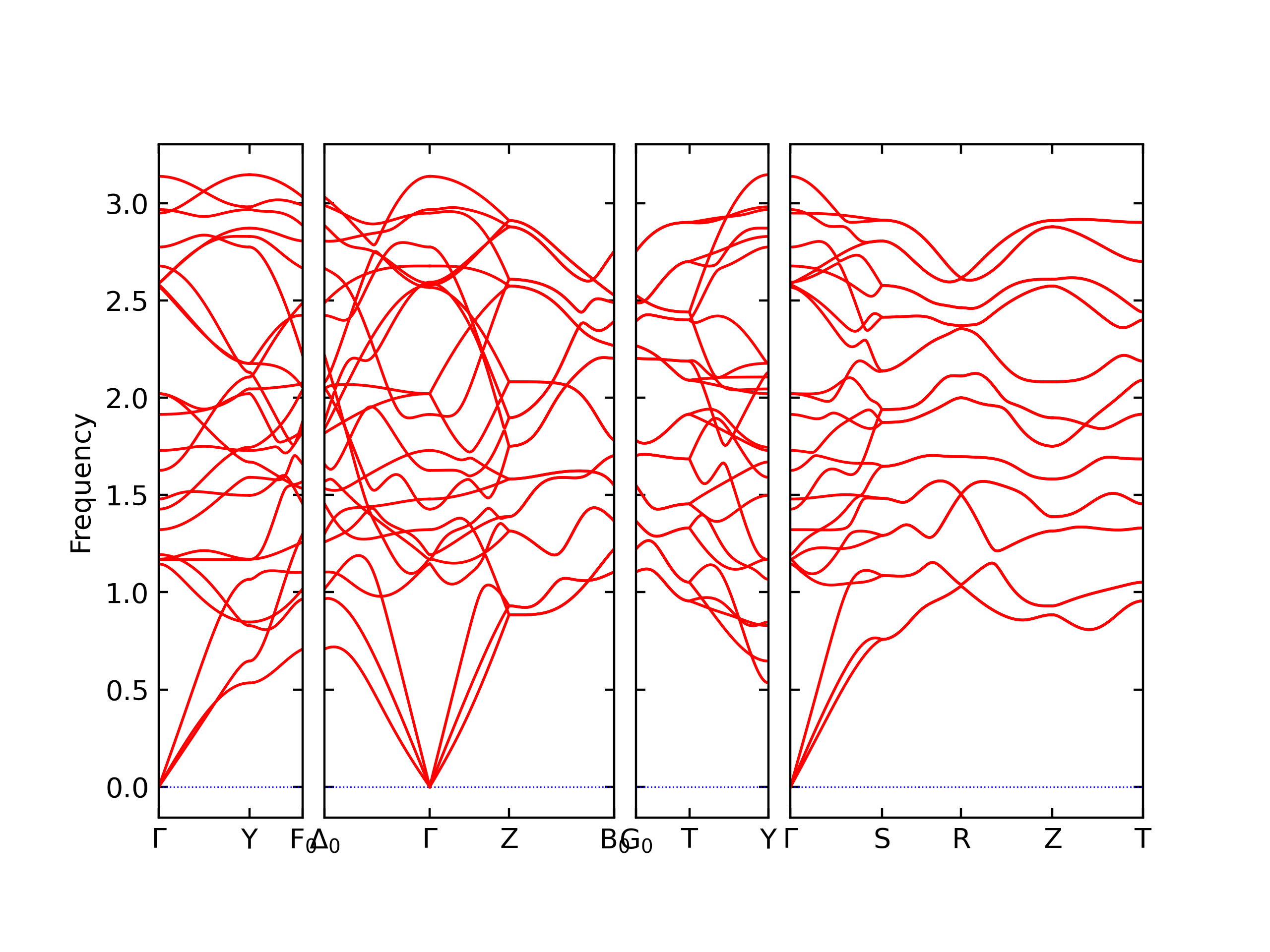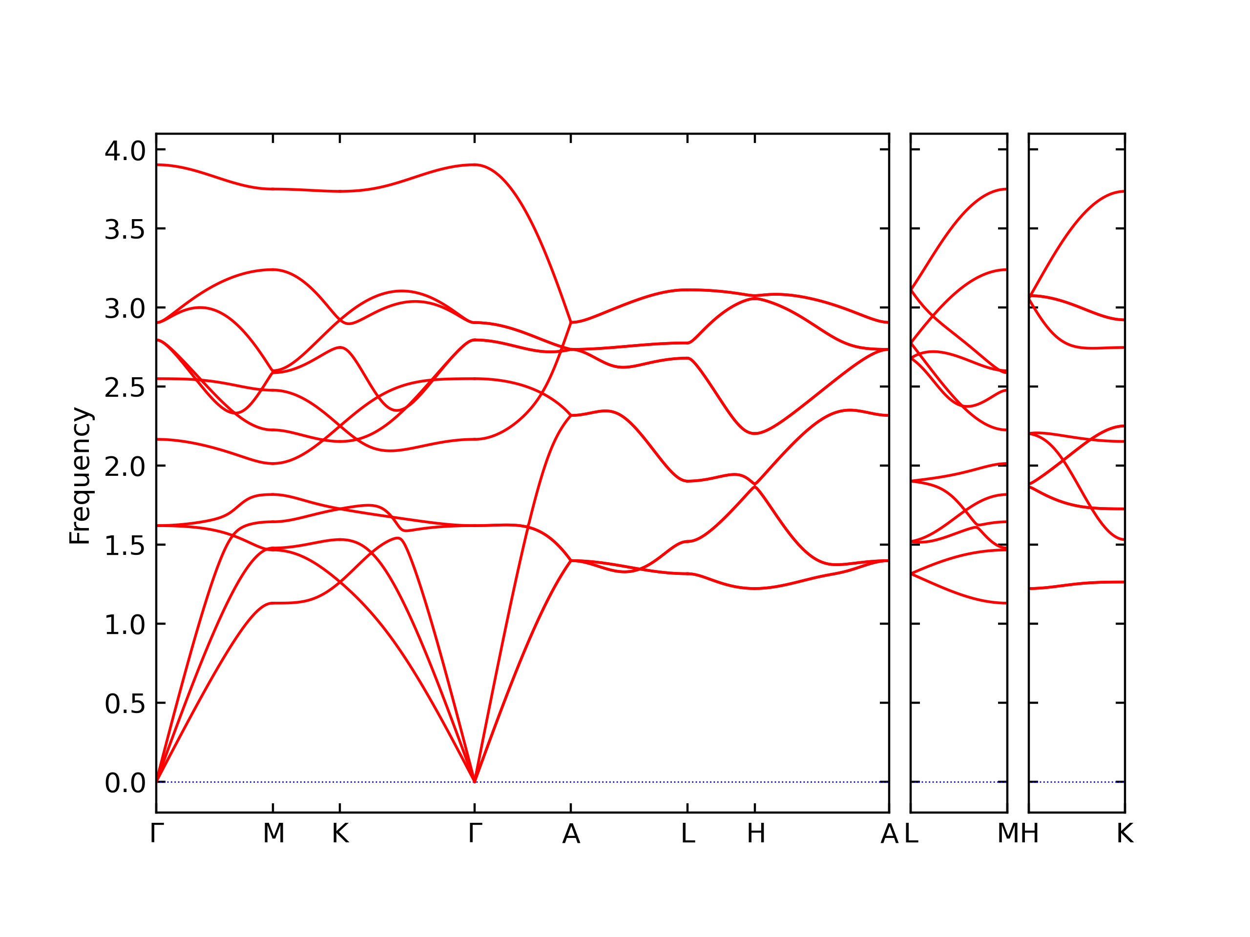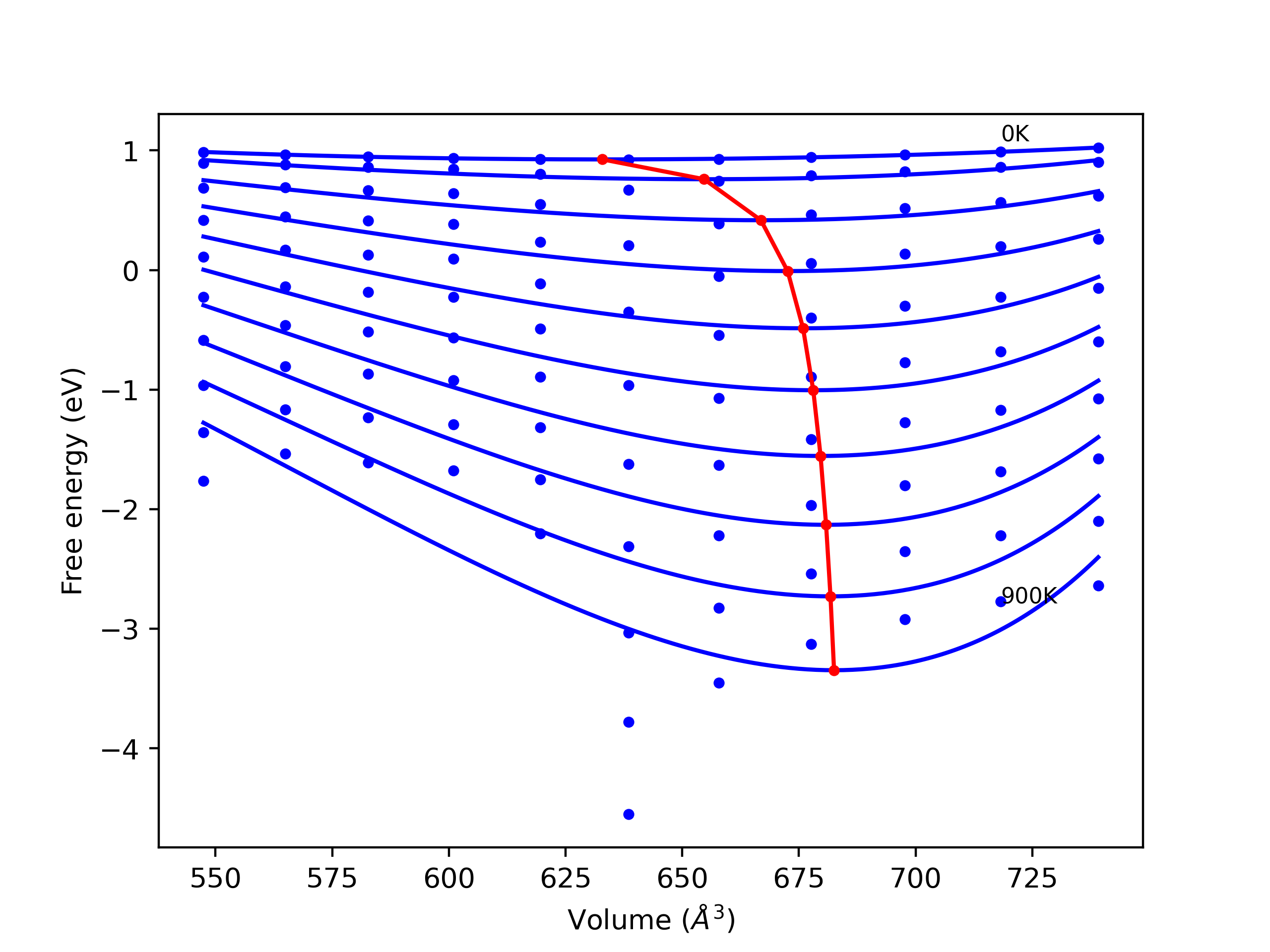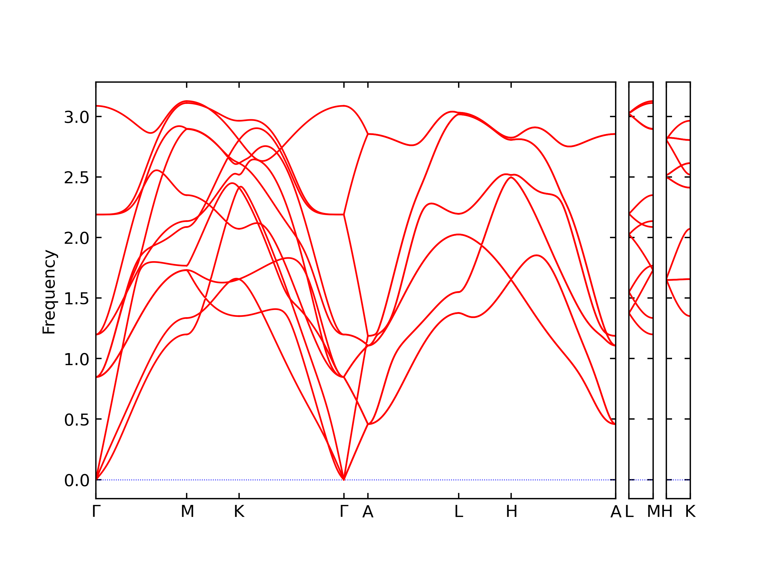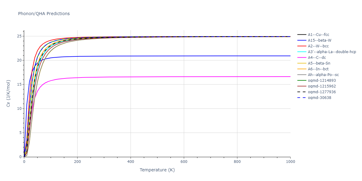 Phonon band structures and crystal properties estimated from quasi-harmonic approximation (QHA) calculations are displayed for select crystals. The calculations were performed using phonopy and LAMMPS. For the phonon calculations, 3x3 supercells of the potential-specific relaxed crystals were used. The QHA calculations were based on 11 strain states ranging from -0.05 to 0.05.