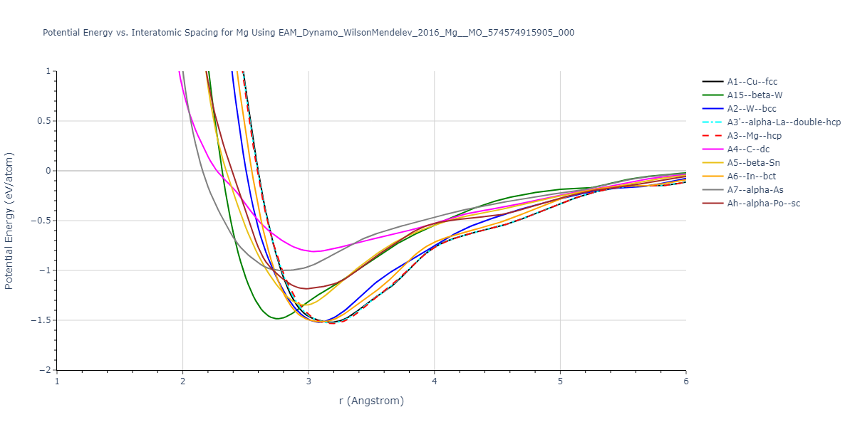 Plots of potential energy vs interatomic spacing, r, are shown below for a number of crystal structures. The structures are generated based on the ideal atomic positions and b/a and c/a lattice parameter ratios for a given crystal prototype. The size of the system is then uniformly scaled, and the energy calculated without relaxing the system. To obtain these plots, values of r are evaluated every 0.02 Å up to 6 Å.