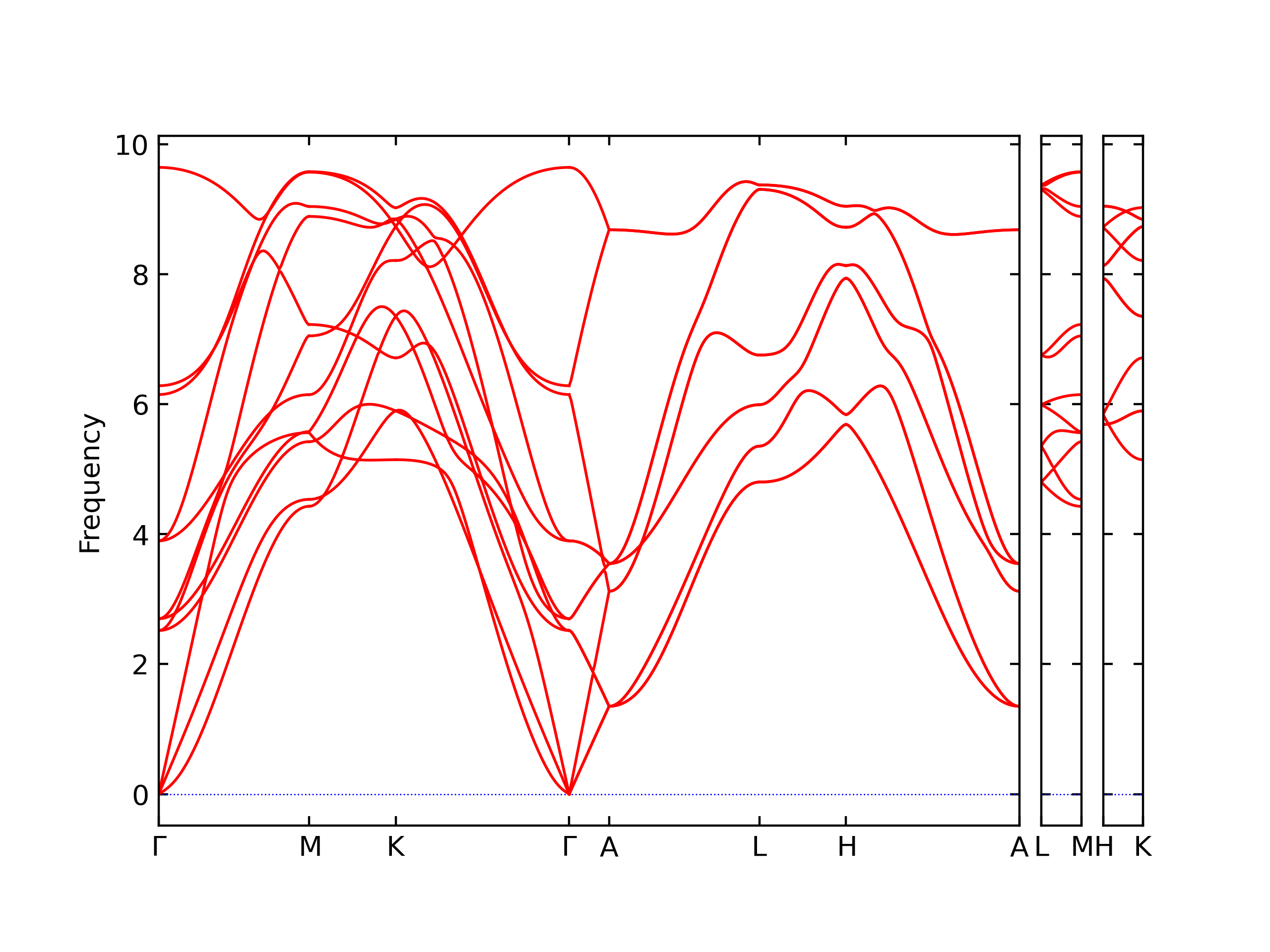 Phonon band structures and crystal properties estimated from quasi-harmonic approximation (QHA) calculations are displayed for select crystals. The calculations were performed using phonopy and LAMMPS. For the phonon calculations, 3x3 supercells of the potential-specific relaxed crystals were used. The QHA calculations were based on 11 strain states ranging from -0.05 to 0.05.
