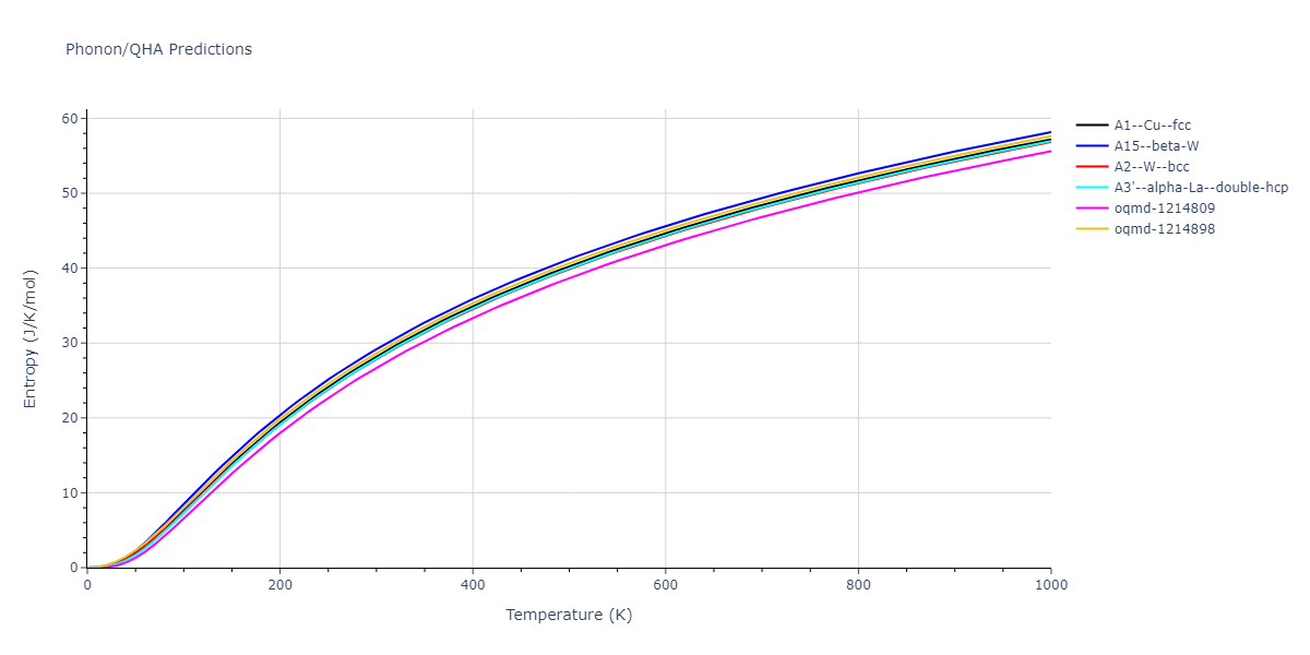 The Gibbs energies of the phases are estimated using thermodynamic integration between the interatomic potential in question and a simpler model with known Gibbs free energy values. For solids, the reference model is an Einstein solid, while for liquids it is the Uhlenbeck-Ford potential. Besides a short run at the start of the solid calculations to estimate Einstein model spring constants, the two calculations proceed similarly. Starting with the final relaxation configurations, the systems are stabilized for 25,000 steps. Then, over the next 50,000 steps the potential is swapped out for the reference potential. The system is then stabilized for another 25,000 steps with the reference model before a reverse swap of 50,000 steps is performed. The simulation ends with one final 25,000 step stabilization period. From the simulation, the irreversible work of transformation is estimated and used to compute the absolute Gibbs free energy of the target phase and potential relative to the reference potential. Entropy is estimated as the difference in enthalpy and Gibbs free energy and divided by temperature.