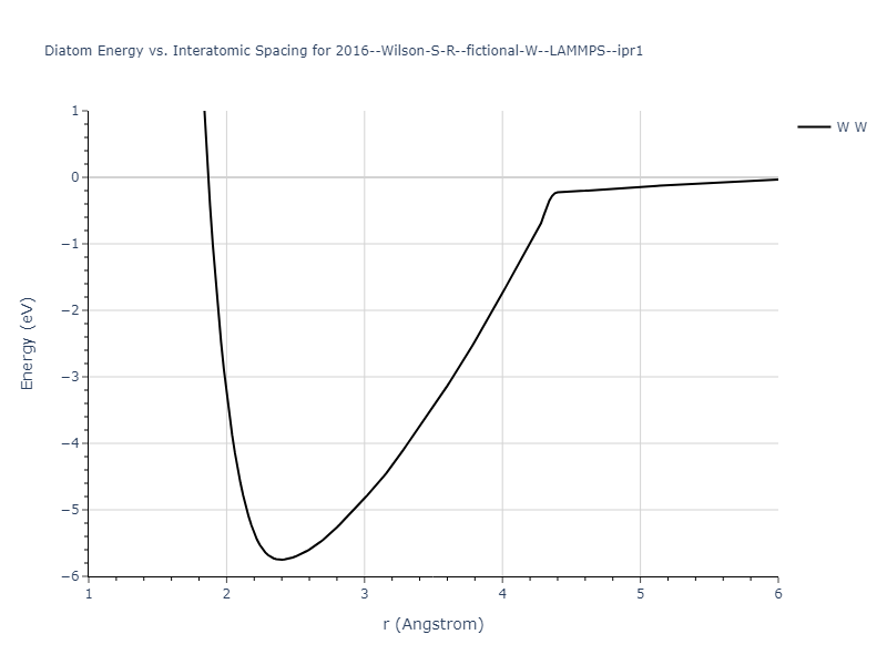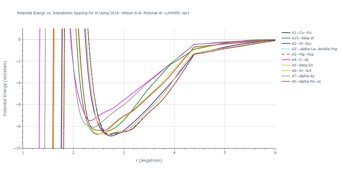 Plots of potential energy vs interatomic spacing, r, are shown below for a number of crystal structures. The structures are generated based on the ideal atomic positions and b/a and c/a lattice parameter ratios for a given crystal prototype. The size of the system is then uniformly scaled, and the energy calculated without relaxing the system. To obtain these plots, values of r are evaluated every 0.02 Å up to 6 Å.
