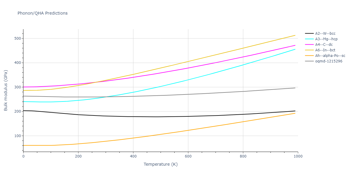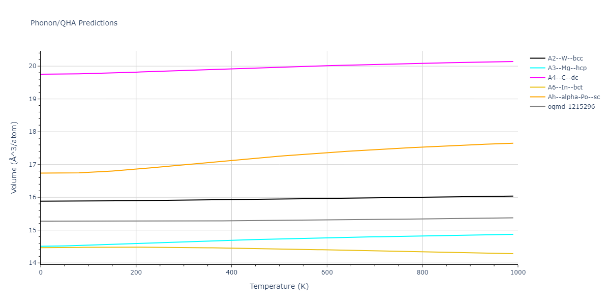 Phonon band structures and crystal properties estimated from quasi-harmonic approximation (QHA) calculations are displayed for select crystals. The calculations were performed using phonopy and LAMMPS. For the phonon calculations, 3x3 supercells of the potential-specific relaxed crystals were used. The QHA calculations were based on 11 strain states ranging from -0.05 to 0.05.