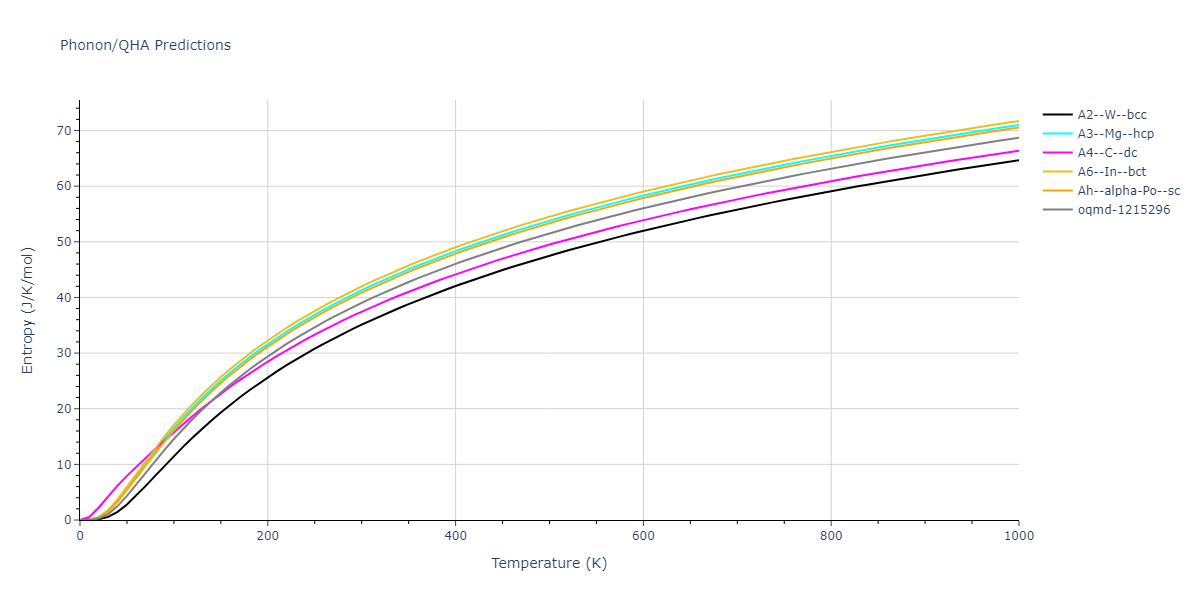 The Gibbs energies of the phases are estimated using thermodynamic integration between the interatomic potential in question and a simpler model with known Gibbs free energy values. For solids, the reference model is an Einstein solid, while for liquids it is the Uhlenbeck-Ford potential. Besides a short run at the start of the solid calculations to estimate Einstein model spring constants, the two calculations proceed similarly. Starting with the final relaxation configurations, the systems are stabilized for 25,000 steps. Then, over the next 50,000 steps the potential is swapped out for the reference potential. The system is then stabilized for another 25,000 steps with the reference model before a reverse swap of 50,000 steps is performed. The simulation ends with one final 25,000 step stabilization period. From the simulation, the irreversible work of transformation is estimated and used to compute the absolute Gibbs free energy of the target phase and potential relative to the reference potential. Entropy is estimated as the difference in enthalpy and Gibbs free energy and divided by temperature.