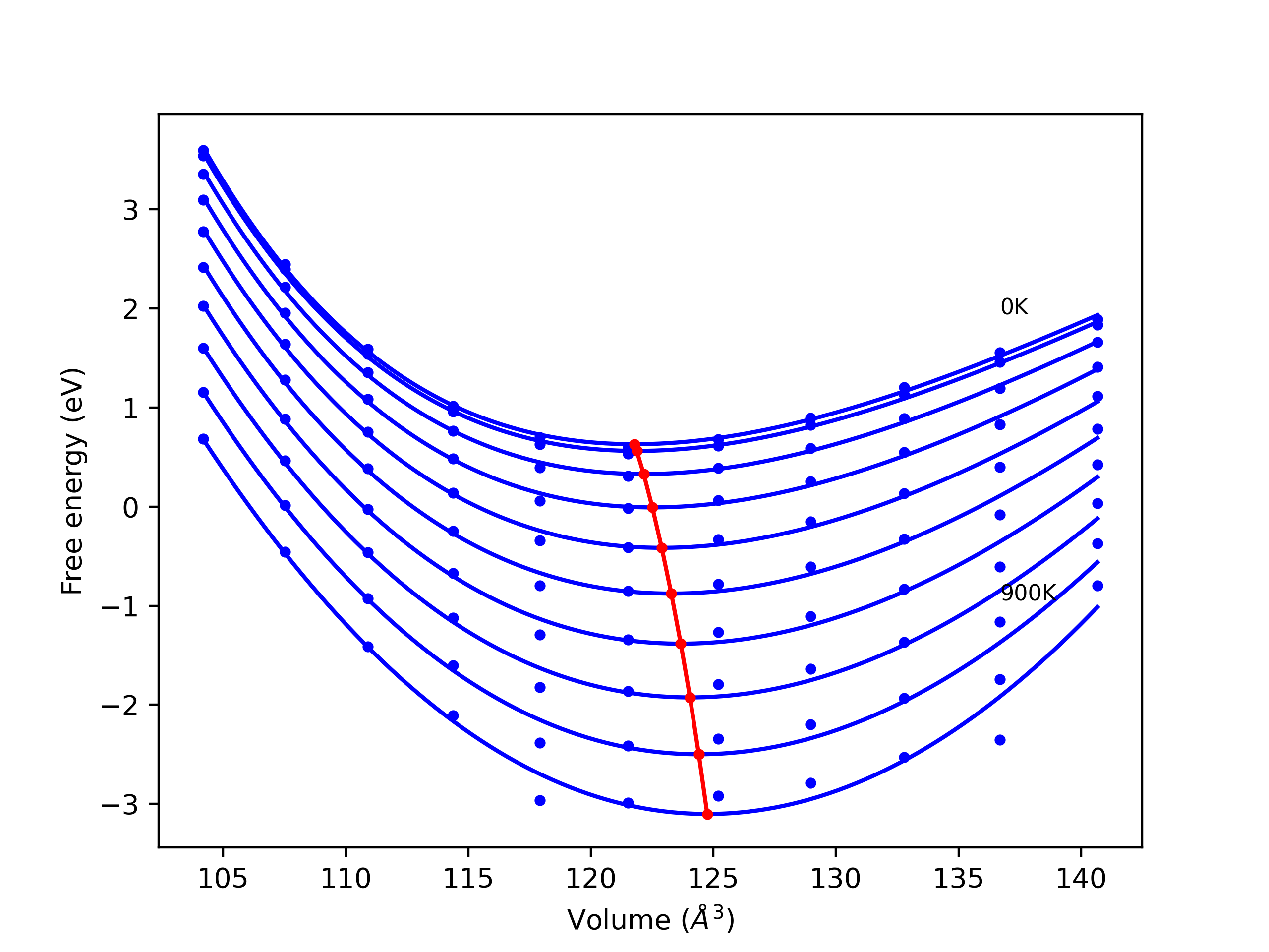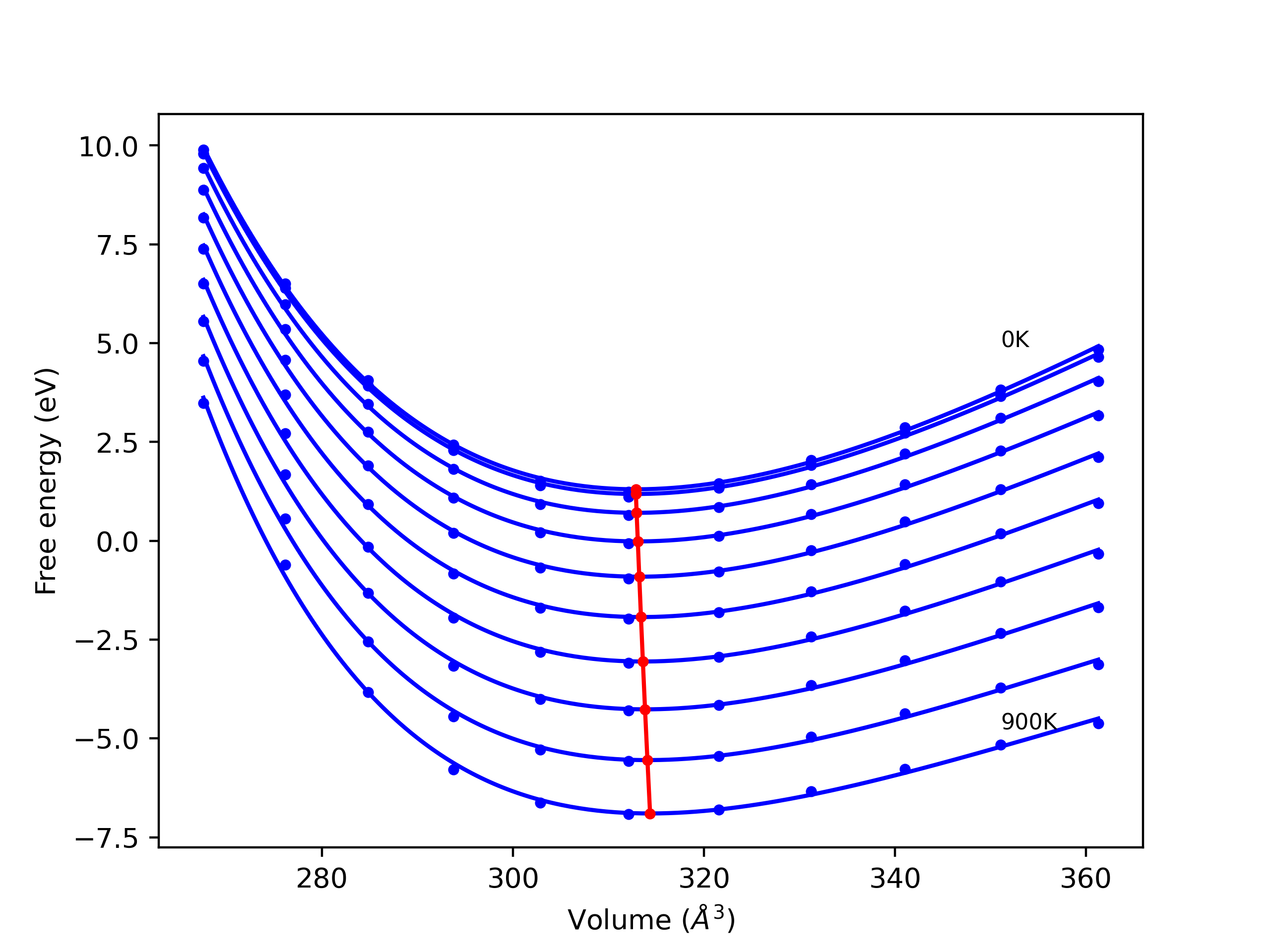 Plots of internal energy, Gibbs free energy, entropy, heat capacity and volume are shown here as a function of temperature for various crystal structures and liquid phases. The included crystal structures correspond to those in the Solid Structures vs. Temperature section, and the liquid phases to those in the Liquid Properties section. Internal energy and volume are taken from the associated structure relaxations mentioned in those previous sections. Constant pressure heat capacity is estimated using 3-point numerical derivatives of enthalpy versus temperature. Note that since all simulations done here are at 0 pressure, internal energy and enthalpy are equivalent.