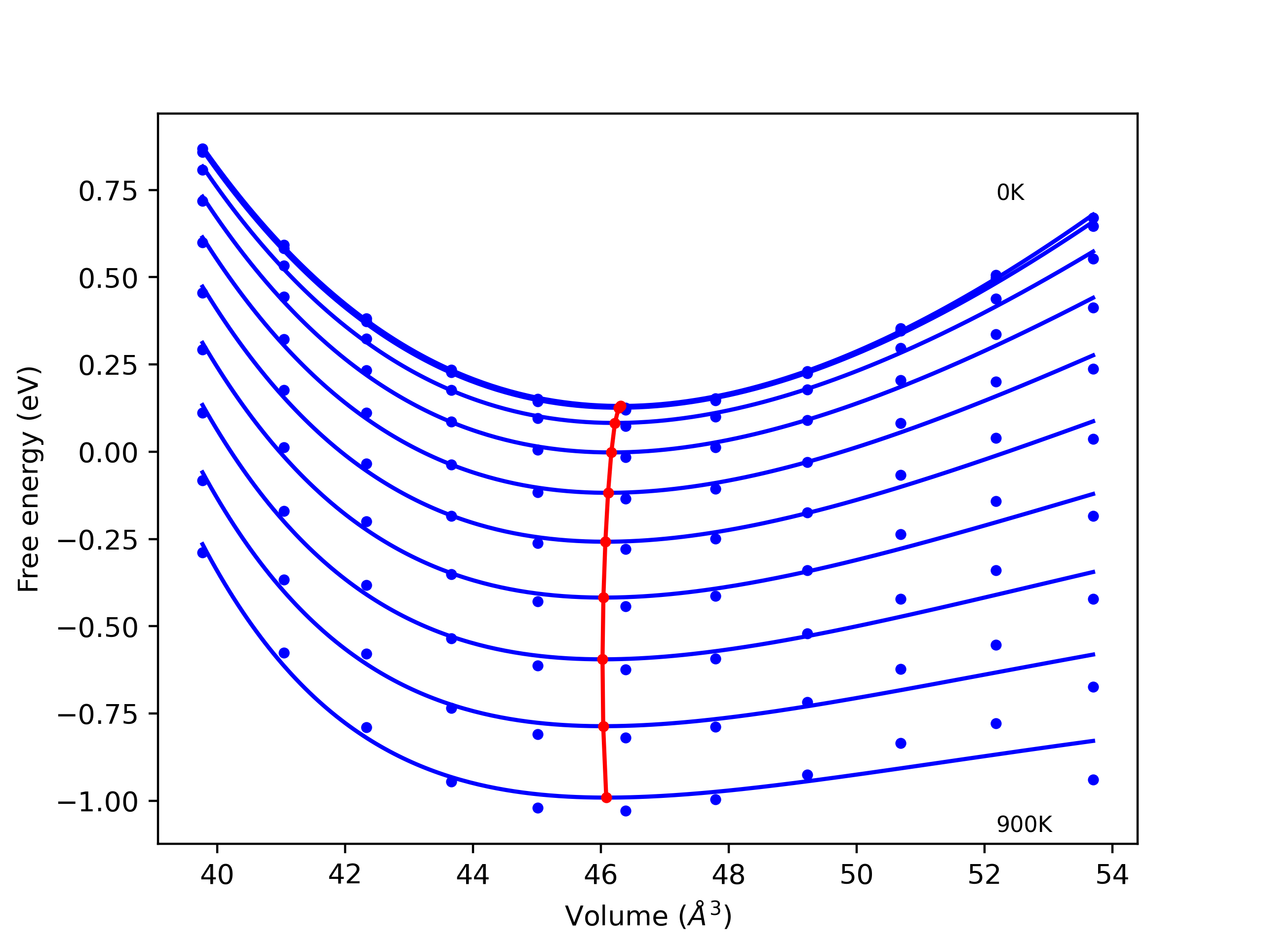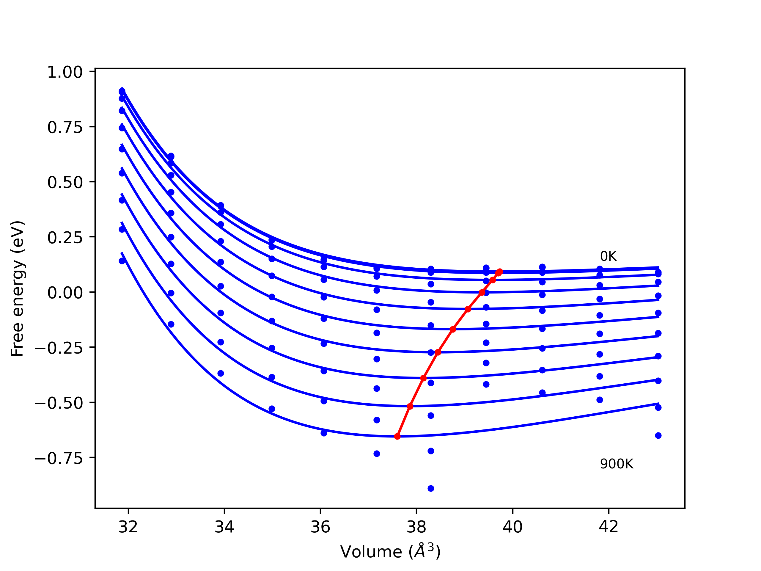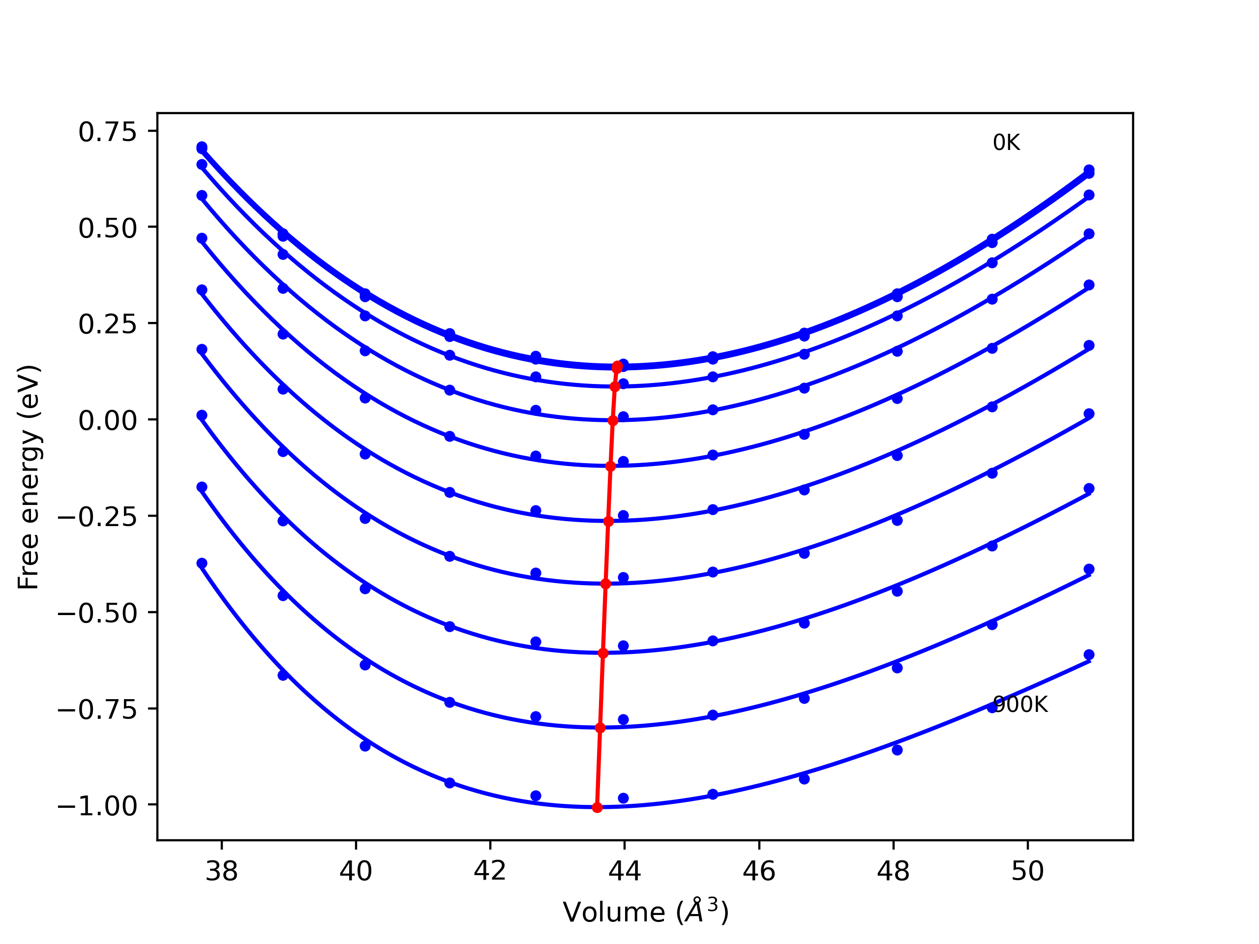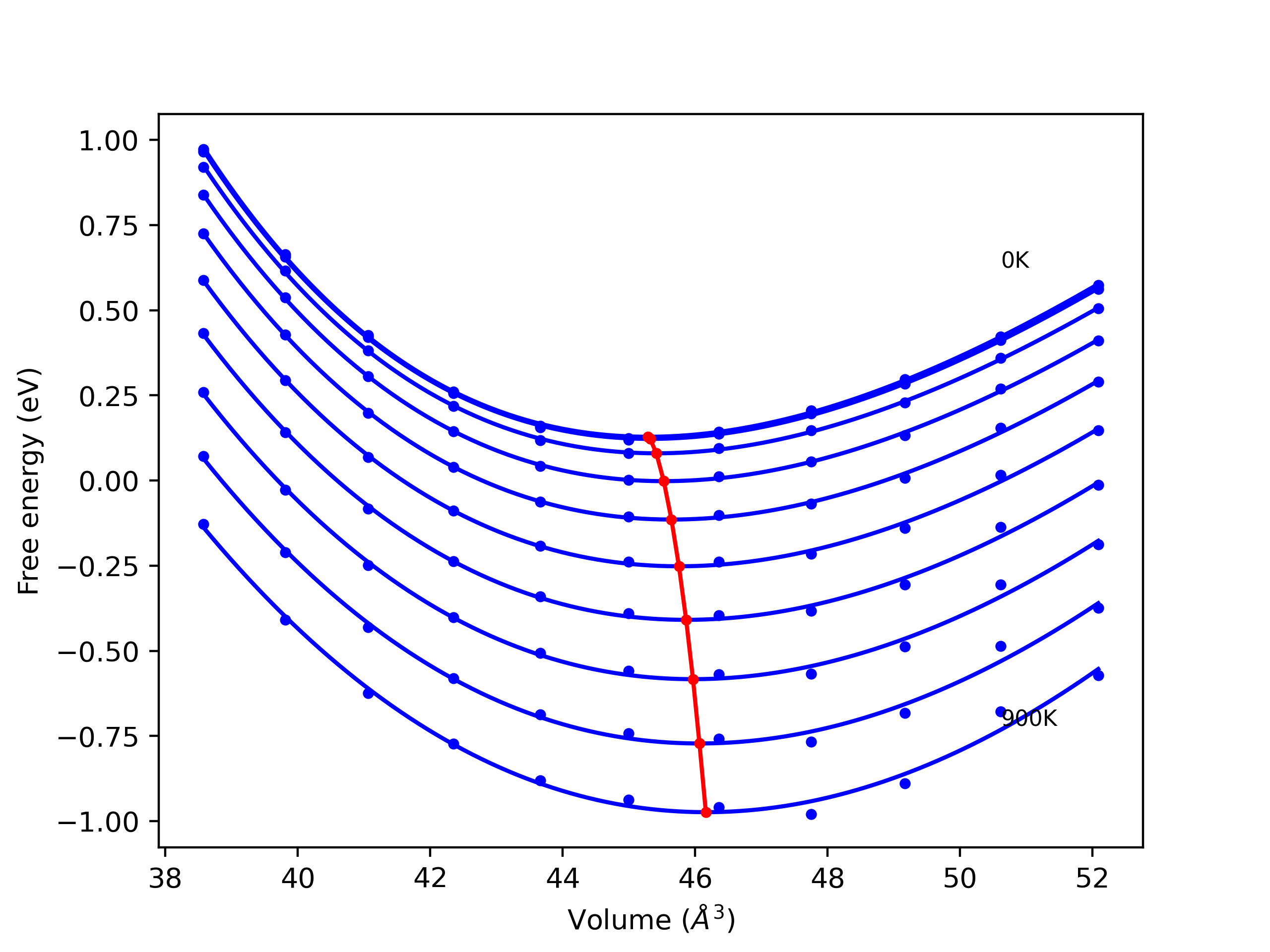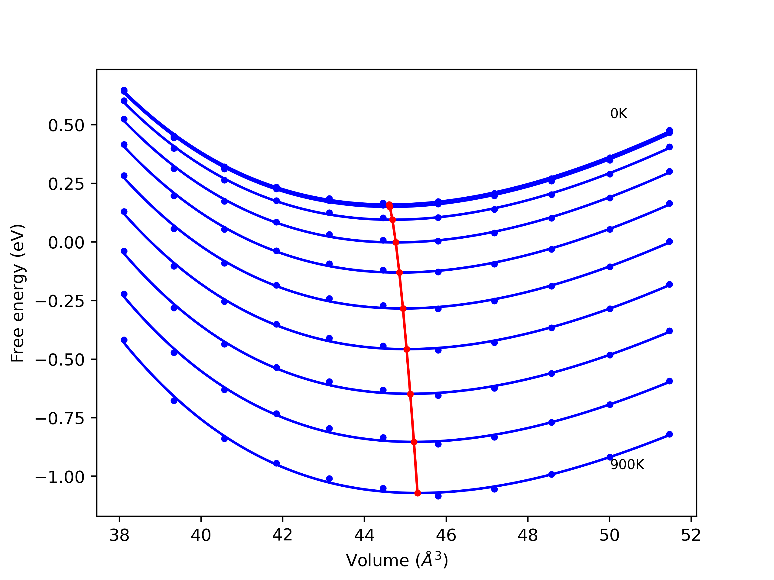 Plots of lattice and elastic constants are shown as a function of temperature. The 0K points were taken from the Crystal Structure Predictions and the Elastic Constants Predictions sections above for the unique crystal structures relaxed with the "dynamic" method. Starting from the 0 K relaxed crystal unit cells, supercell systems are created by replicating all three dimensions by the same multiplier to achieve at least 4000 atoms. The systems are then relaxed at 50 K and zero pressure using 1 million NPT steps. Lattice constants are estimated by averaging the measured box dimensions. Temperatures are iteratively increased by 50 K, with each subsequent relaxation calculation starting from the final atomic configuration at the previous temperature and relaxing for another 1 million steps.