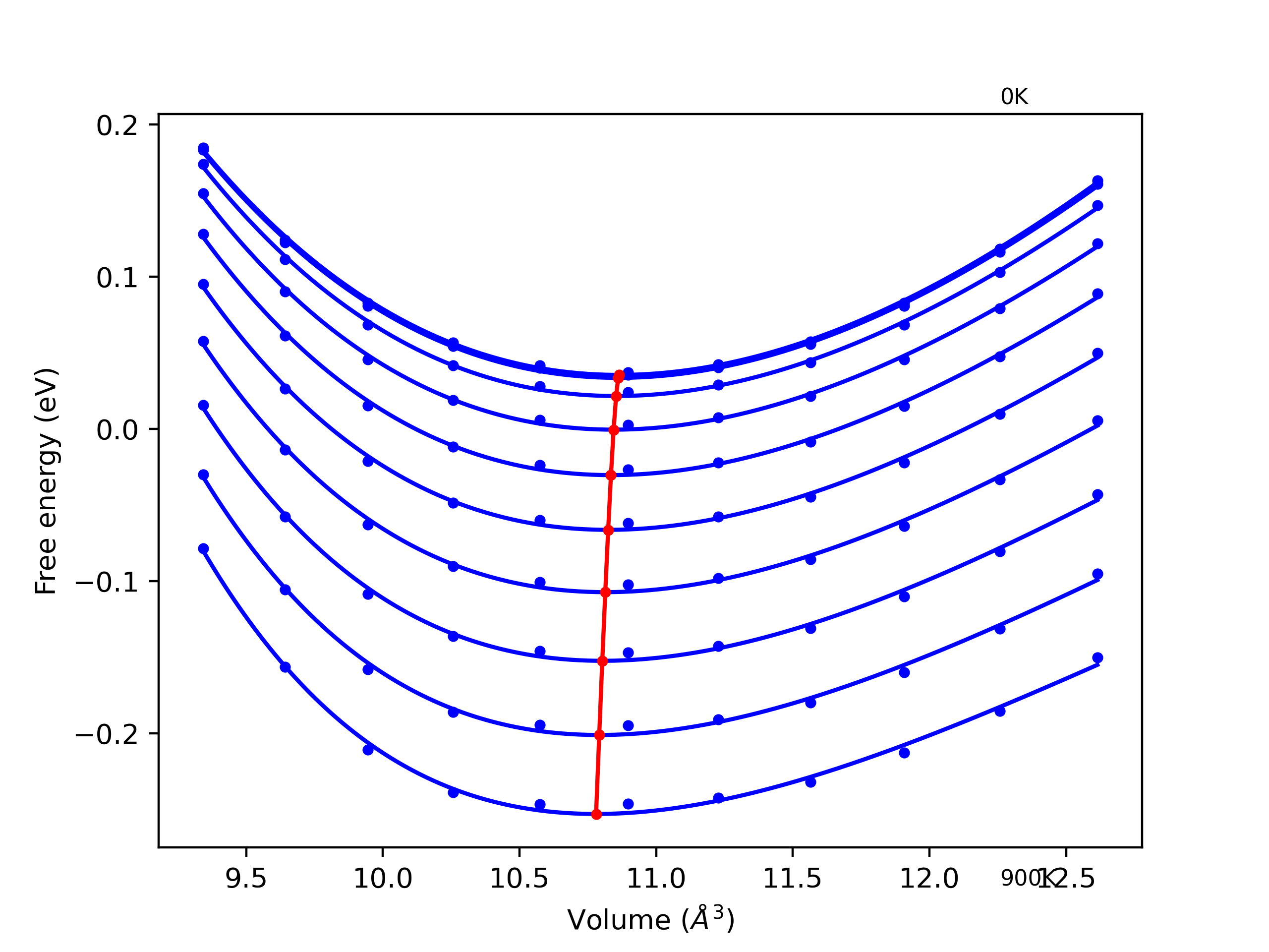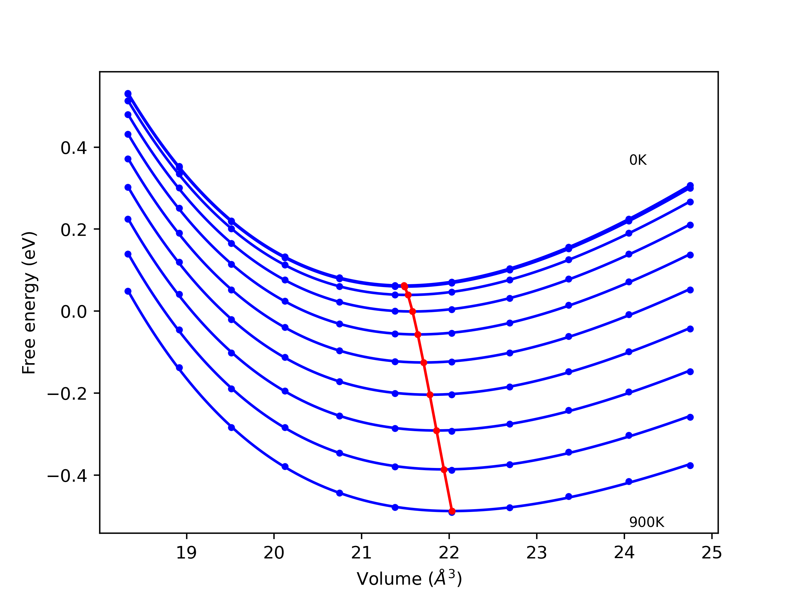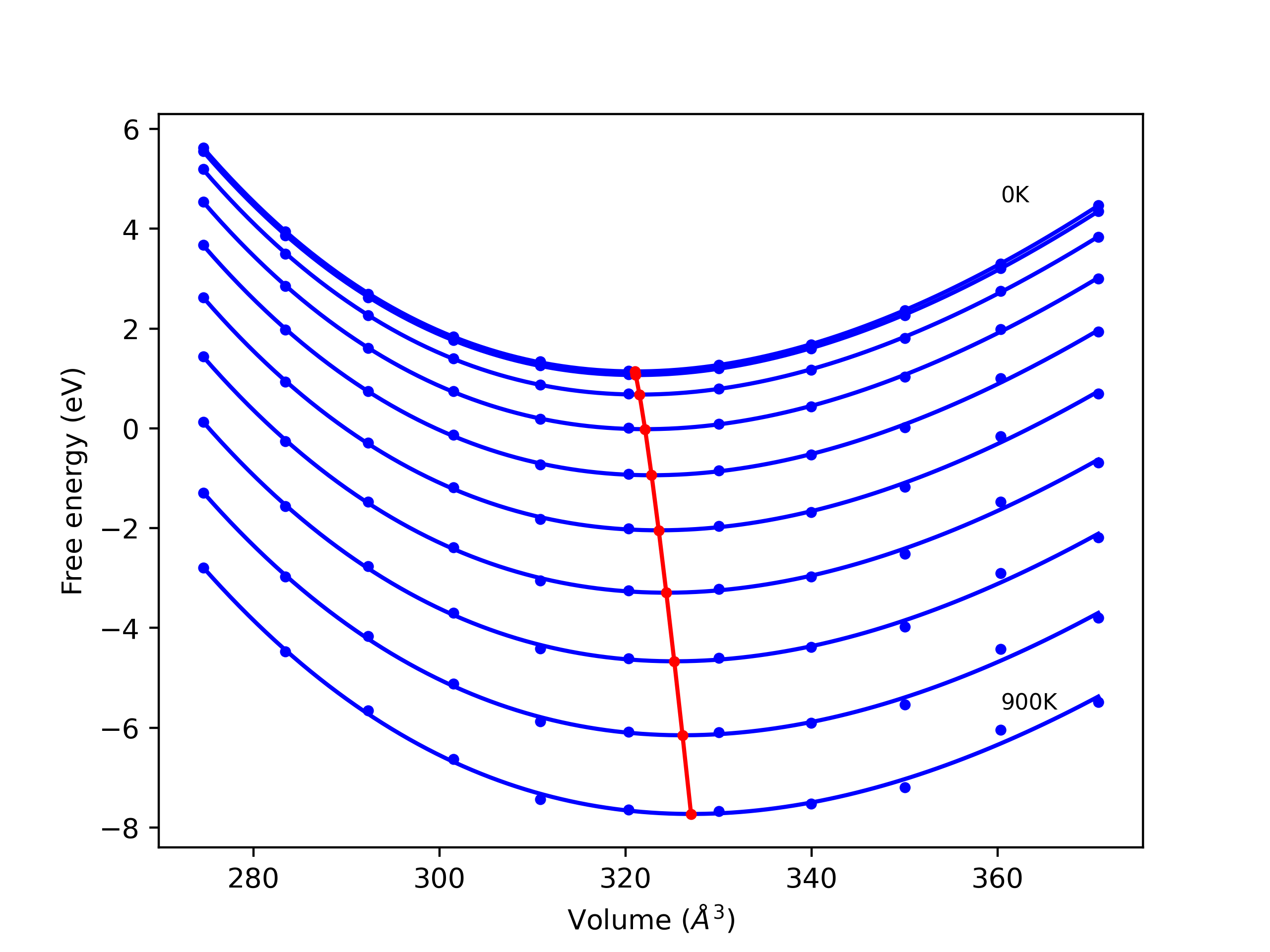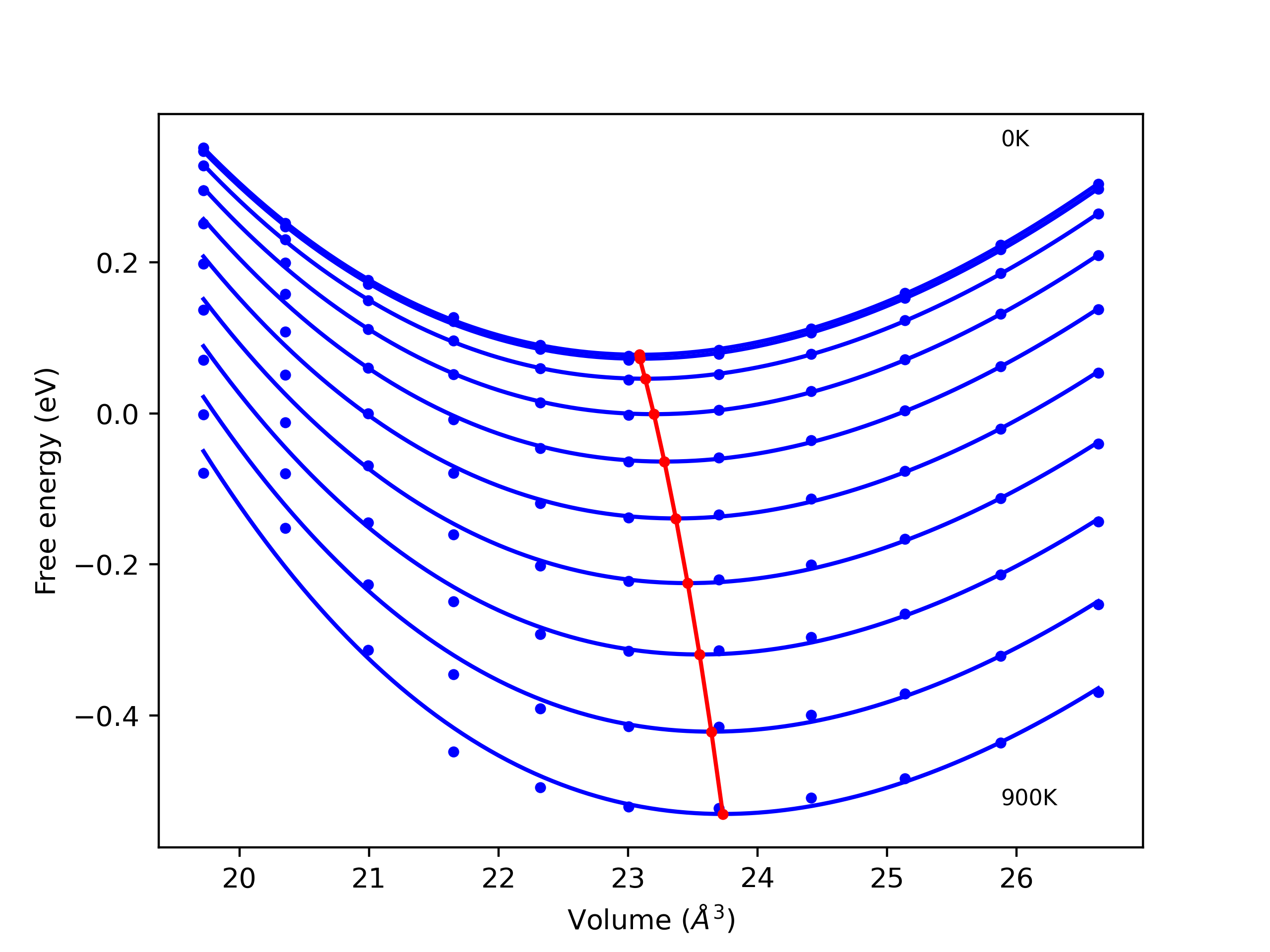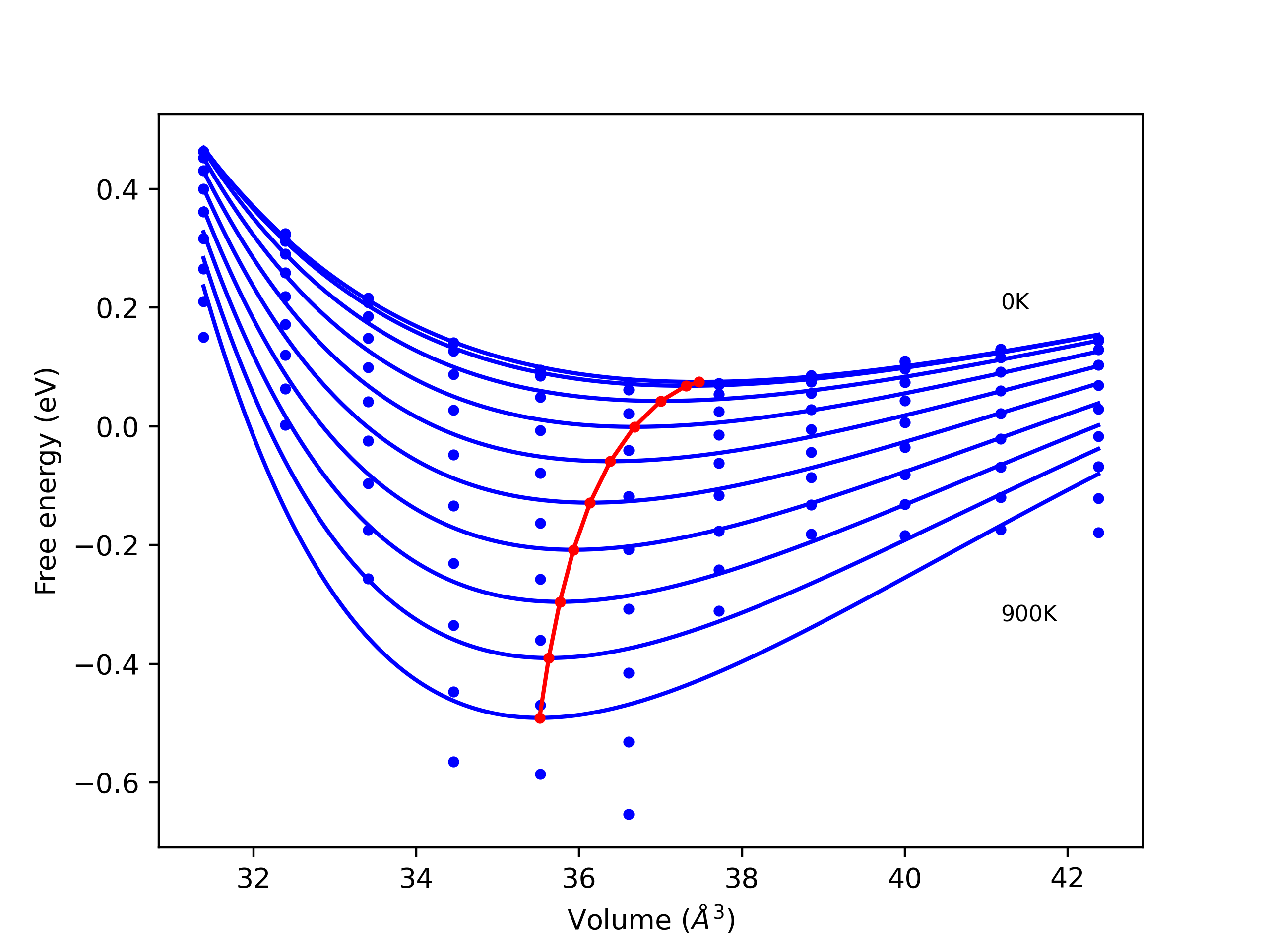 Plots of lattice and elastic constants are shown as a function of temperature. The 0K points were taken from the Crystal Structure Predictions and the Elastic Constants Predictions sections above for the unique crystal structures relaxed with the "dynamic" method. Starting from the 0 K relaxed crystal unit cells, supercell systems are created by replicating all three dimensions by the same multiplier to achieve at least 4000 atoms. The systems are then relaxed at 50 K and zero pressure using 1 million NPT steps. Lattice constants are estimated by averaging the measured box dimensions. Temperatures are iteratively increased by 50 K, with each subsequent relaxation calculation starting from the final atomic configuration at the previous temperature and relaxing for another 1 million steps.