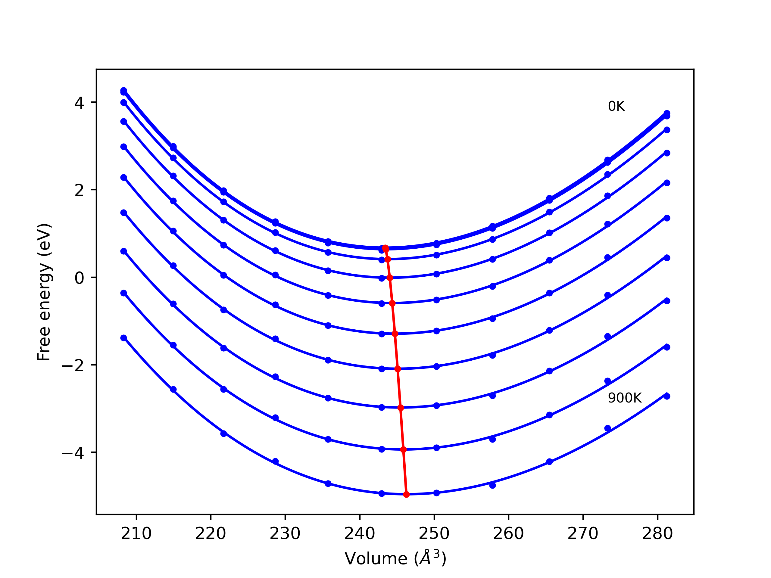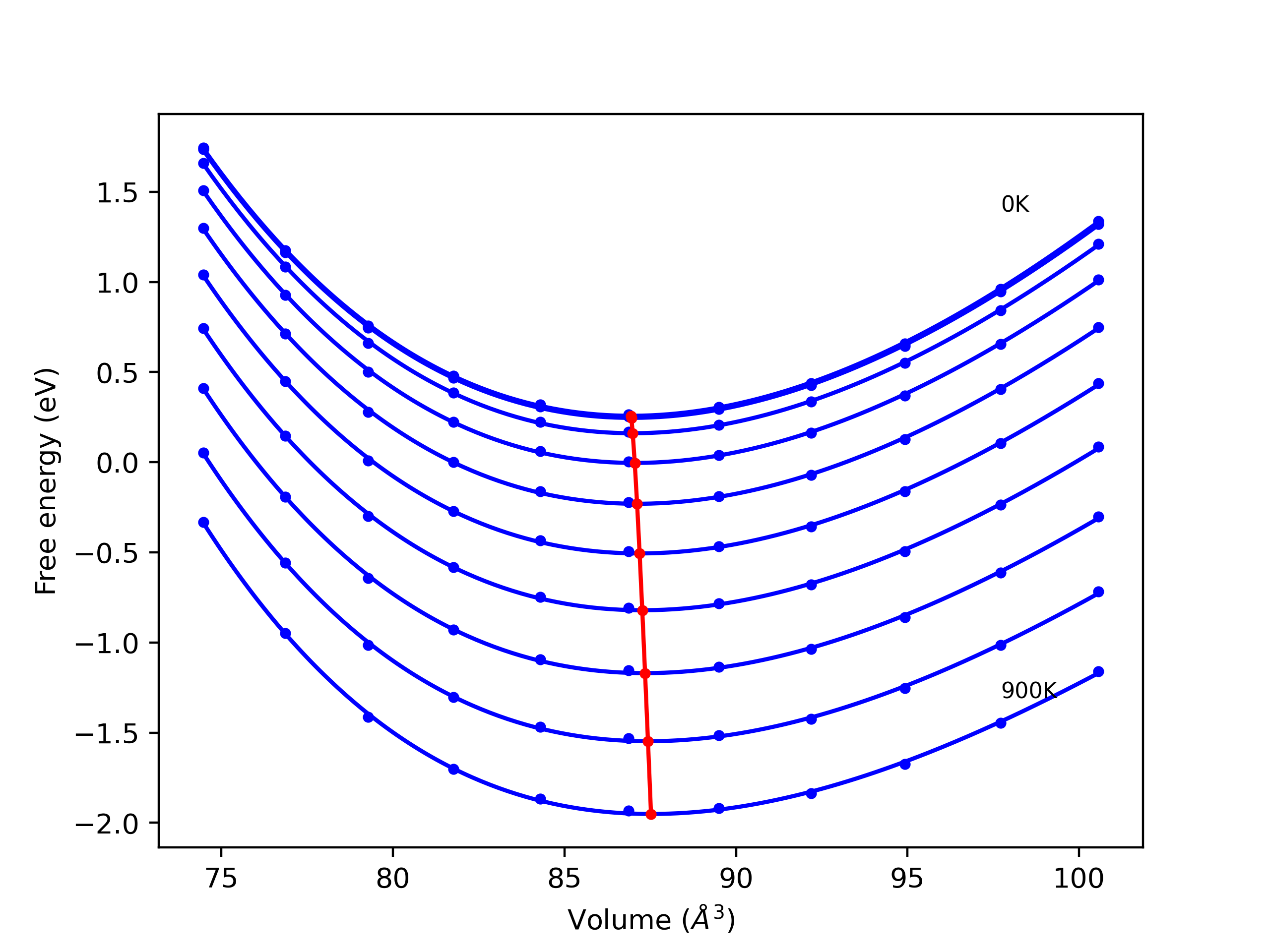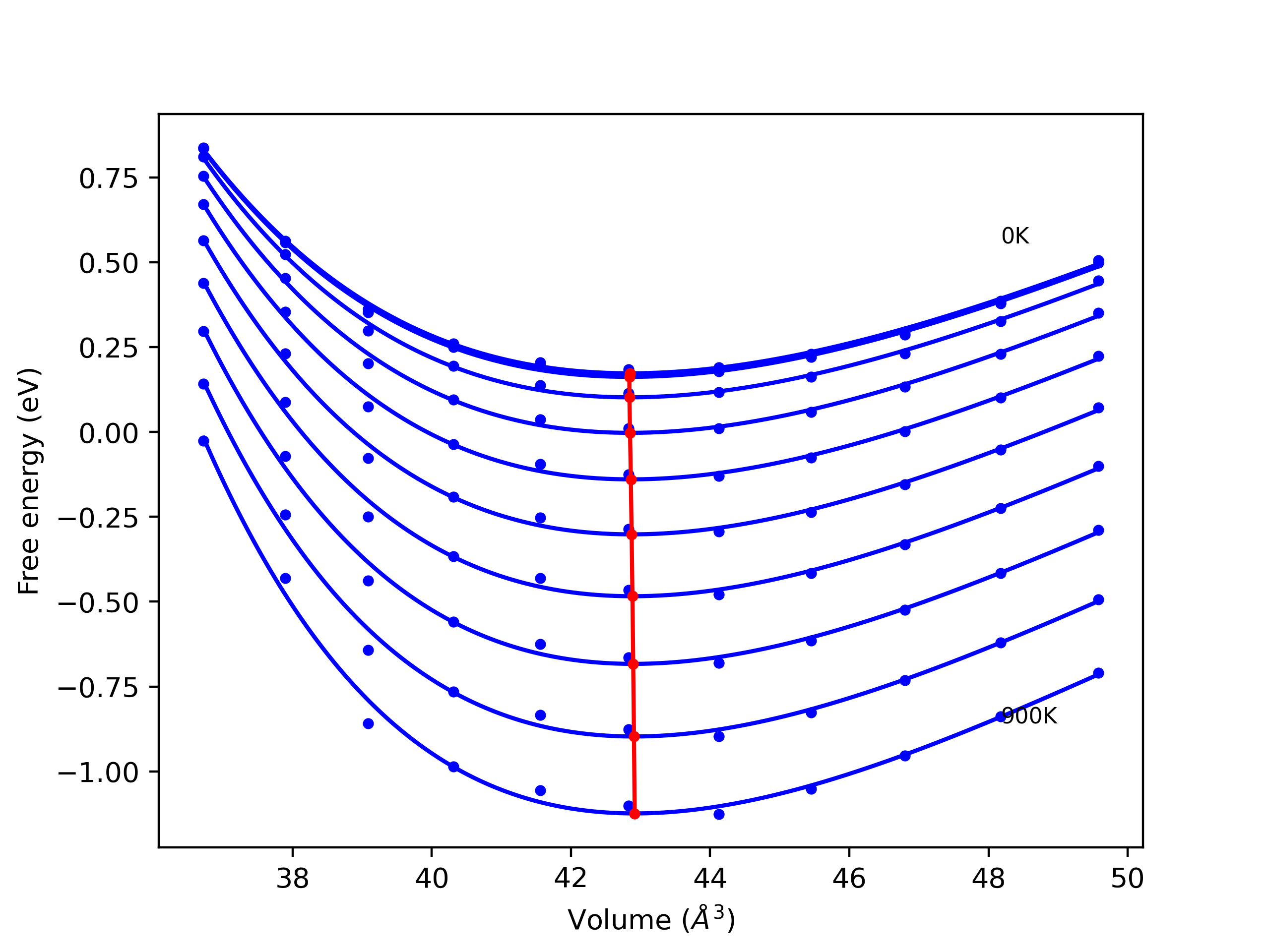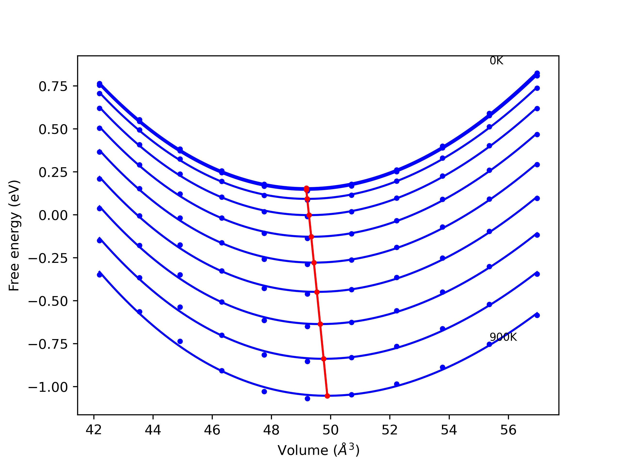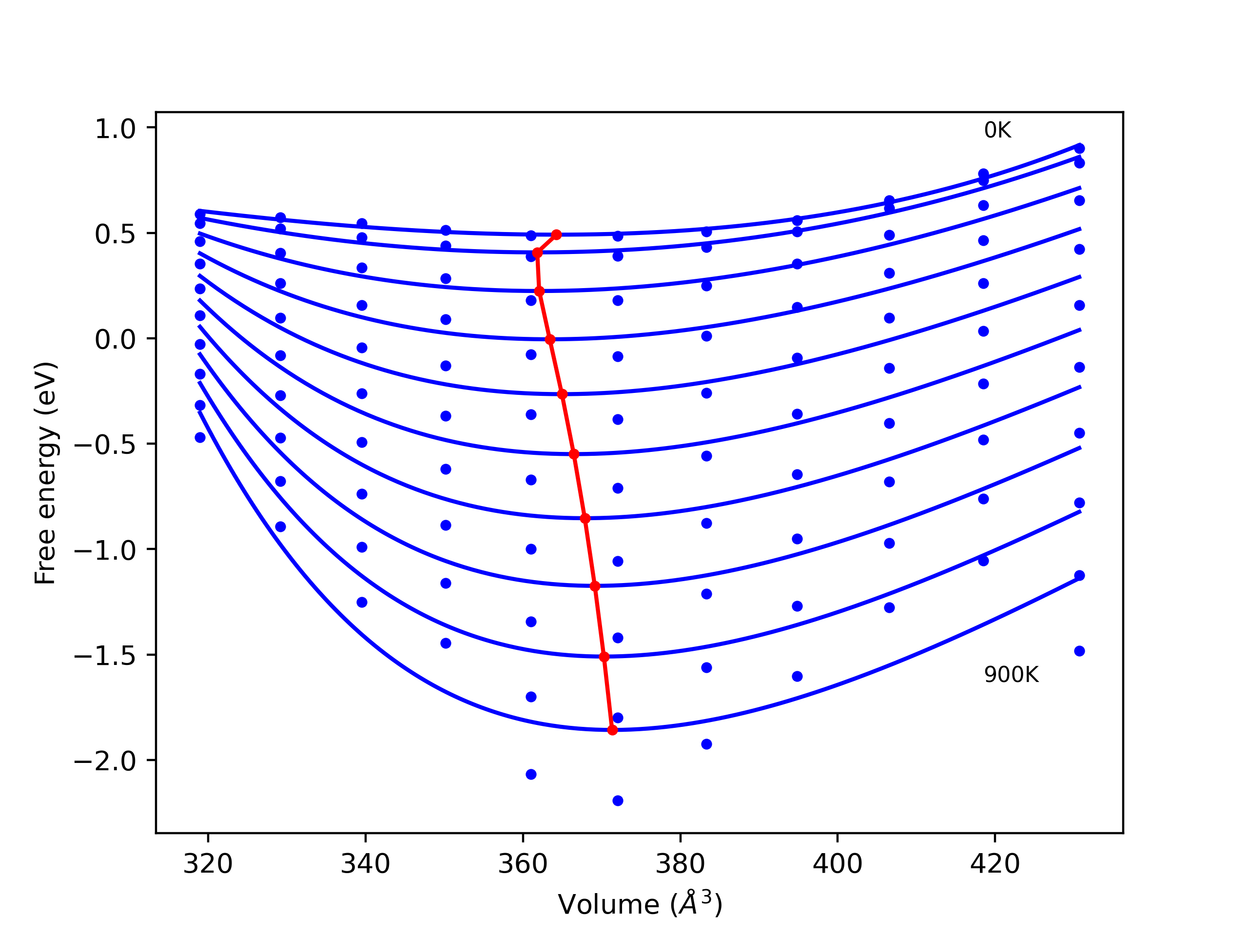 Plots of lattice and elastic constants are shown as a function of temperature. The 0K points were taken from the Crystal Structure Predictions and the Elastic Constants Predictions sections above for the unique crystal structures relaxed with the "dynamic" method. Starting from the 0 K relaxed crystal unit cells, supercell systems are created by replicating all three dimensions by the same multiplier to achieve at least 4000 atoms. The systems are then relaxed at 50 K and zero pressure using 1 million NPT steps. Lattice constants are estimated by averaging the measured box dimensions. Temperatures are iteratively increased by 50 K, with each subsequent relaxation calculation starting from the final atomic configuration at the previous temperature and relaxing for another 1 million steps.