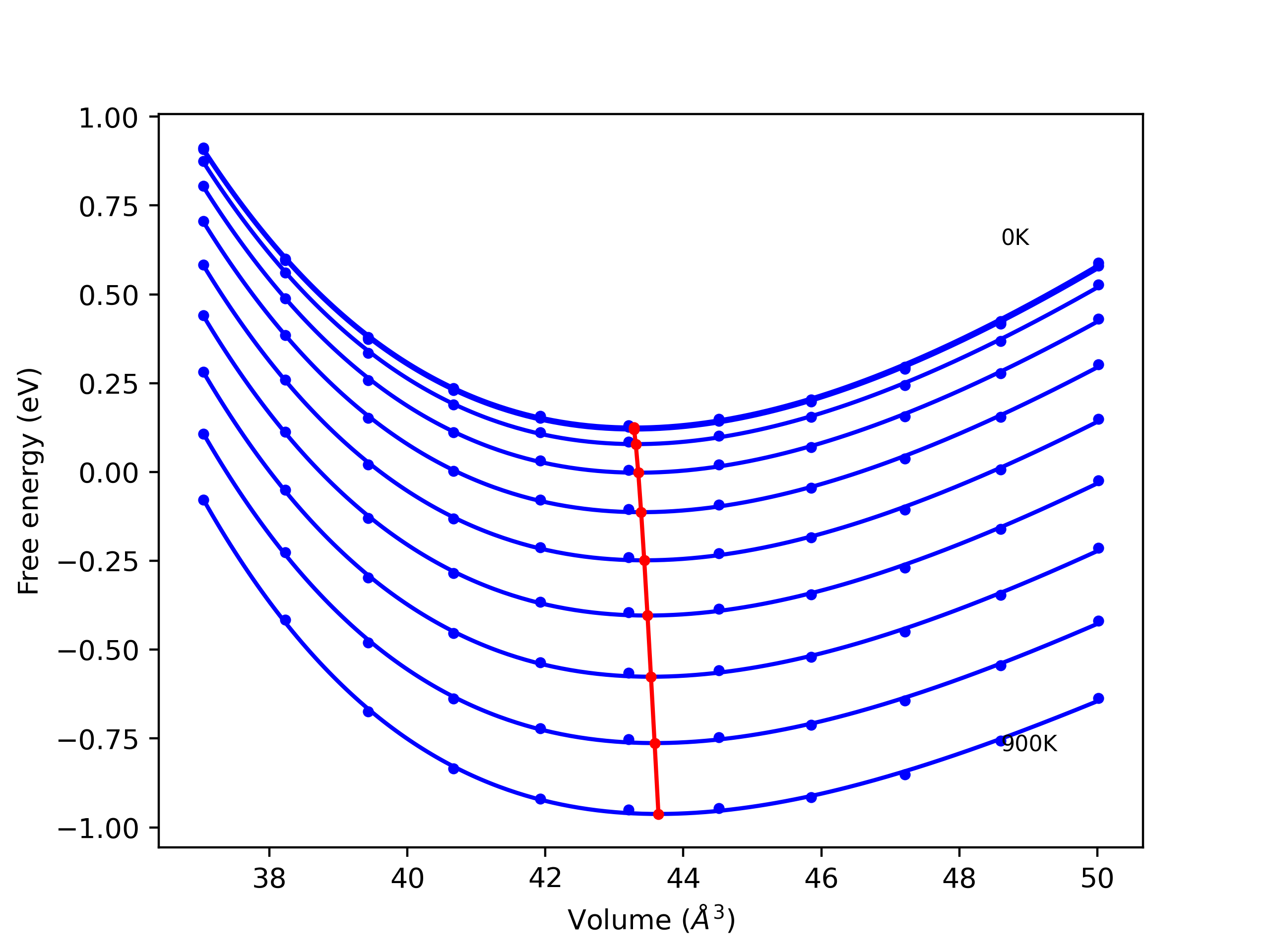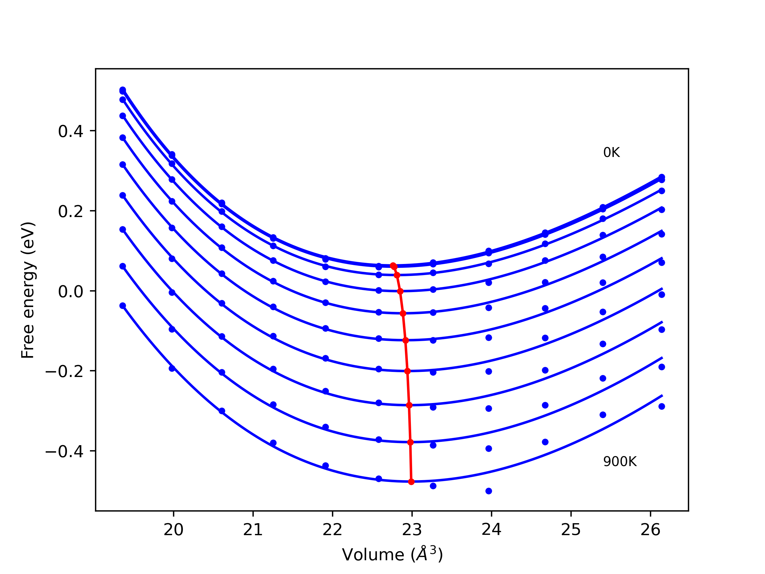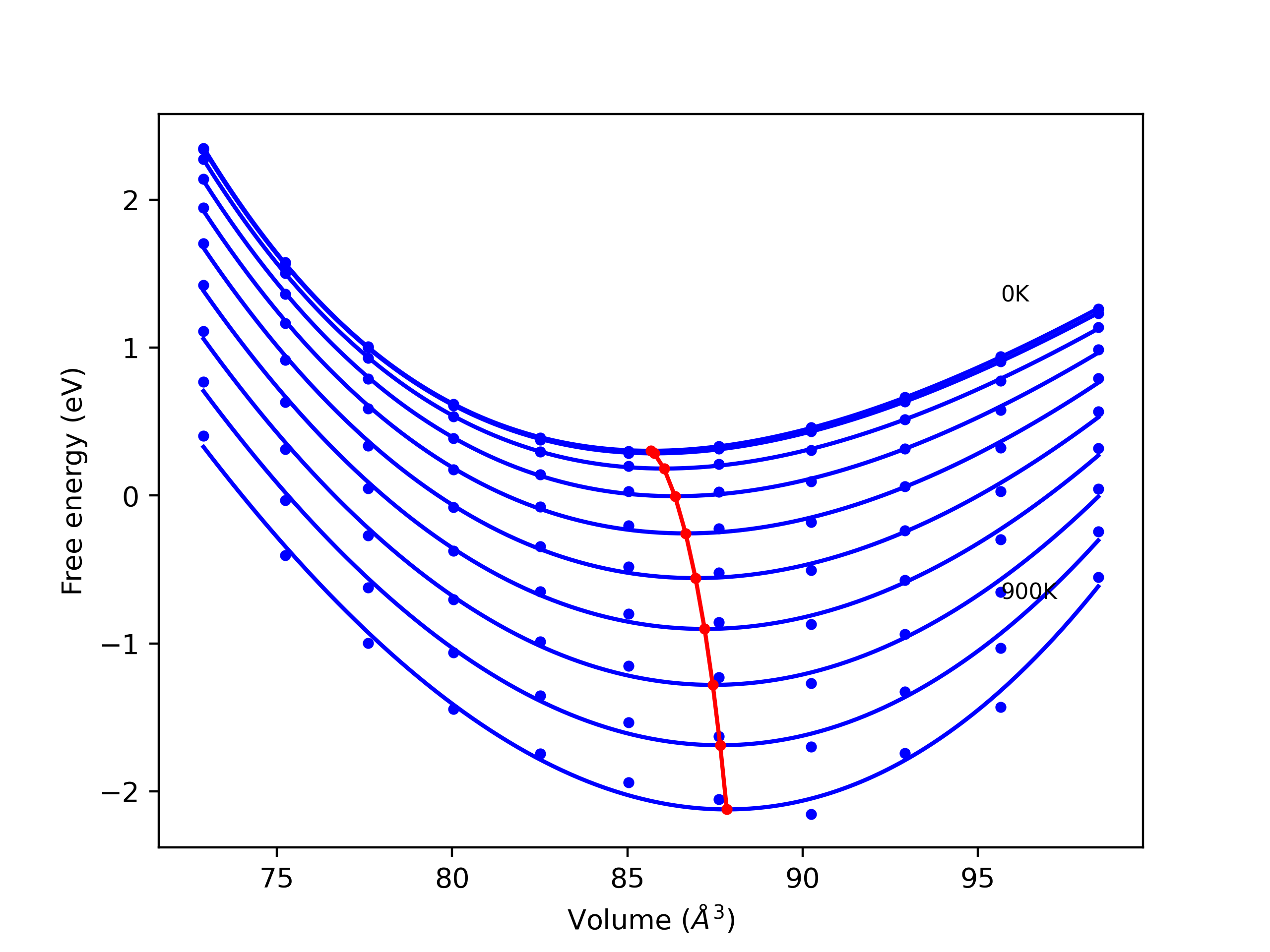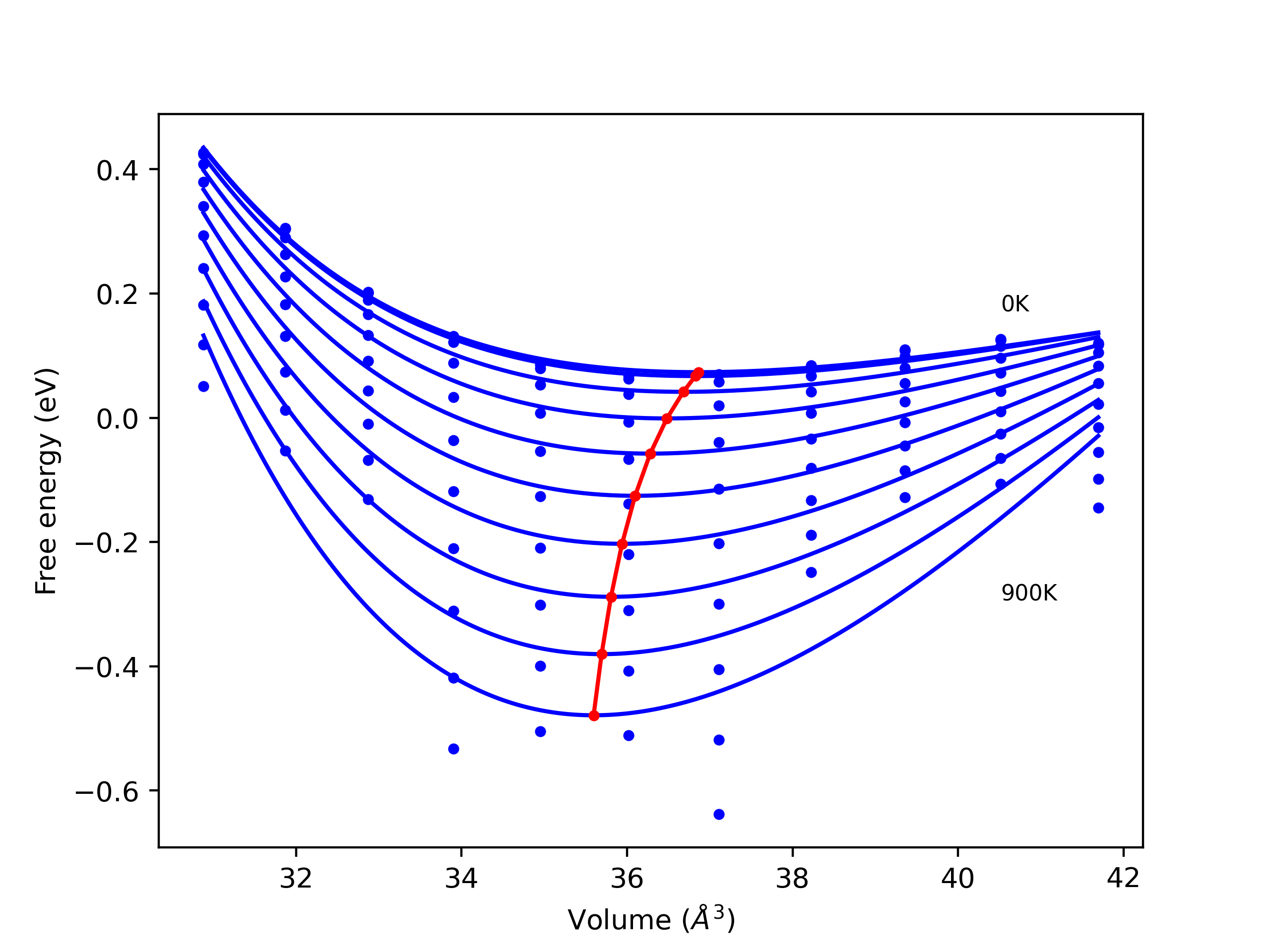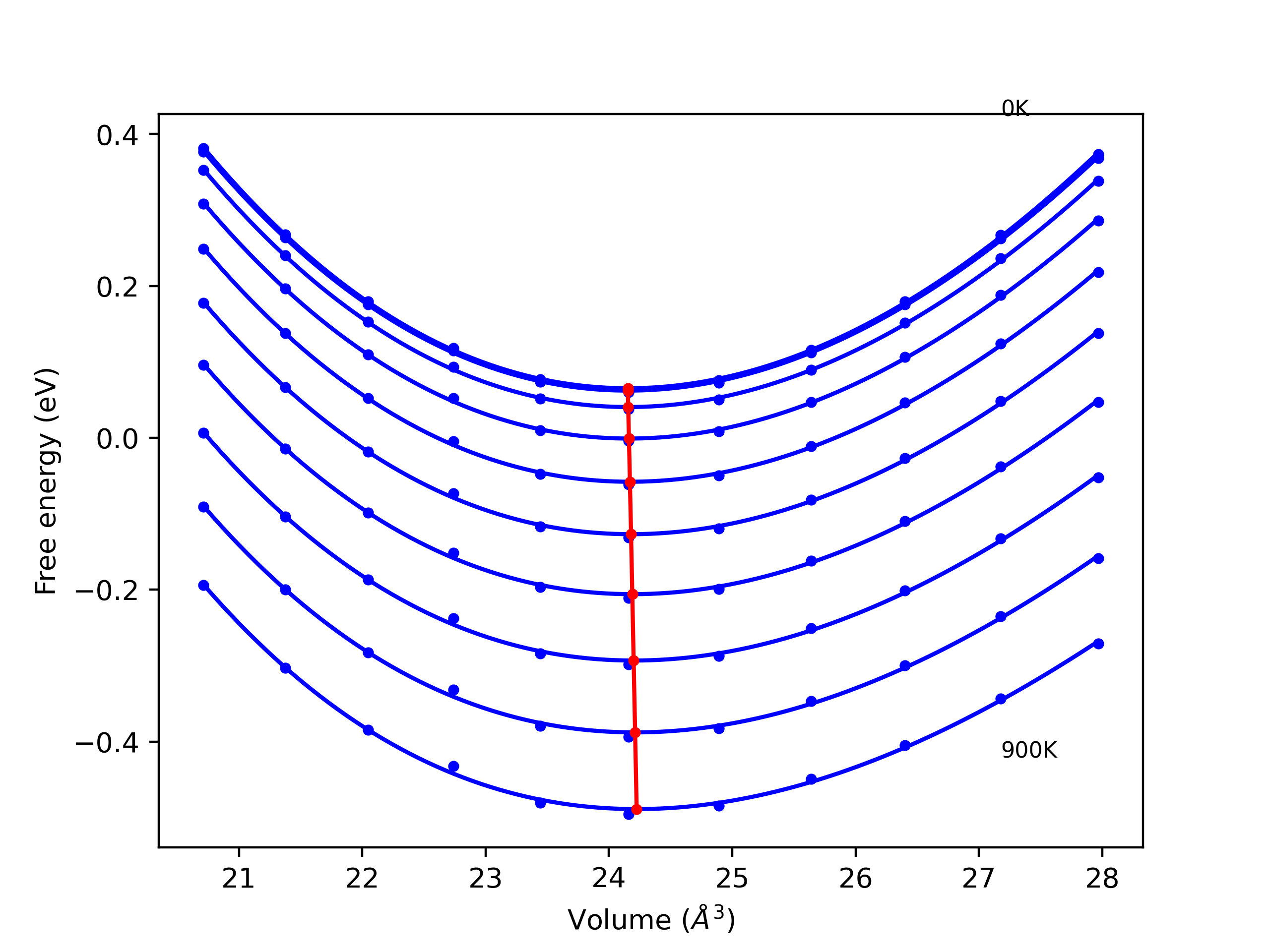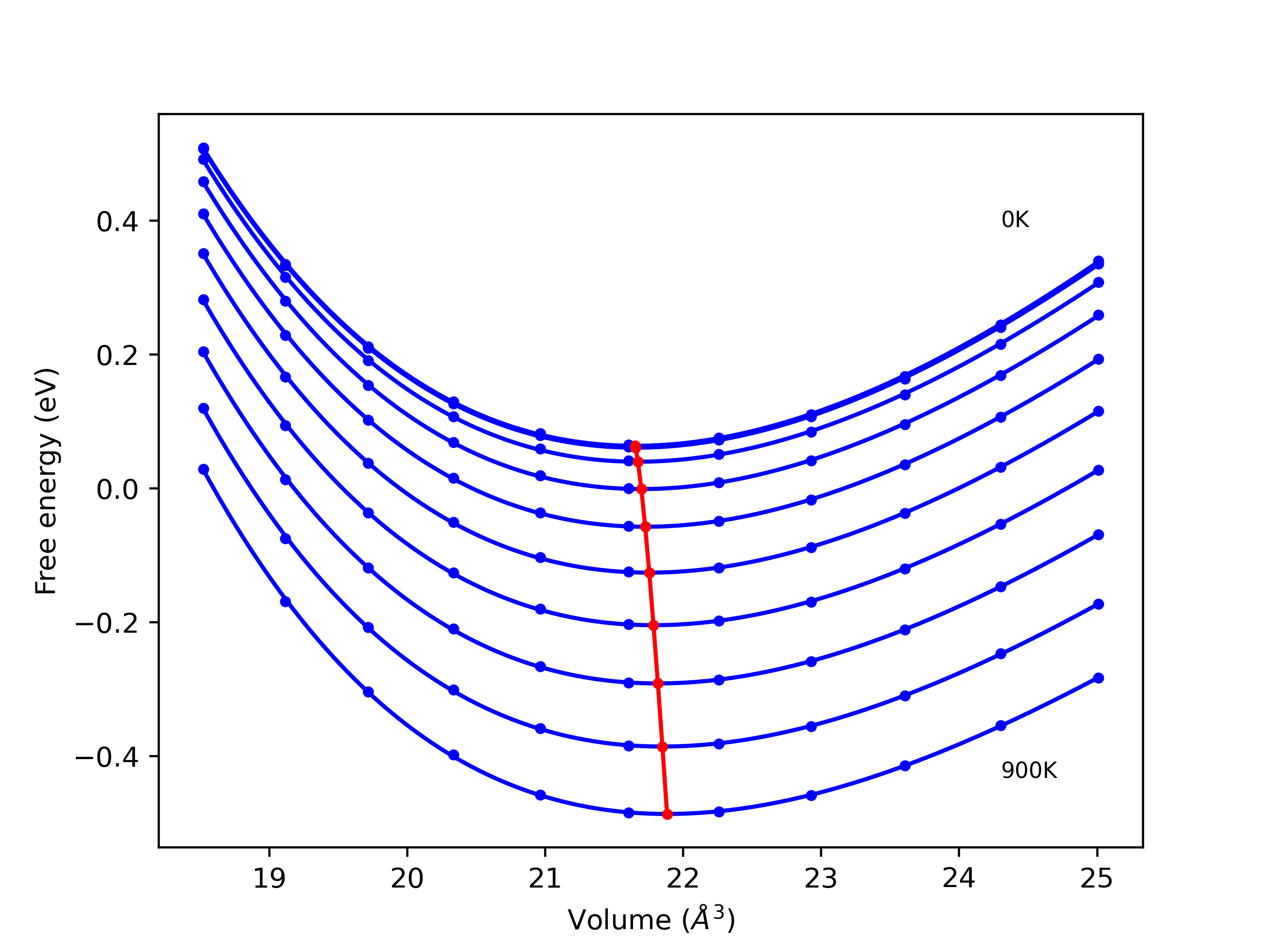 Plots of lattice and elastic constants are shown as a function of temperature. The 0K points were taken from the Crystal Structure Predictions and the Elastic Constants Predictions sections above for the unique crystal structures relaxed with the "dynamic" method. Starting from the 0 K relaxed crystal unit cells, supercell systems are created by replicating all three dimensions by the same multiplier to achieve at least 4000 atoms. The systems are then relaxed at 50 K and zero pressure using 1 million NPT steps. Lattice constants are estimated by averaging the measured box dimensions. Temperatures are iteratively increased by 50 K, with each subsequent relaxation calculation starting from the final atomic configuration at the previous temperature and relaxing for another 1 million steps.