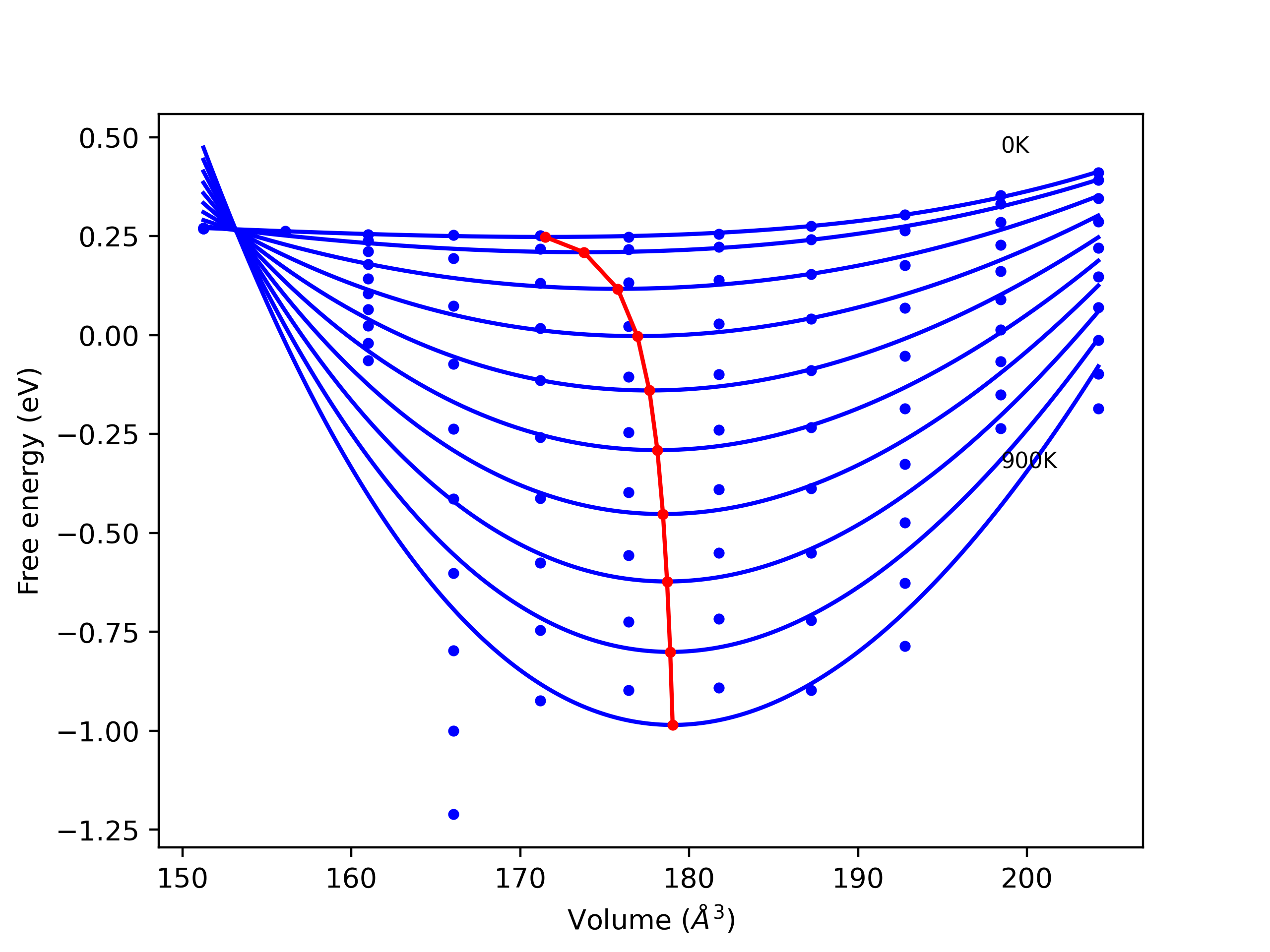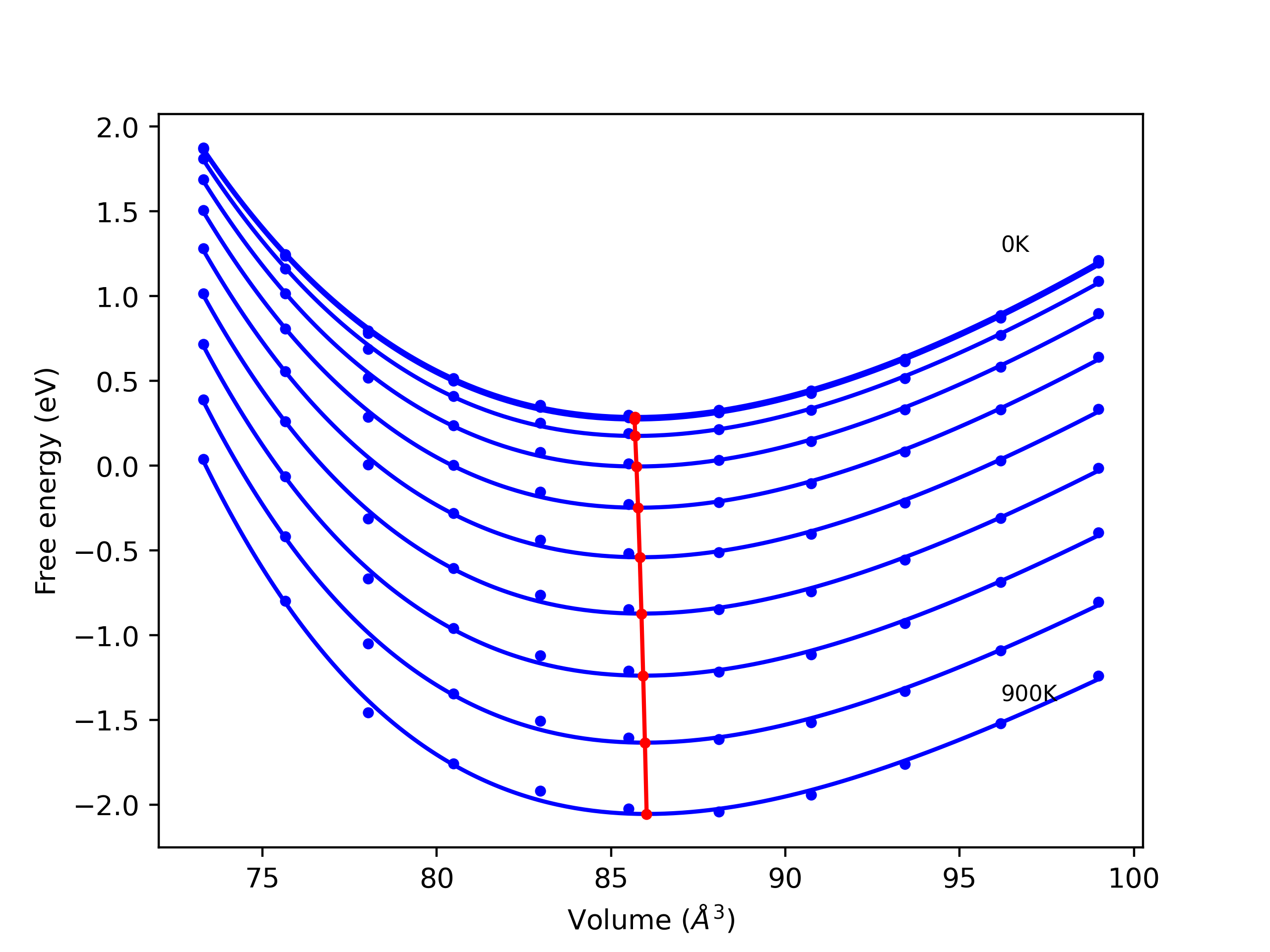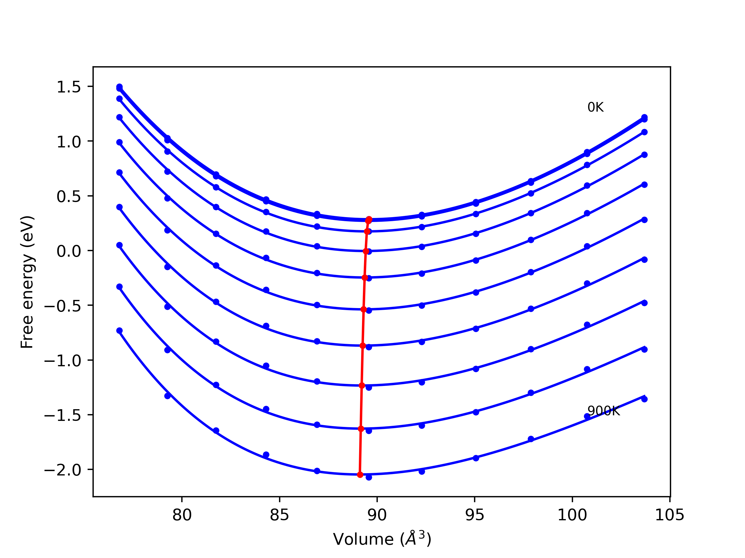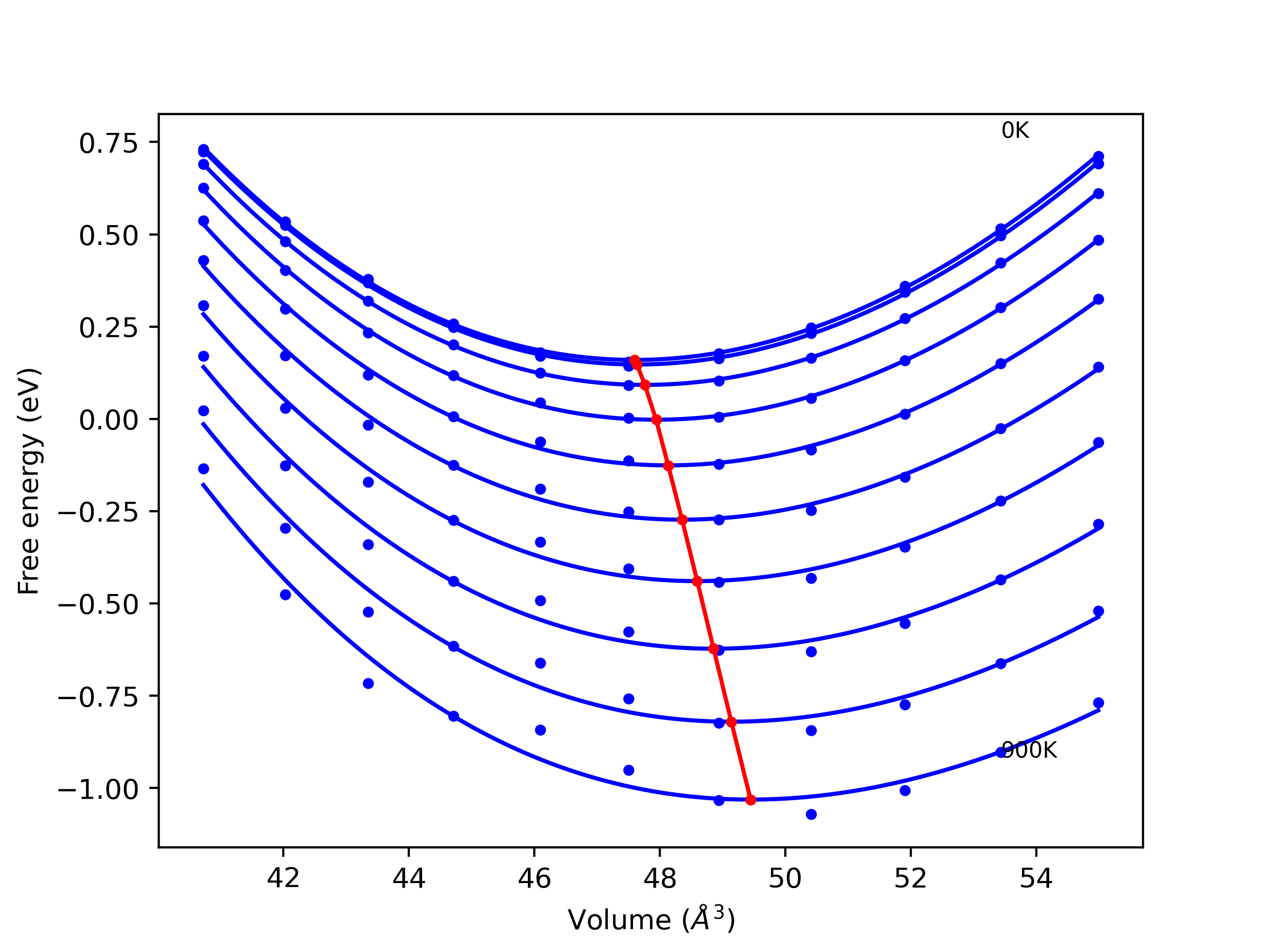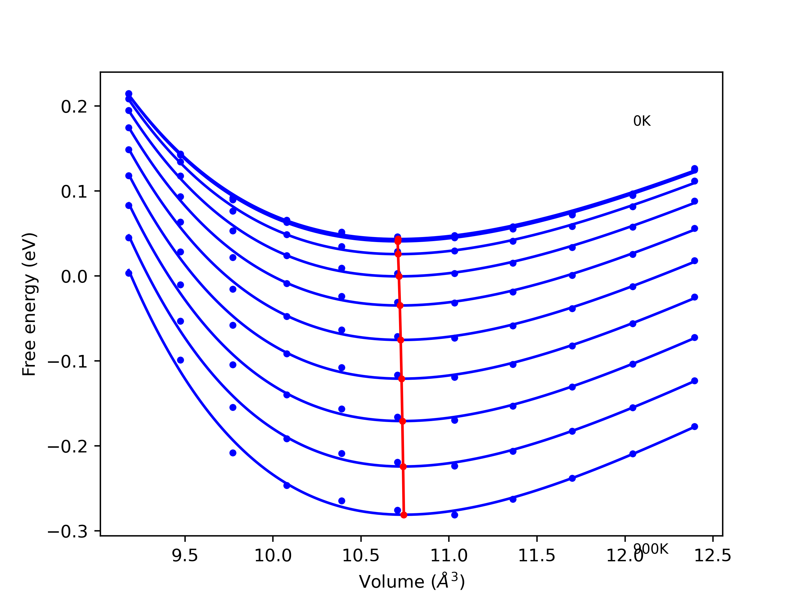 Plots of lattice and elastic constants are shown as a function of temperature. The 0K points were taken from the Crystal Structure Predictions and the Elastic Constants Predictions sections above for the unique crystal structures relaxed with the "dynamic" method. Starting from the 0 K relaxed crystal unit cells, supercell systems are created by replicating all three dimensions by the same multiplier to achieve at least 4000 atoms. The systems are then relaxed at 50 K and zero pressure using 1 million NPT steps. Lattice constants are estimated by averaging the measured box dimensions. Temperatures are iteratively increased by 50 K, with each subsequent relaxation calculation starting from the final atomic configuration at the previous temperature and relaxing for another 1 million steps.